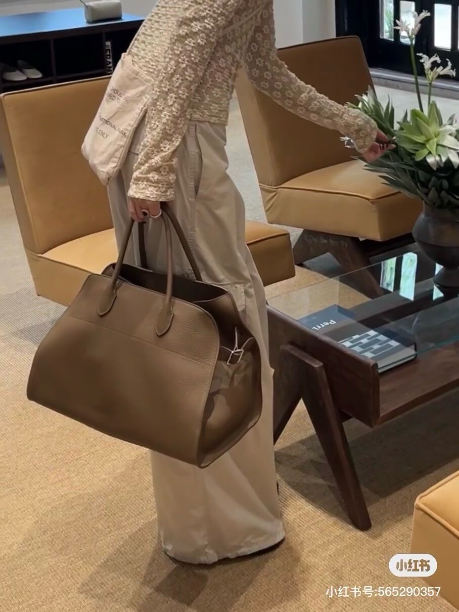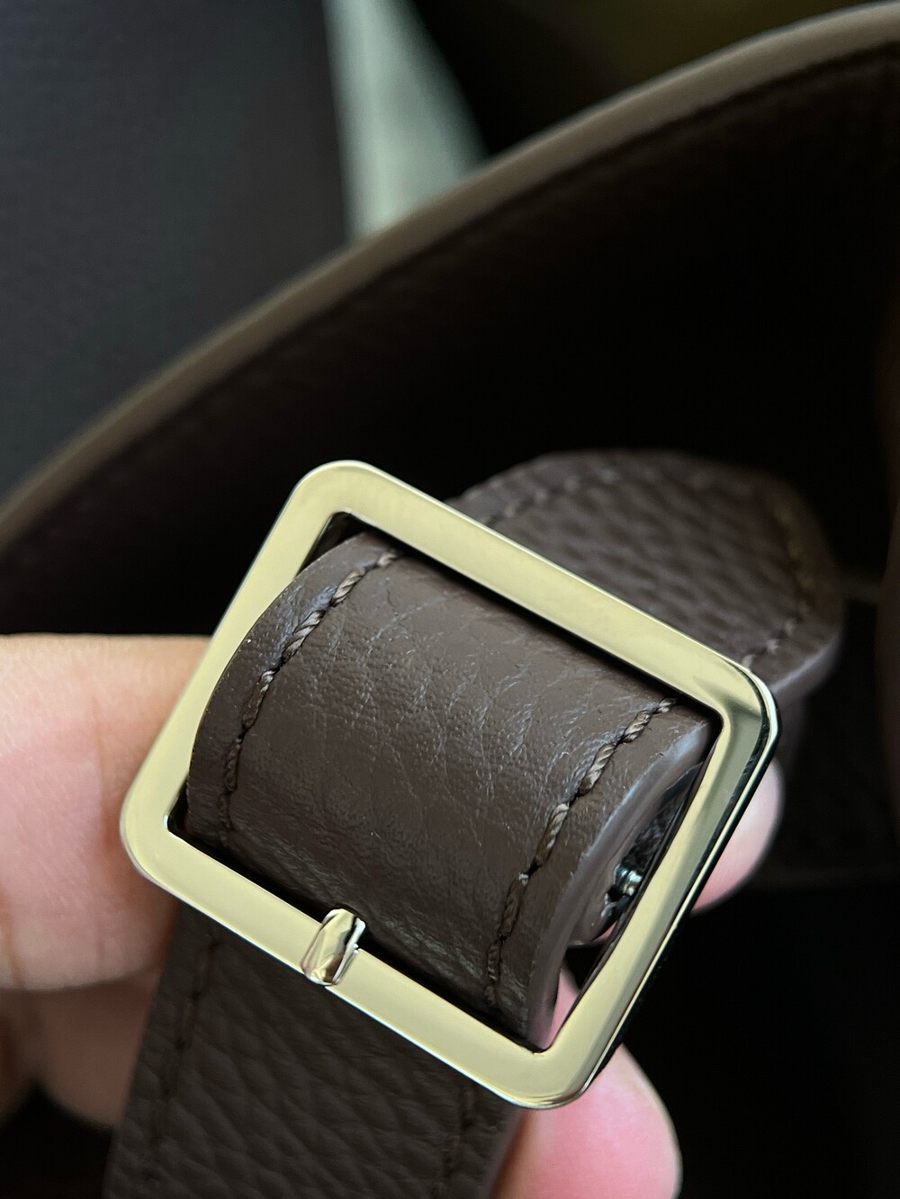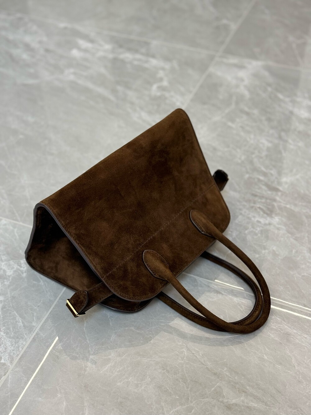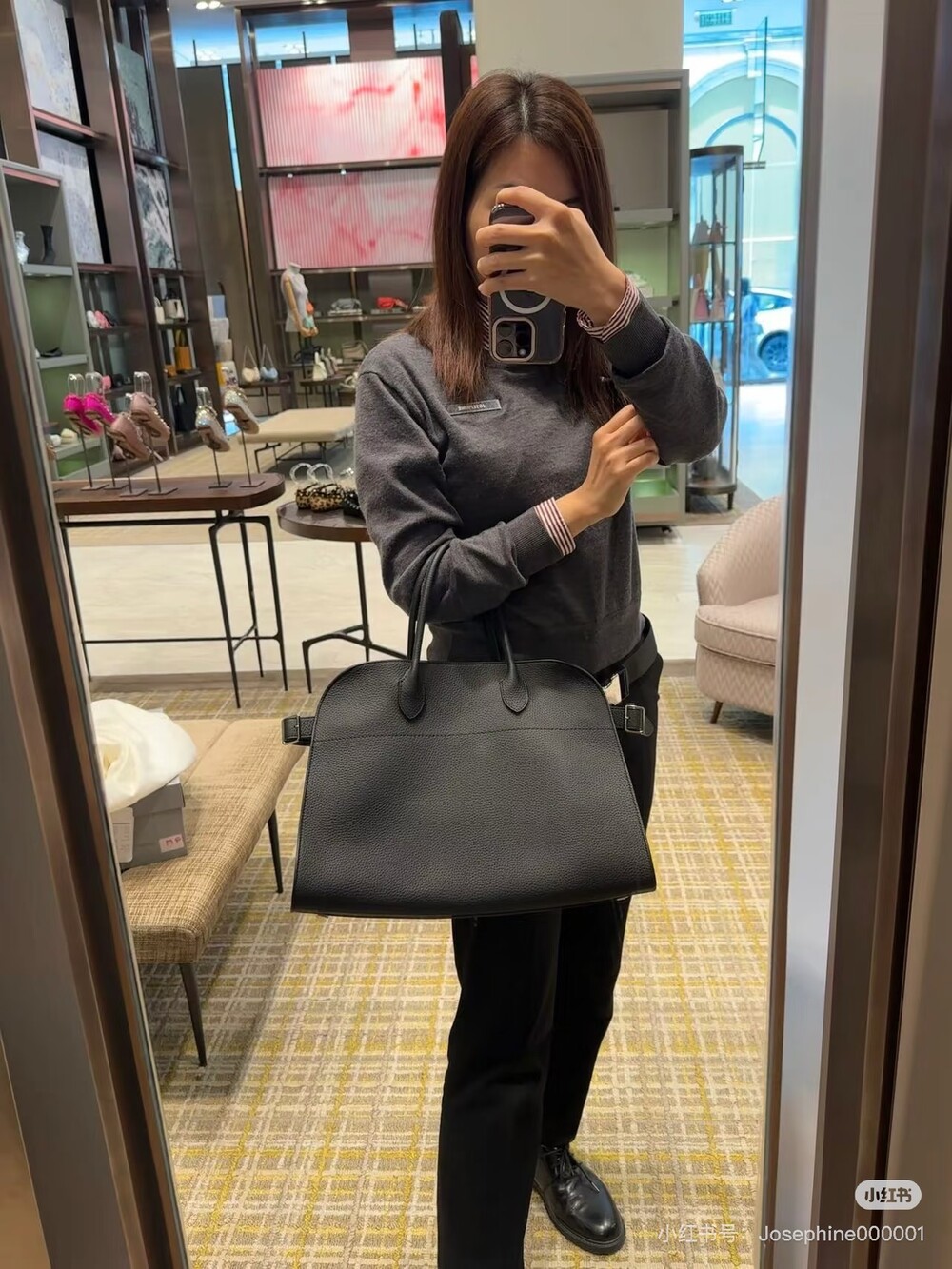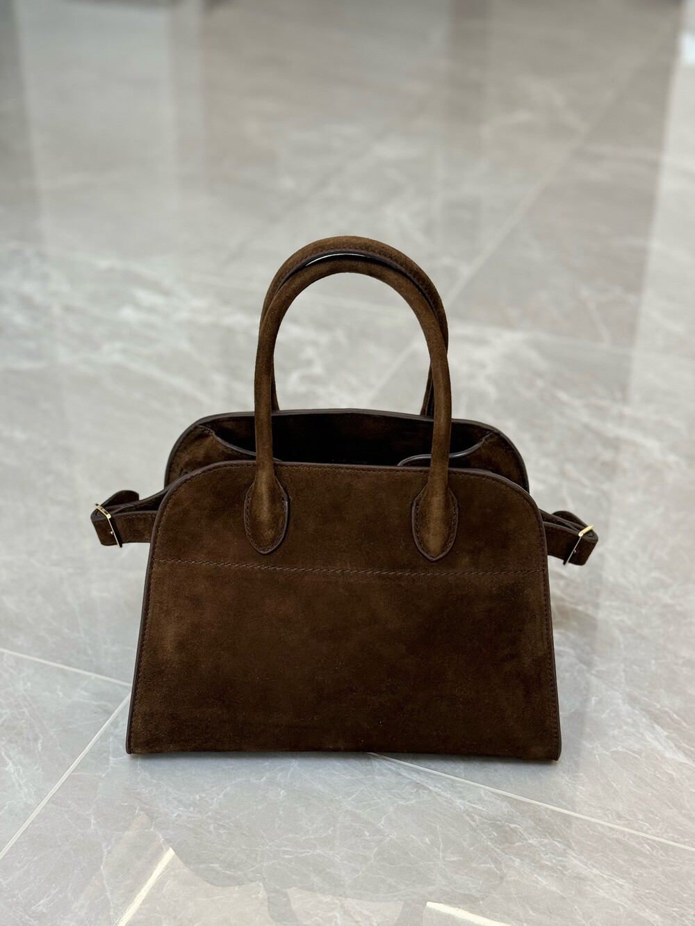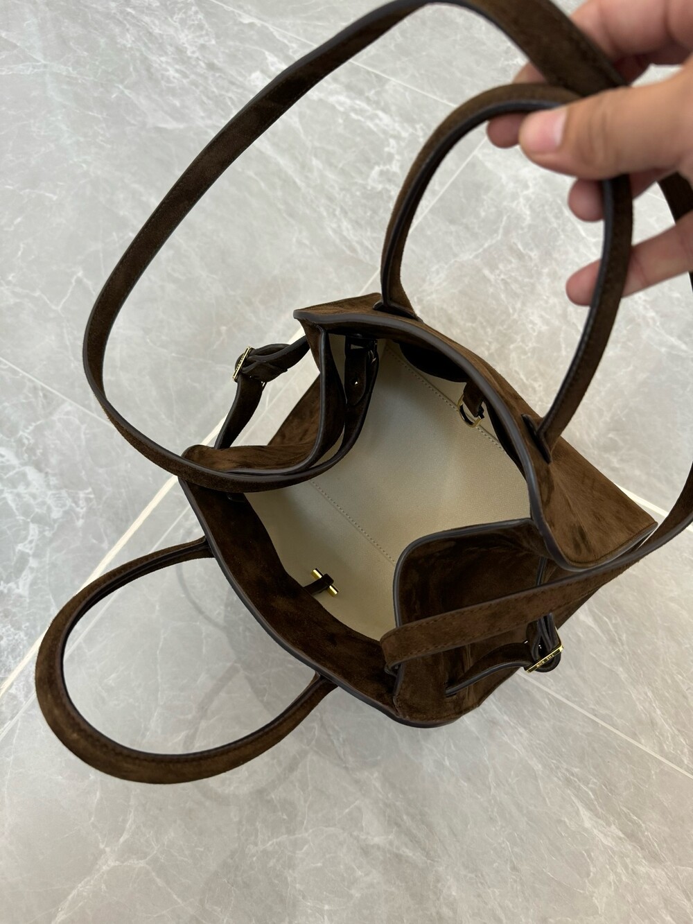 매트 그레인 카프스킨 가죽 소재의 소프트 스트럭처 탑 핸들 백. 벨트가 장식된 사이드 거싯 패널 및 내부 토글 클로저.