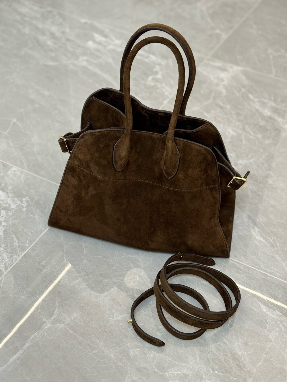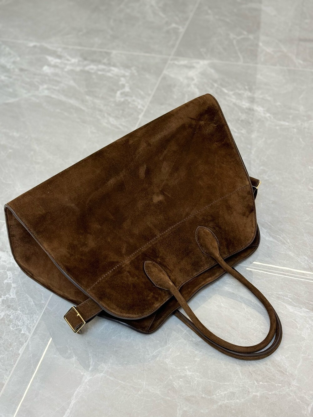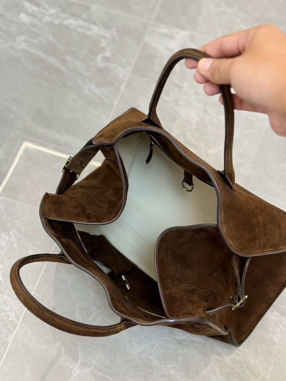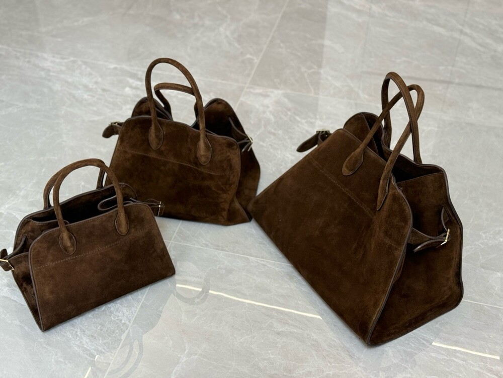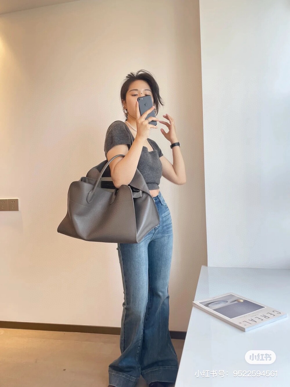 매트 그레인 카프스킨 가죽 소재의 소프트 스트럭처 탑 핸들 백. 벨트가 장식된 사이드 거싯 패널 및 내부 토글 클로저.