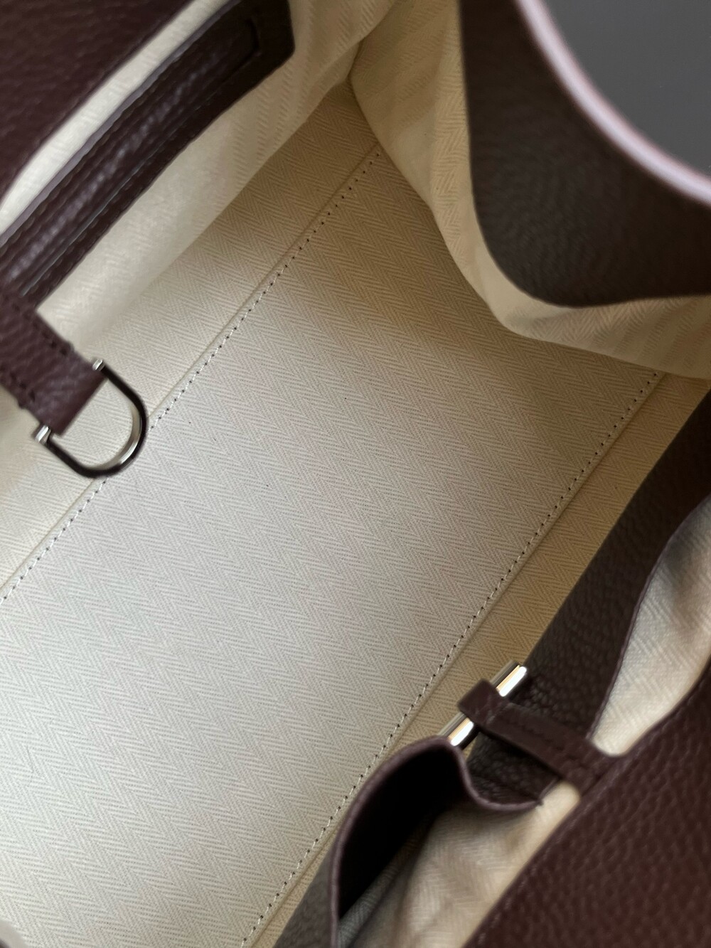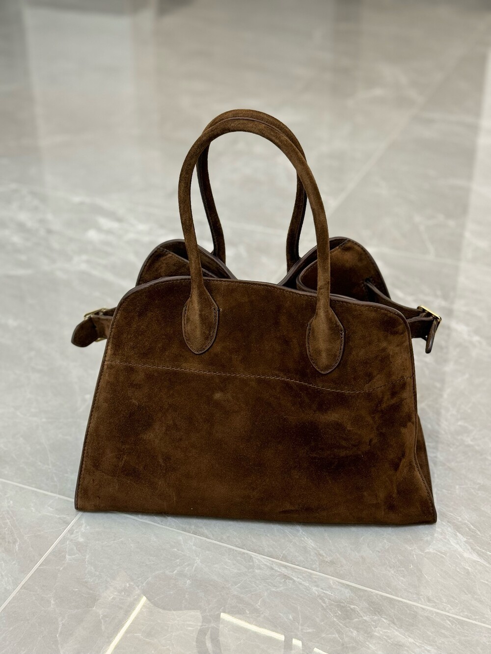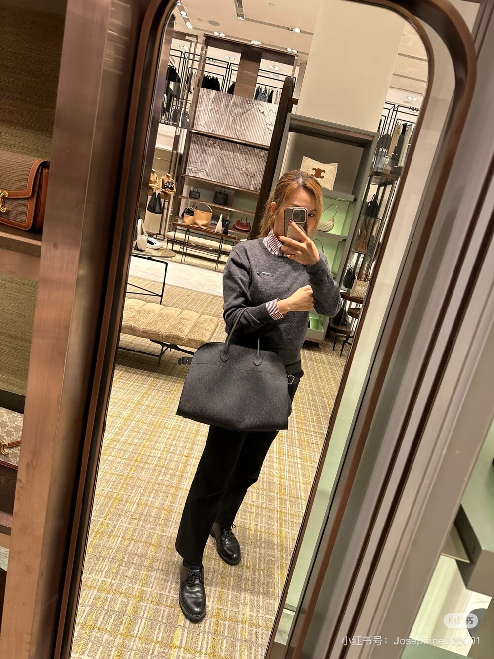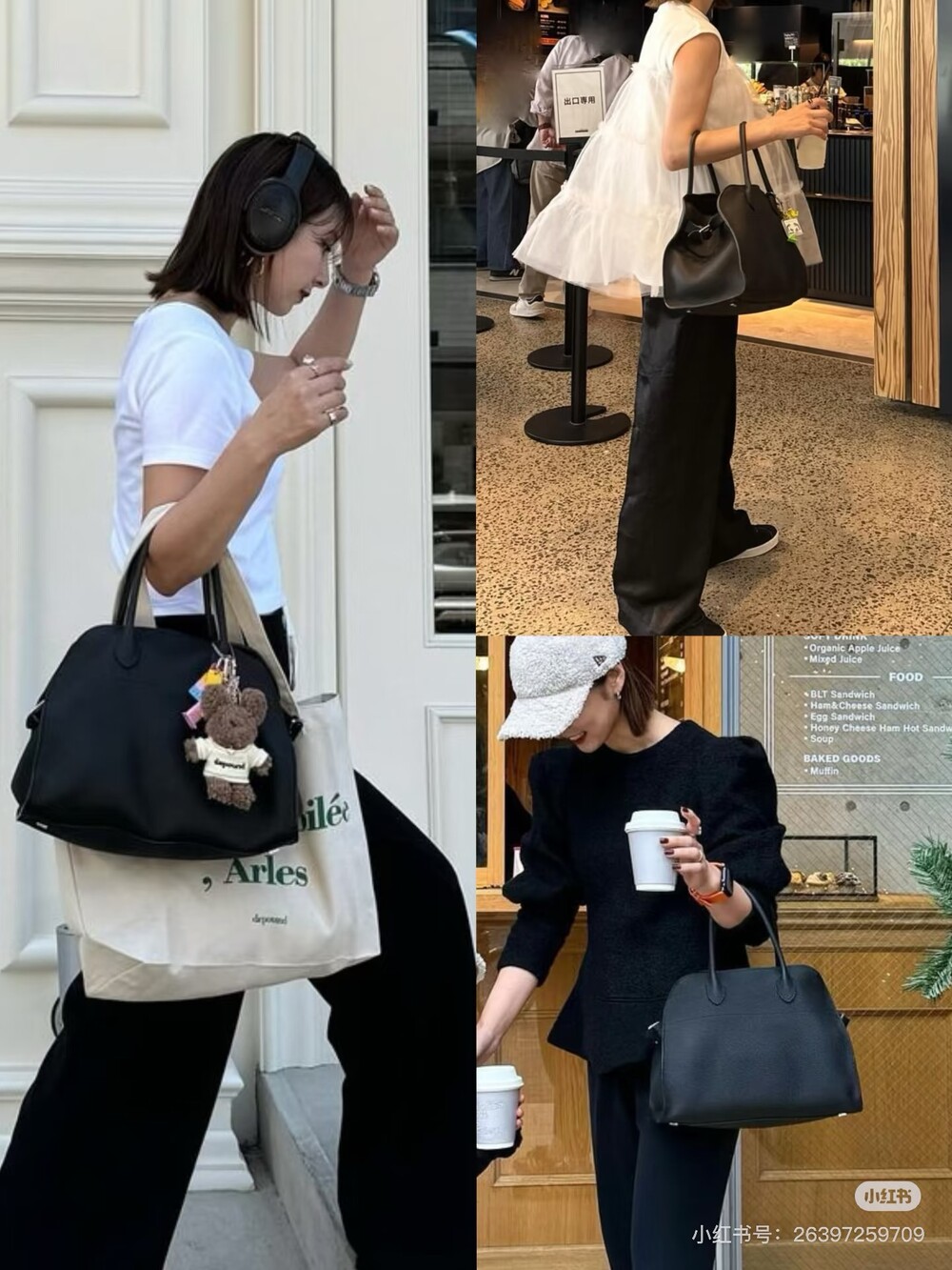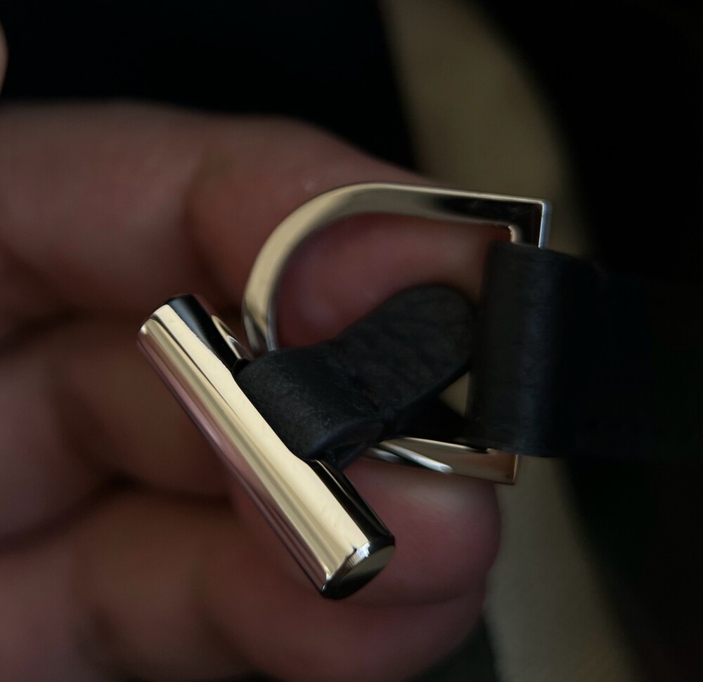 매트 그레인 카프스킨 가죽 소재의 소프트 스트럭처 탑 핸들 백. 벨트가 장식된 사이드 거싯 패널 및 내부 토글 클로저.