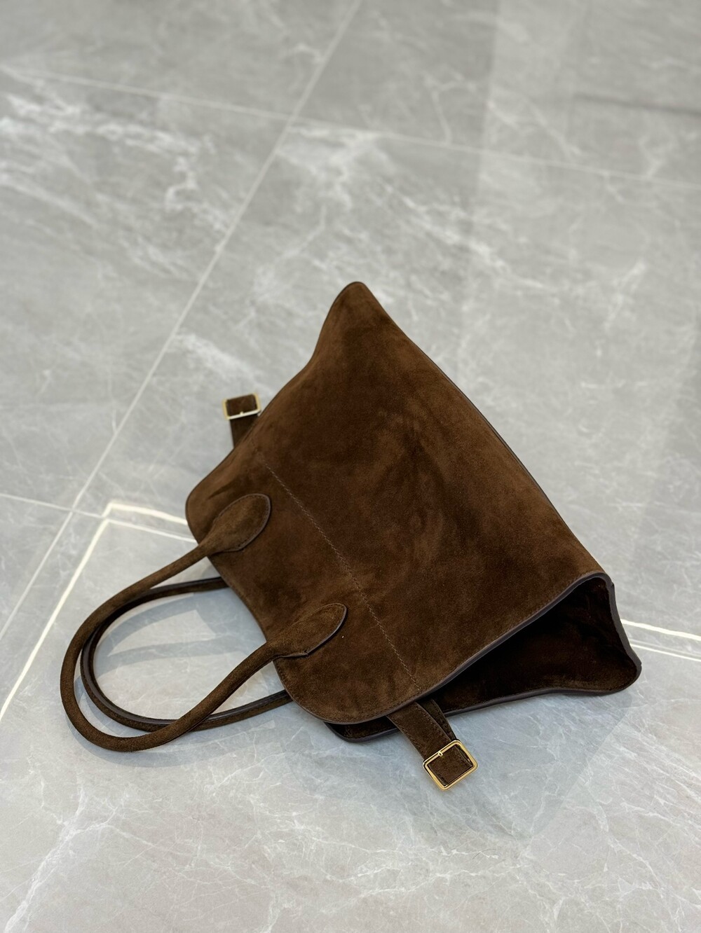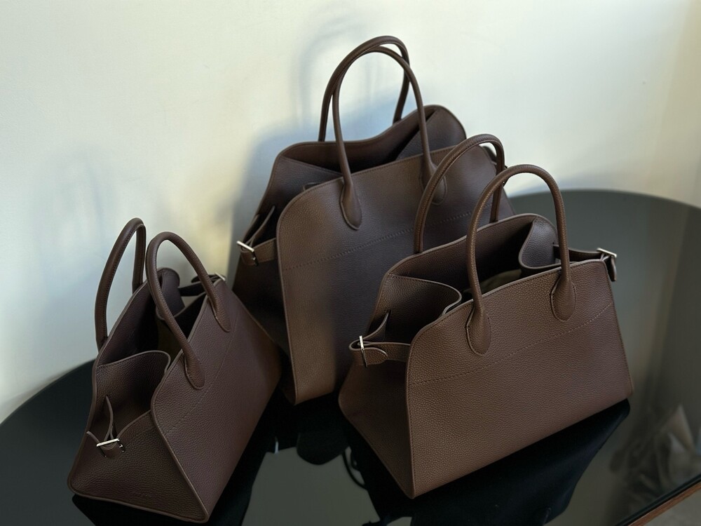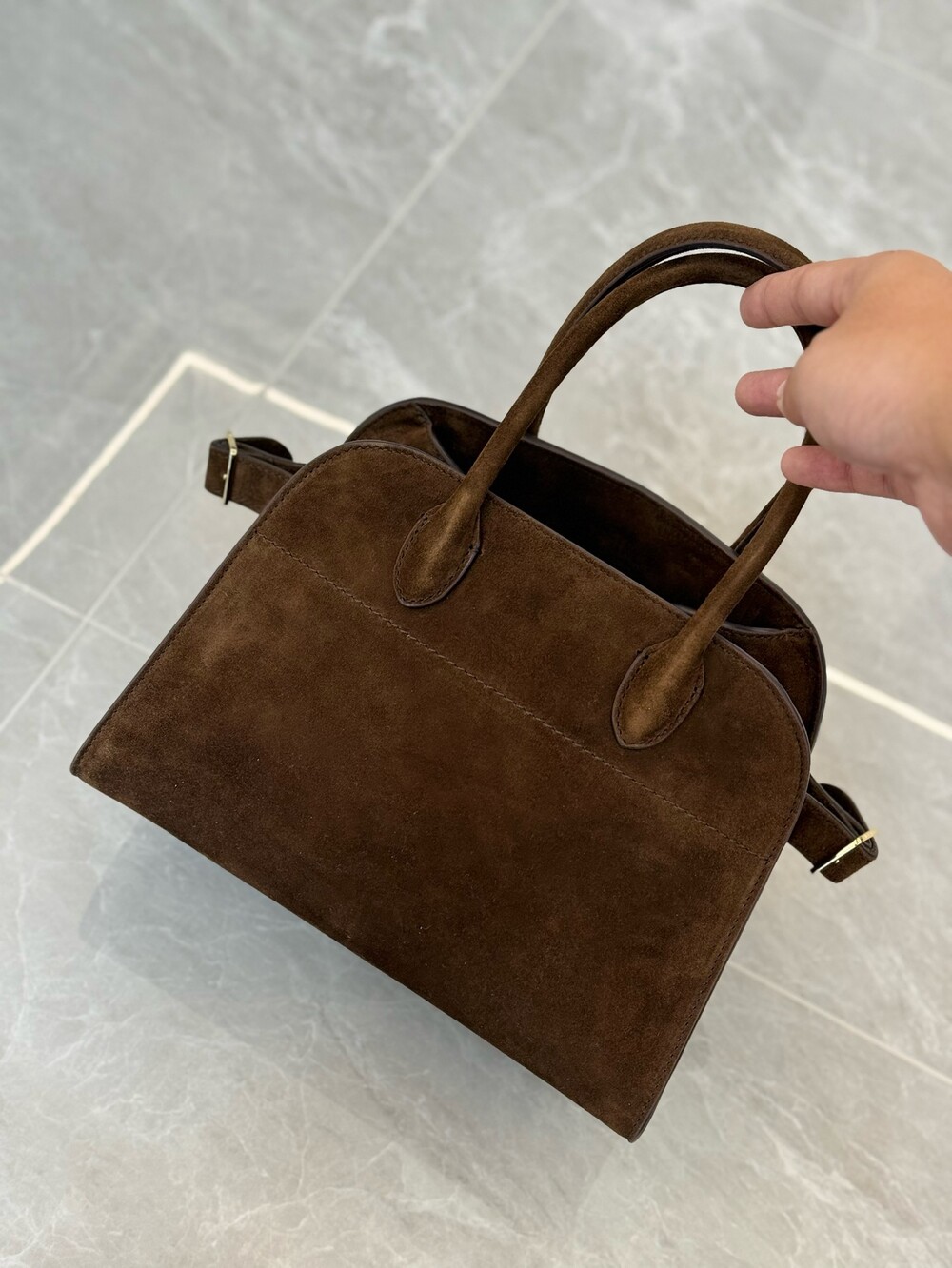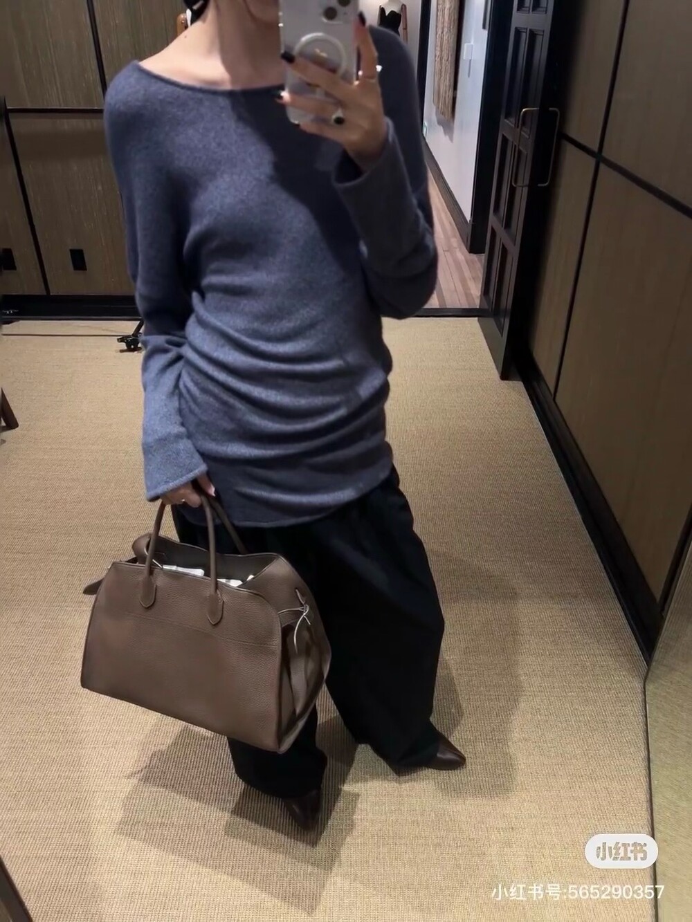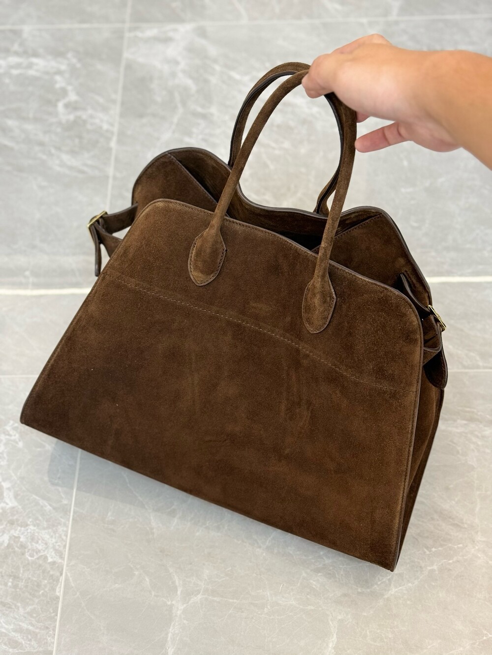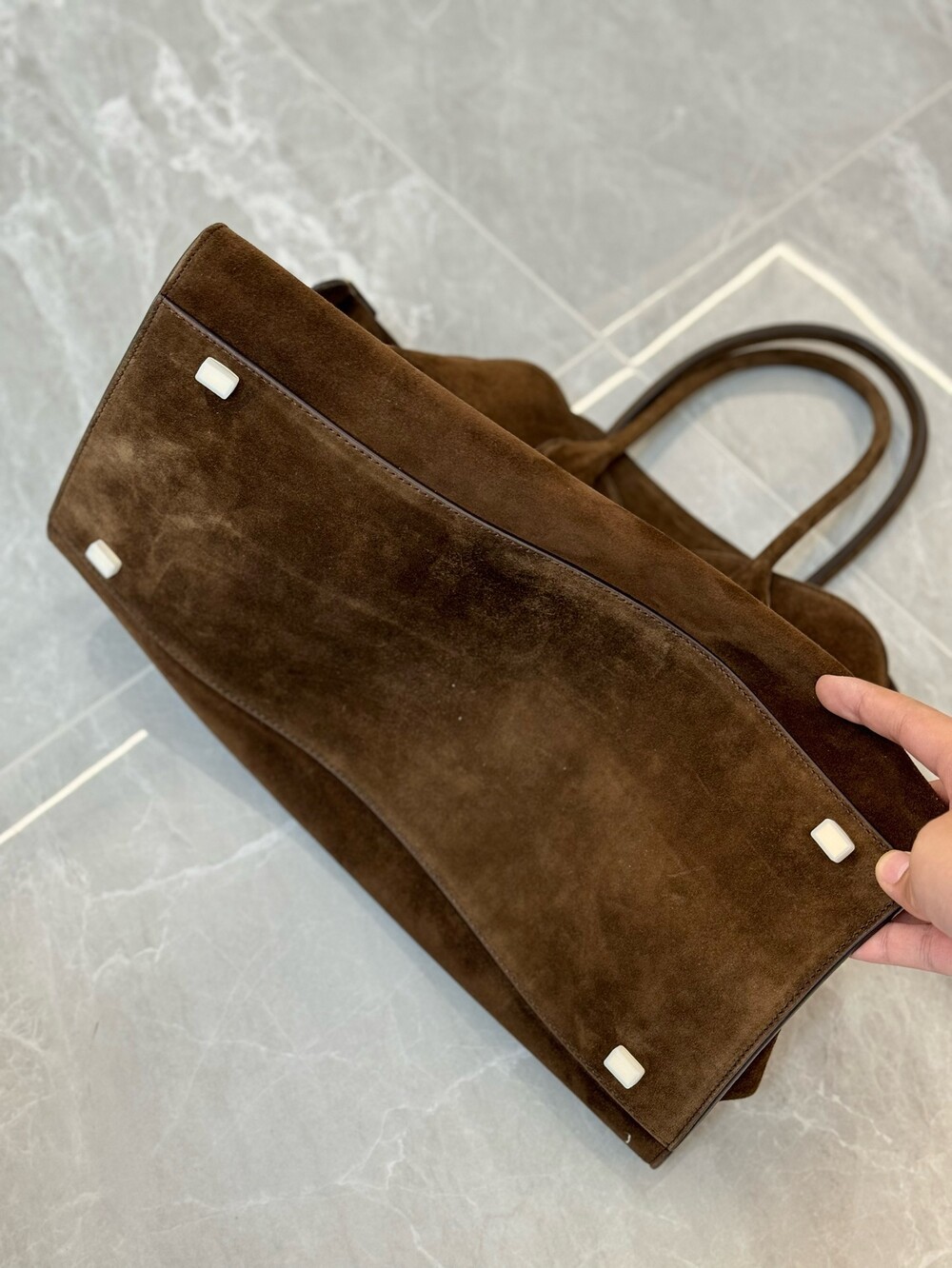 매트 그레인 카프스킨 가죽 소재의 소프트 스트럭처 탑 핸들 백. 벨트가 장식된 사이드 거싯 패널 및 내부 토글 클로저.