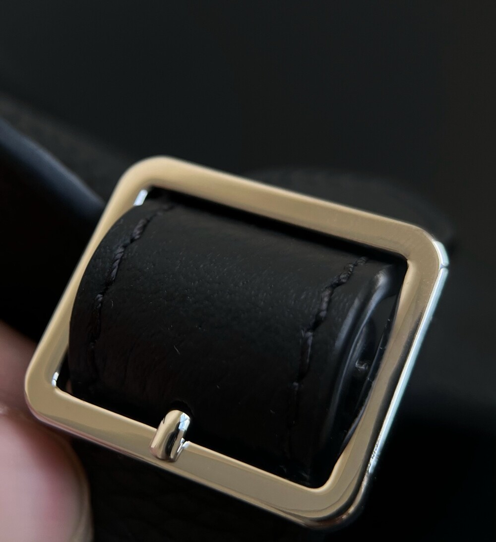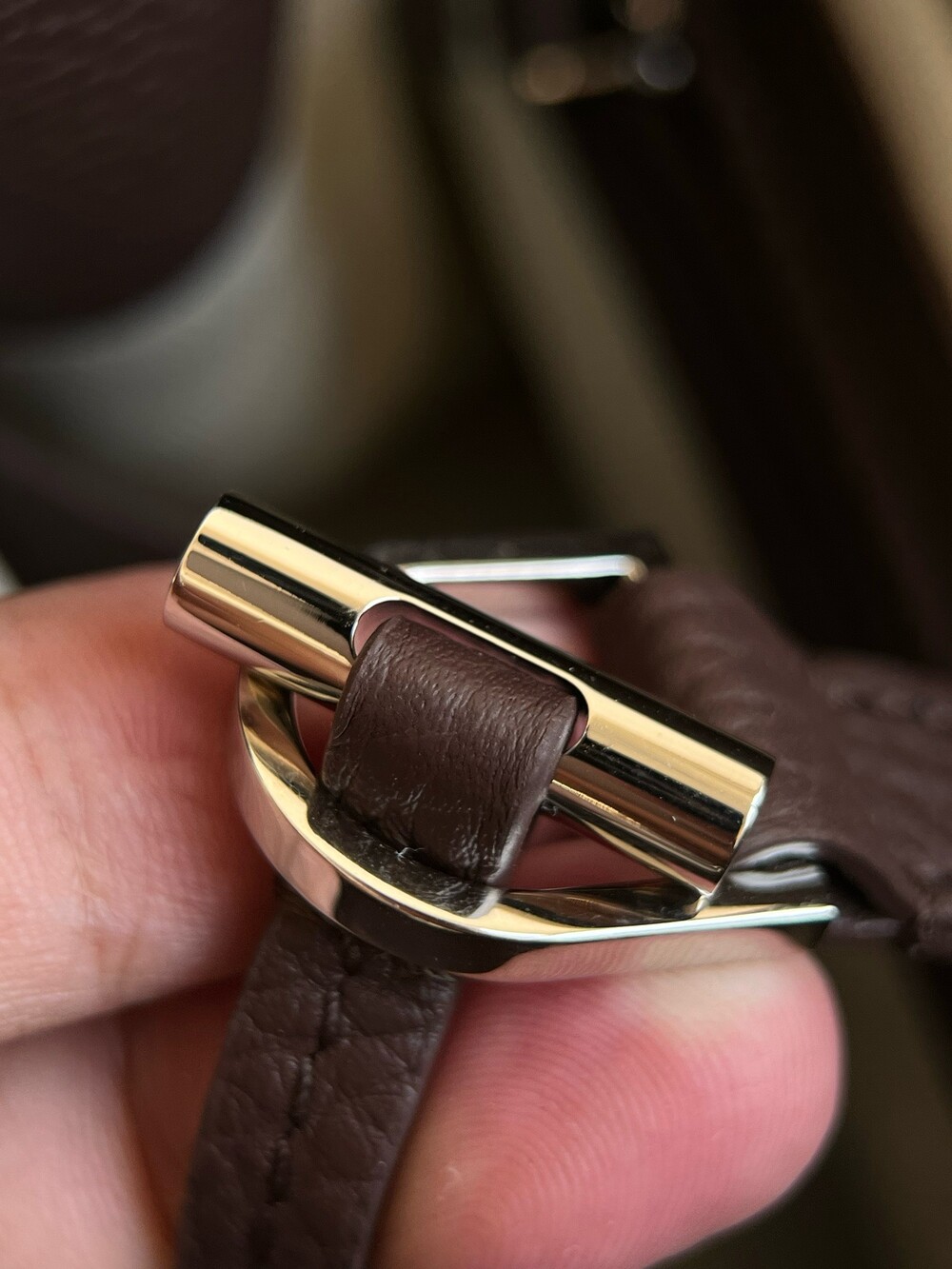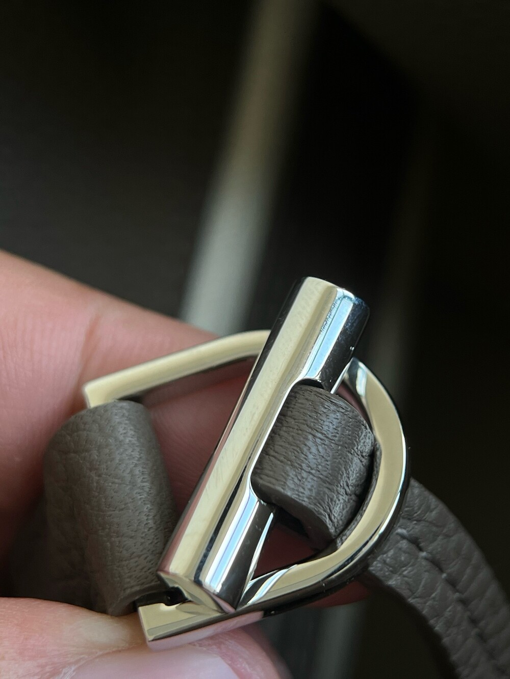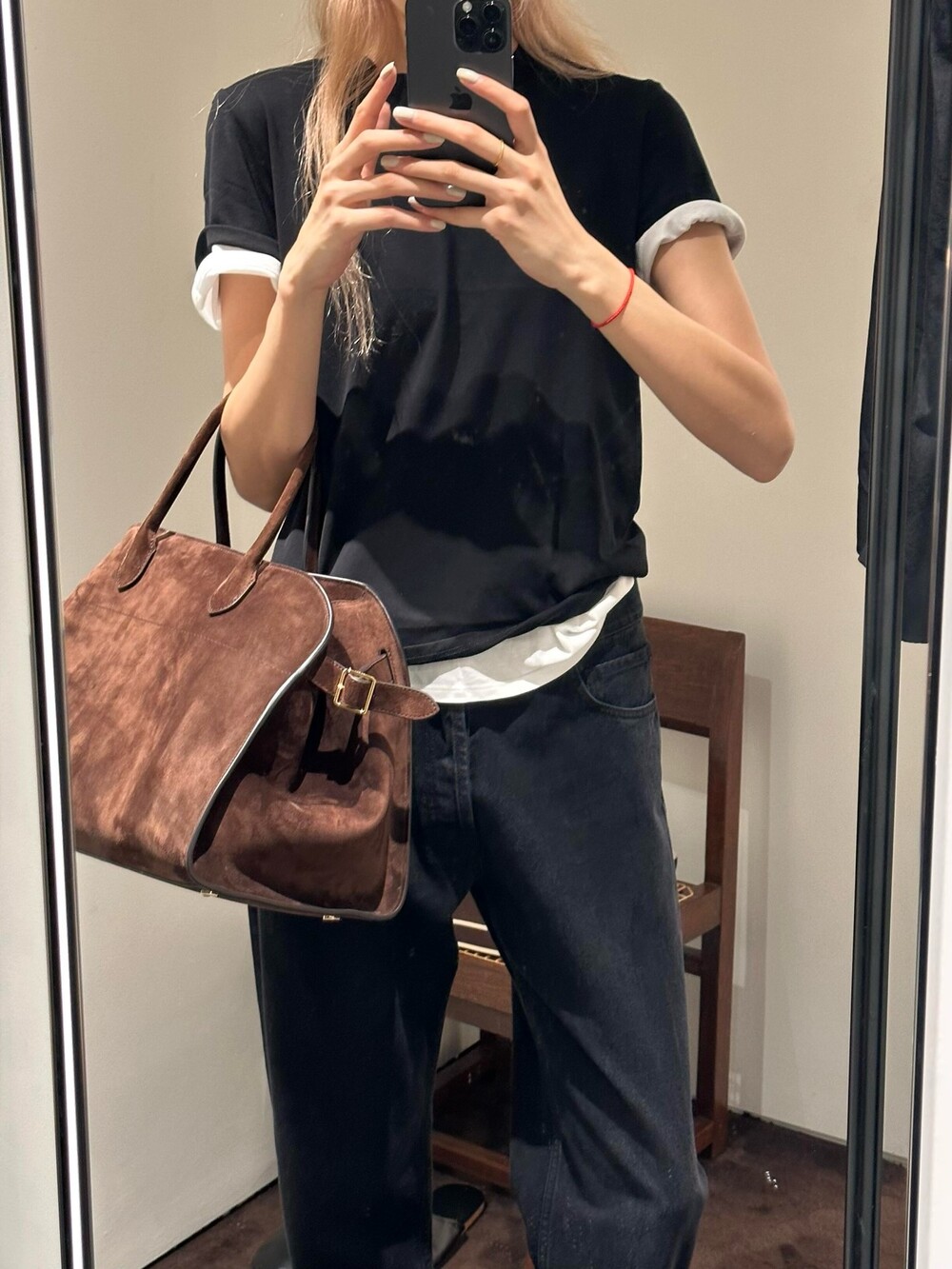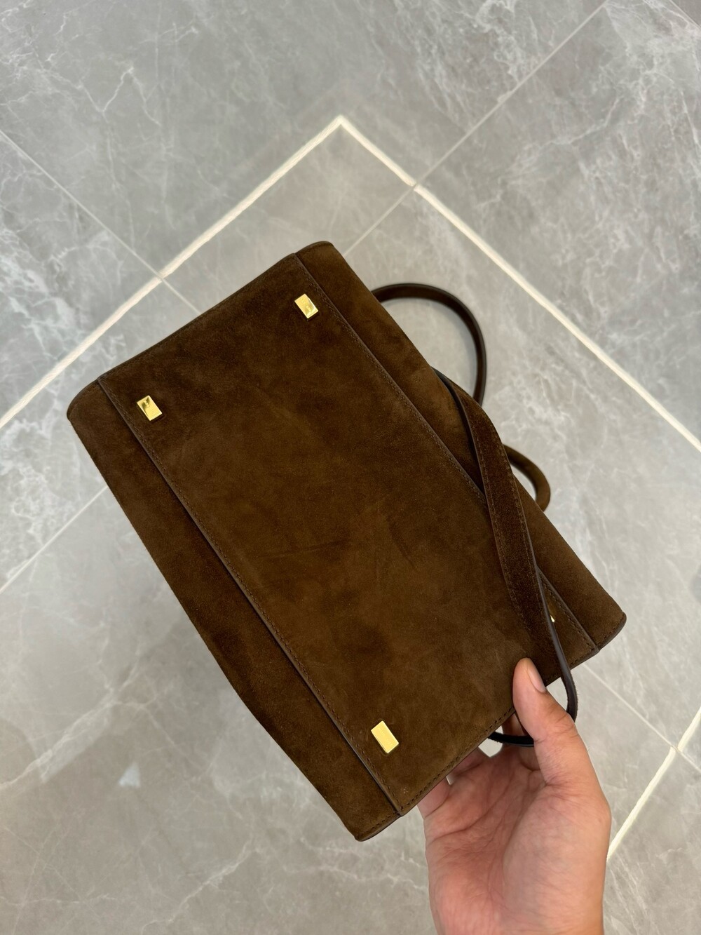 매트 그레인 카프스킨 가죽 소재의 소프트 스트럭처 탑 핸들 백. 벨트가 장식된 사이드 거싯 패널 및 내부 토글 클로저.