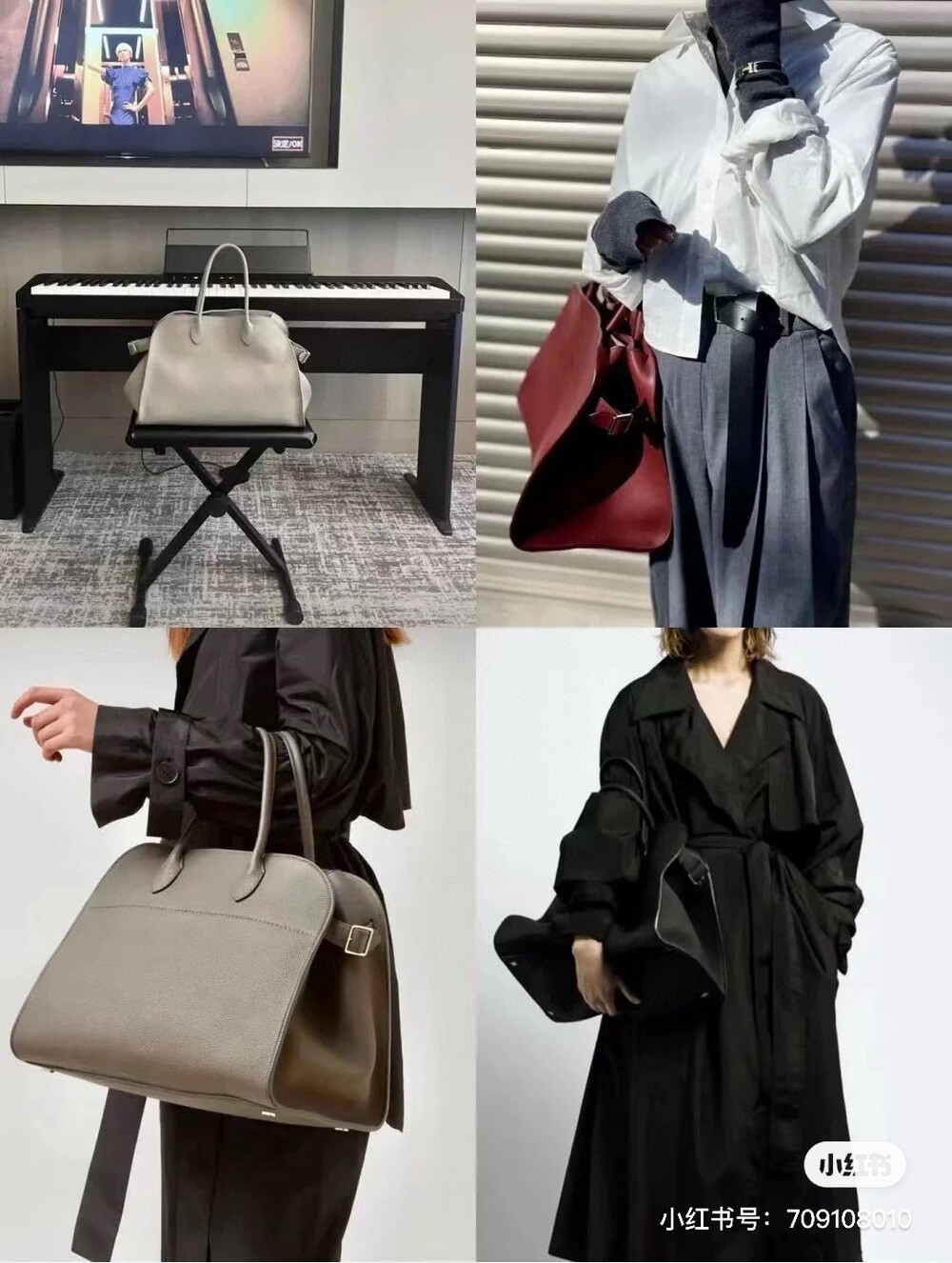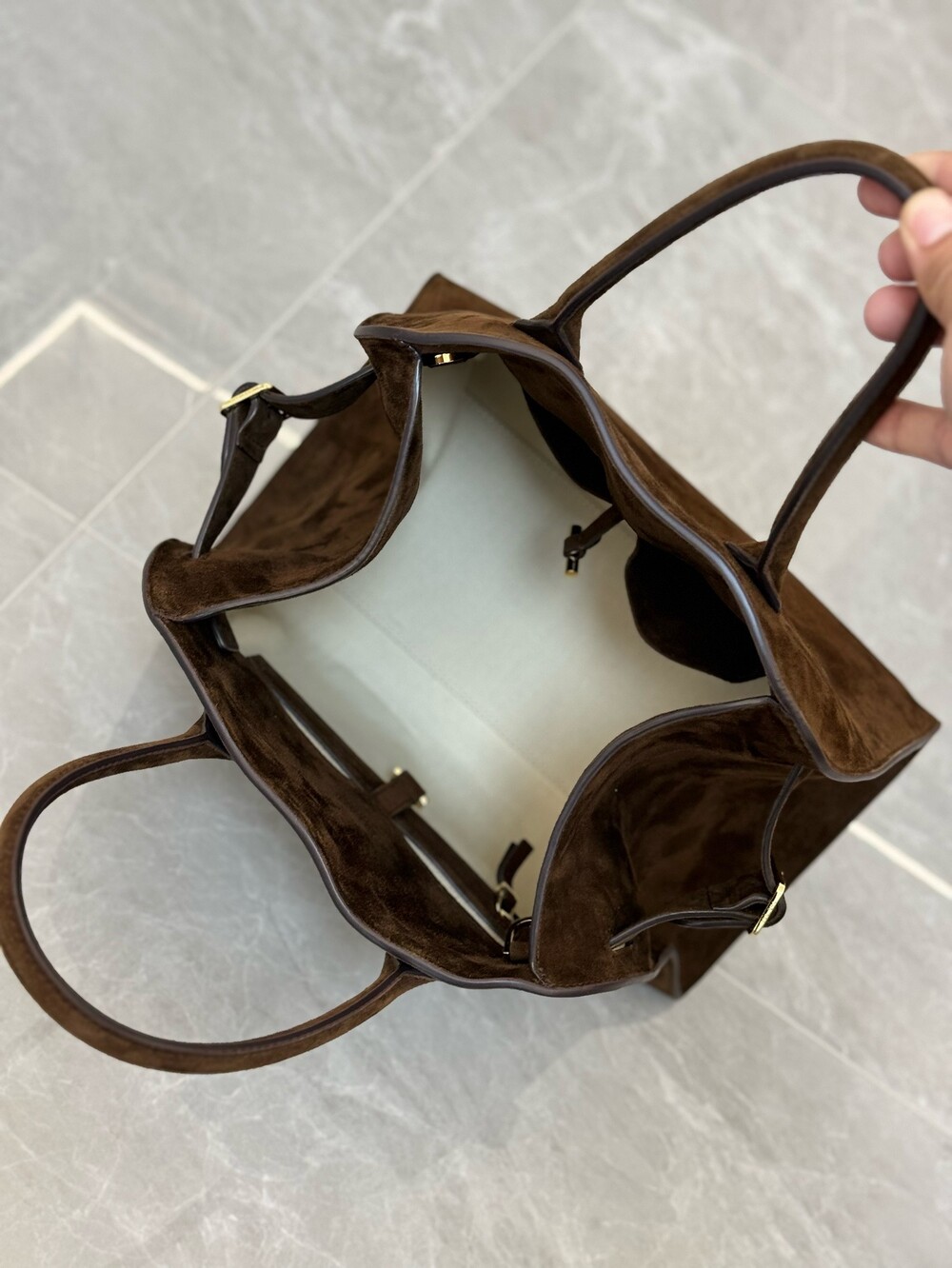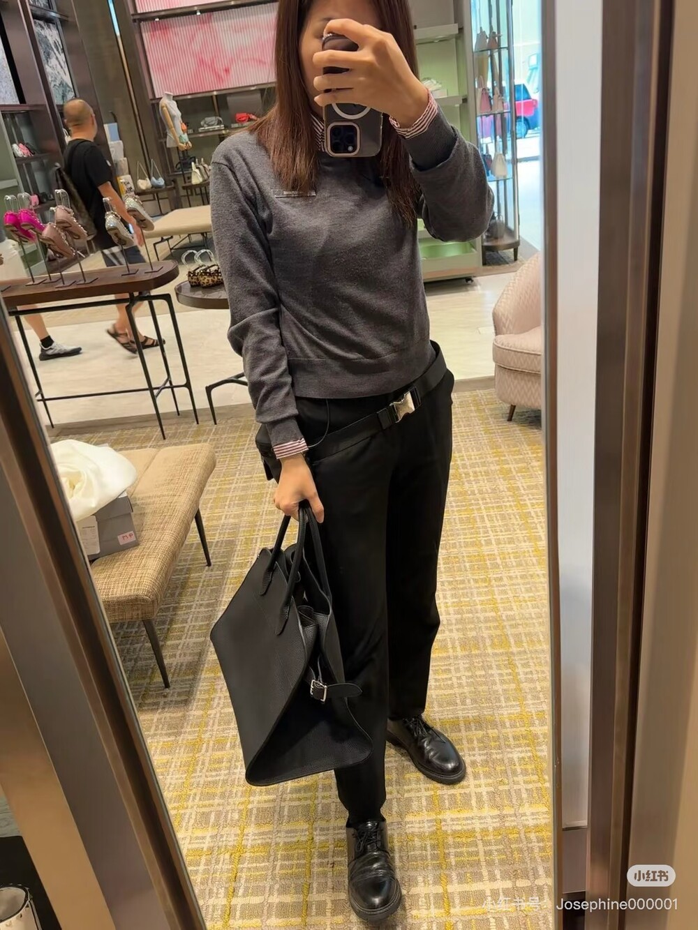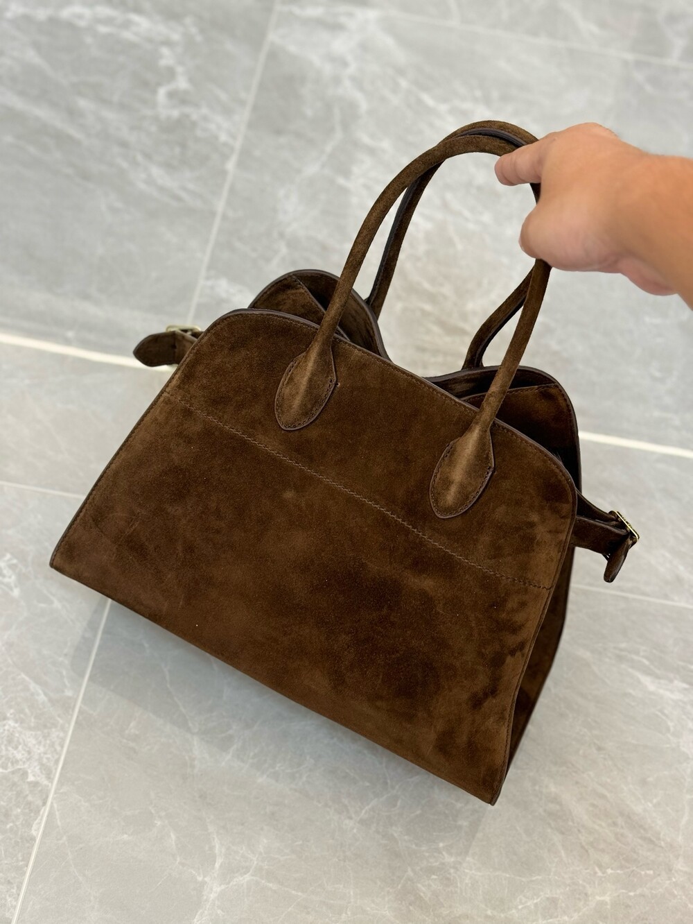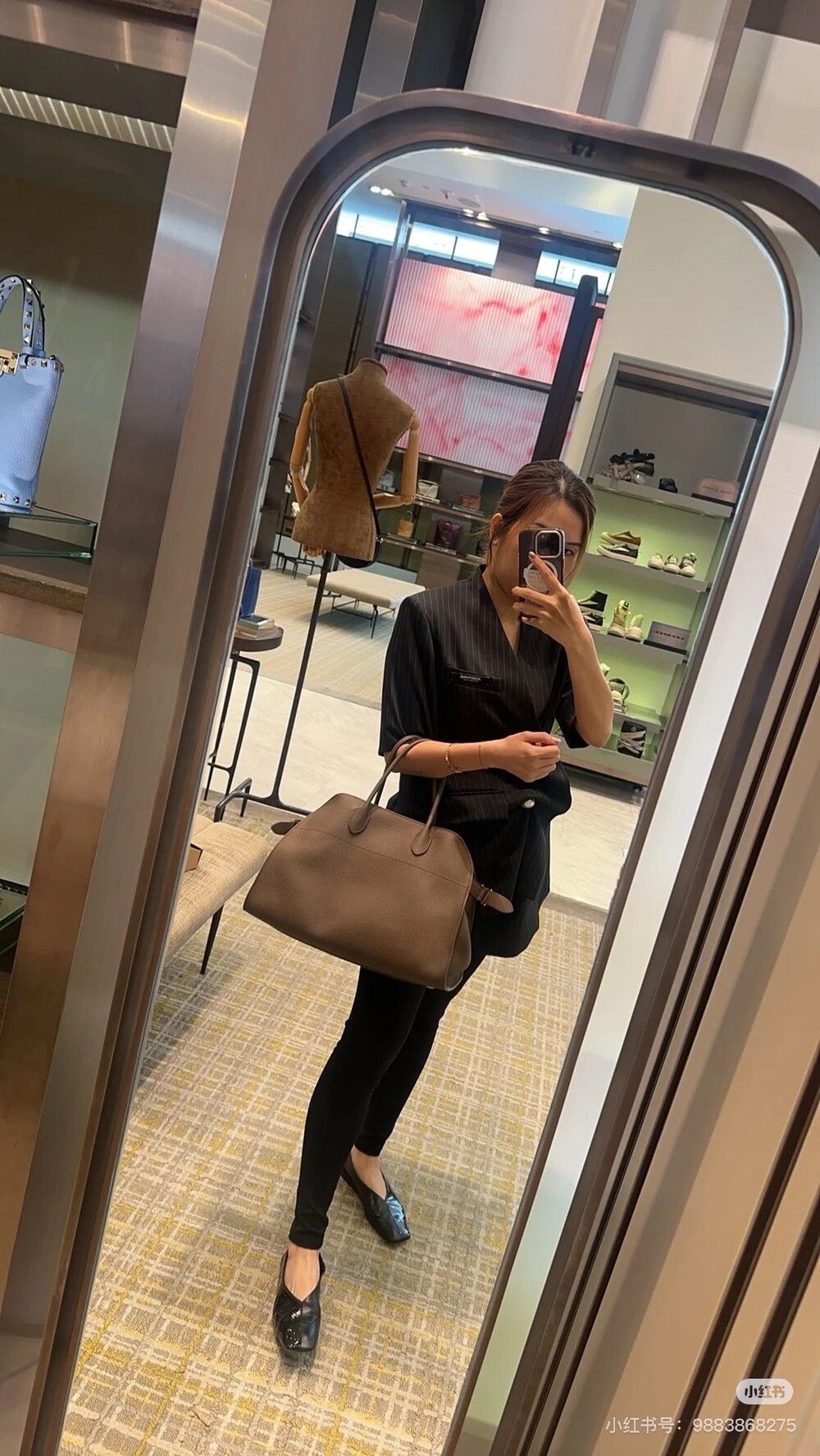 매트 그레인 카프스킨 가죽 소재의 소프트 스트럭처 탑 핸들 백. 벨트가 장식된 사이드 거싯 패널 및 내부 토글 클로저.
