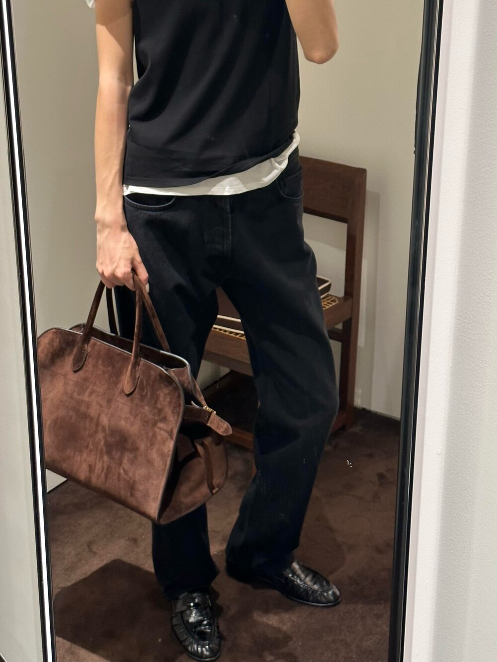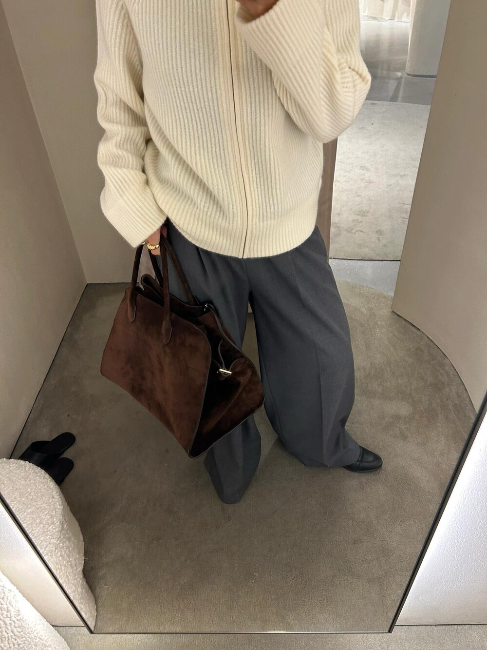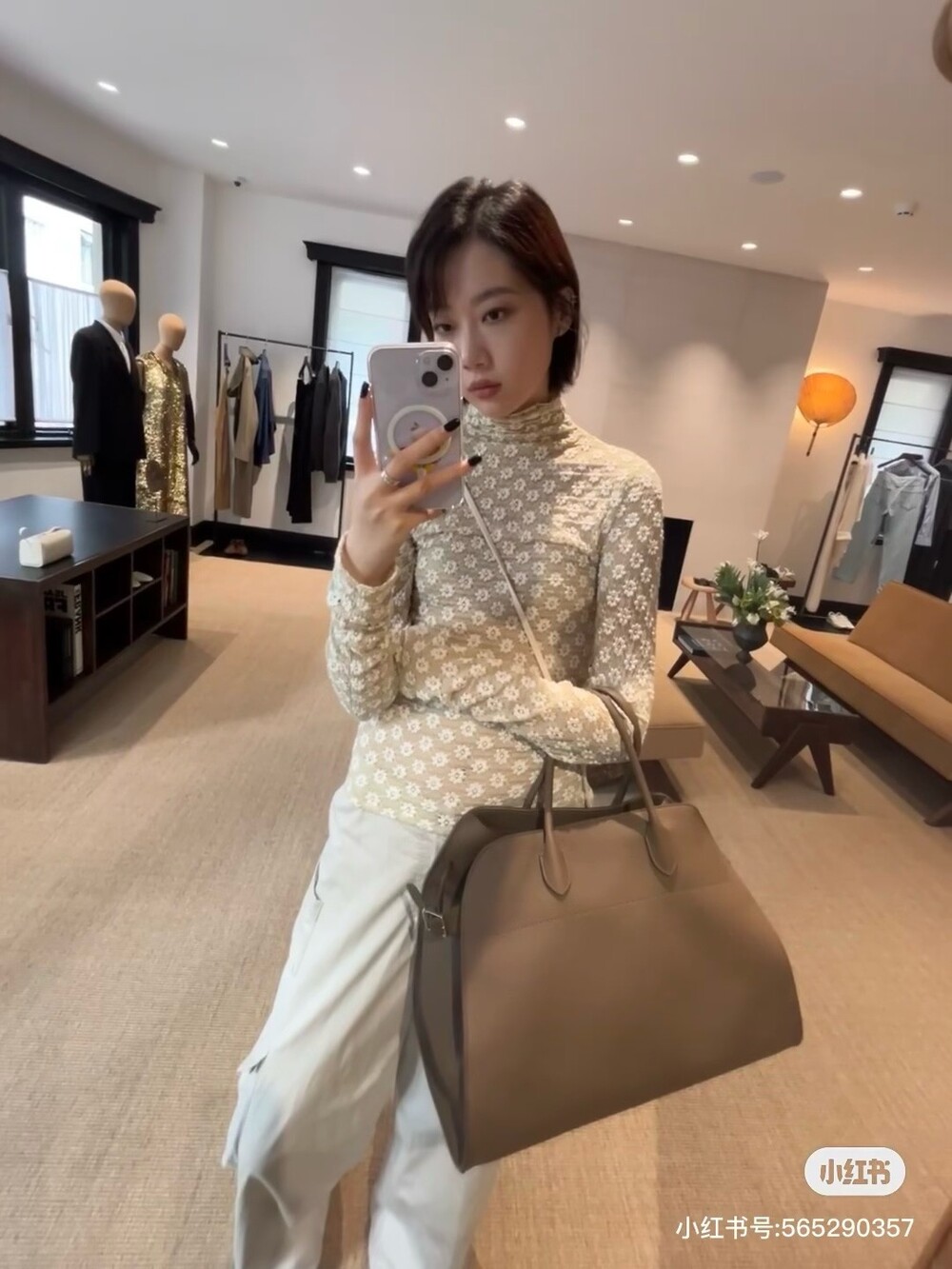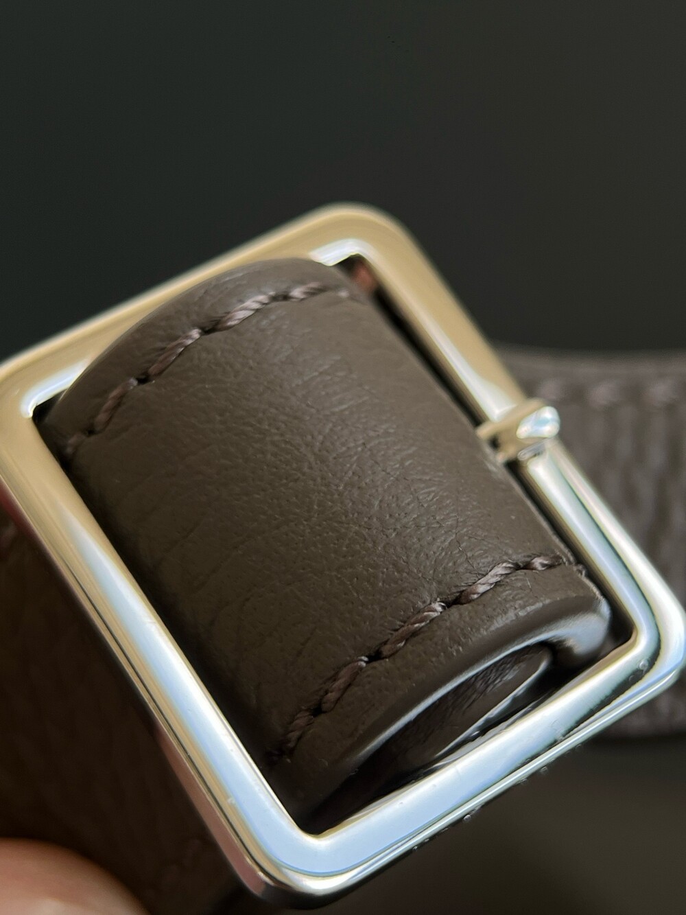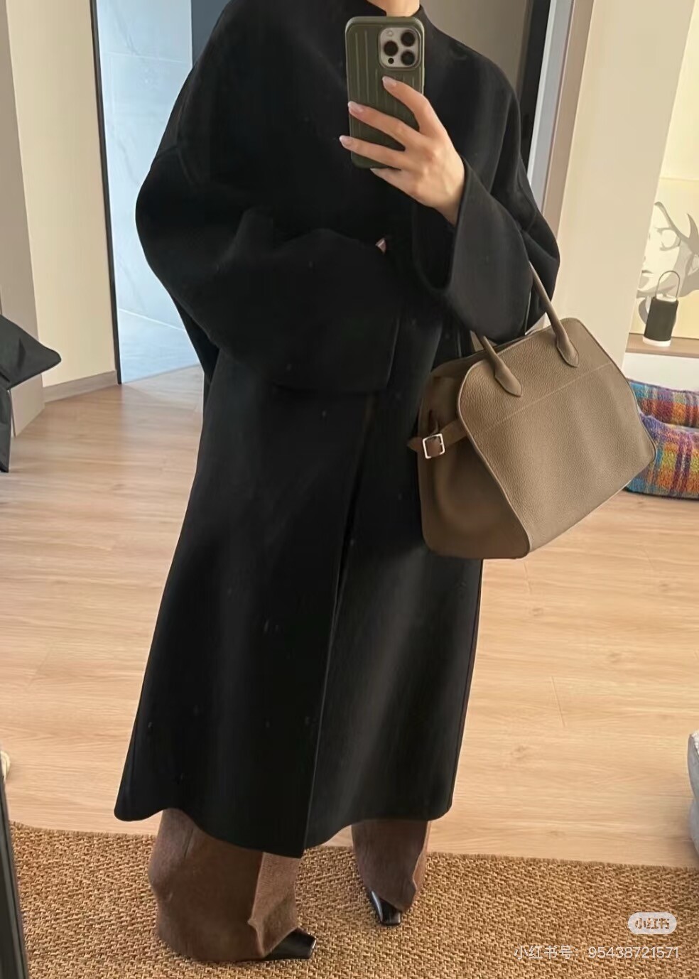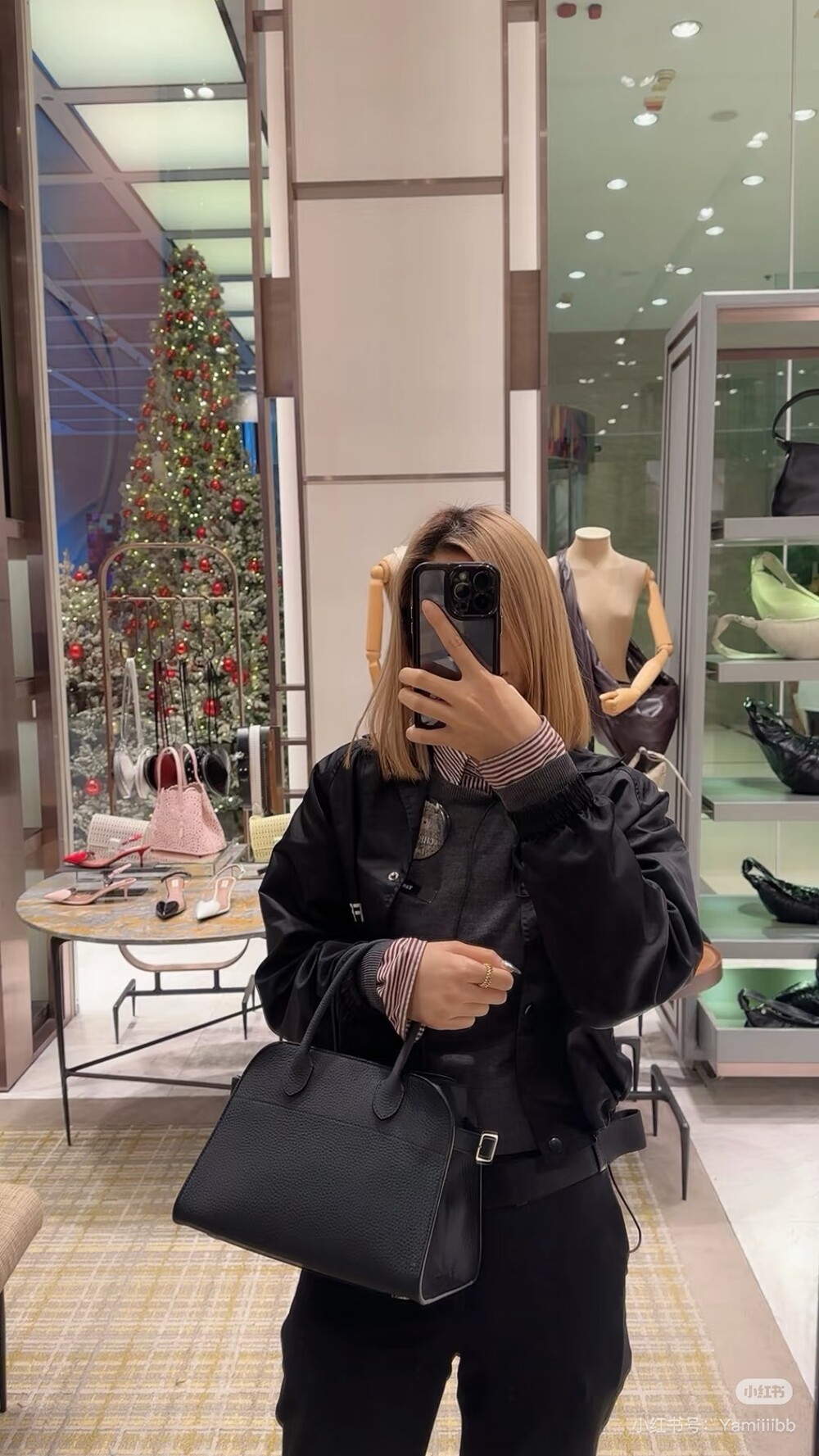 매트 그레인 카프스킨 가죽 소재의 소프트 스트럭처 탑 핸들 백. 벨트가 장식된 사이드 거싯 패널 및 내부 토글 클로저.