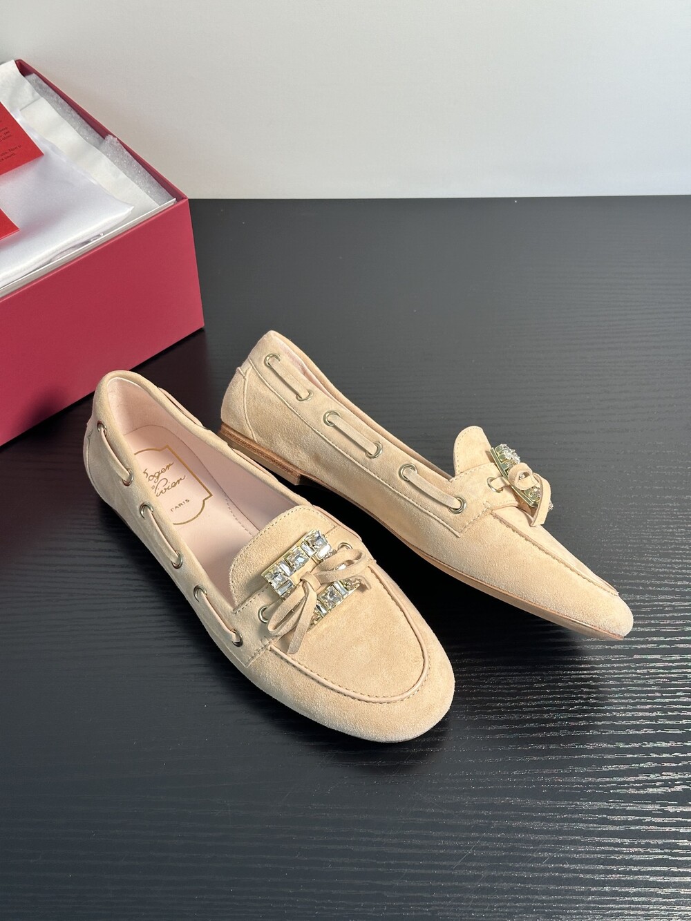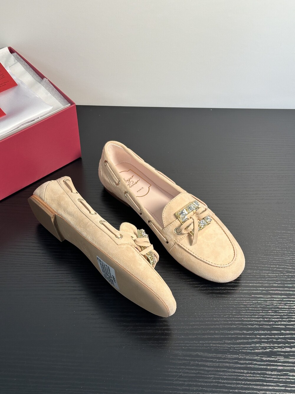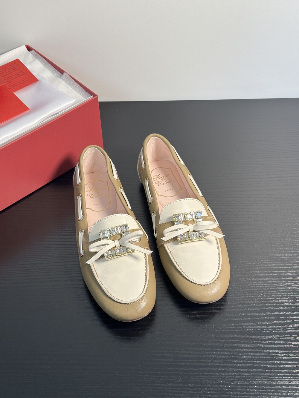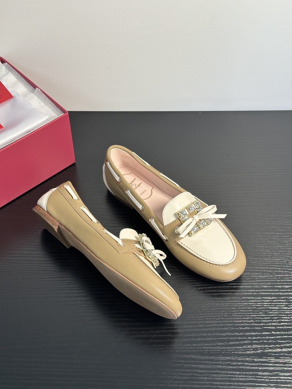 60년대 감성을 불러일으키는 트레 비비에 버클은 이제 하나의 아이콘이 되었습니다. 사각형 크리스털로 구성된 이 버클은 로퍼에 완벽한 마무리를 더합니다. 부드러운 나파 가죽 소재에 앞쪽의 리본 장식으로 우아함과 편안함을 동시에 선사합니다.