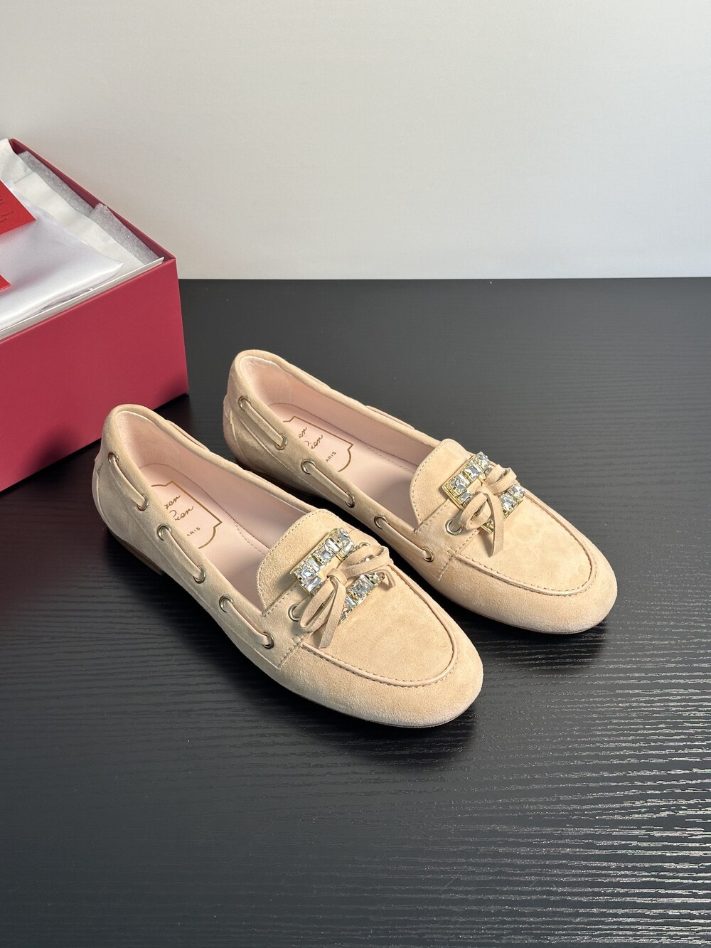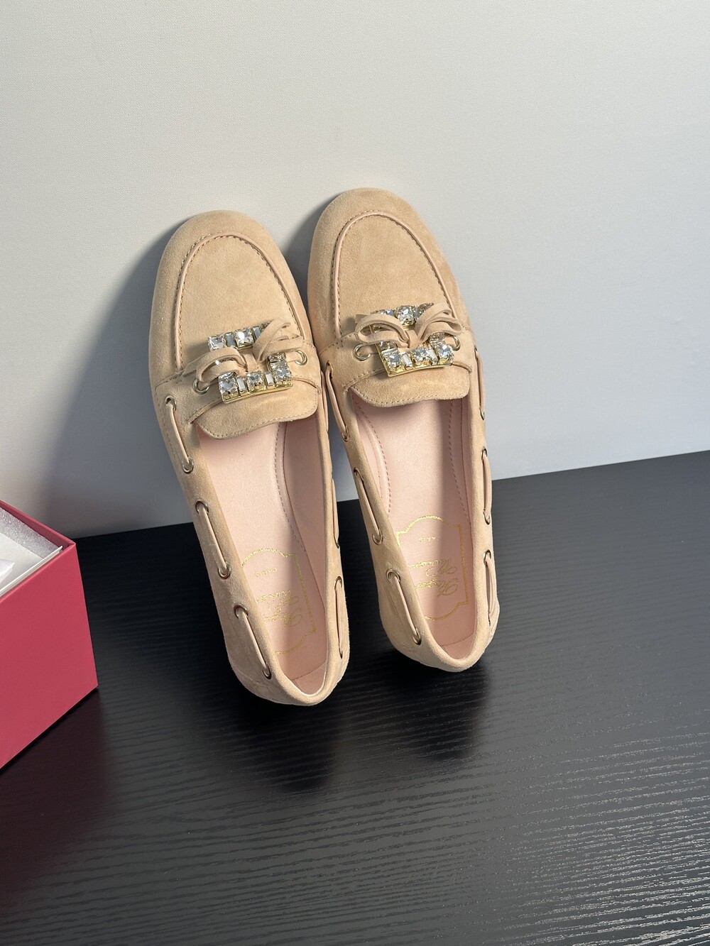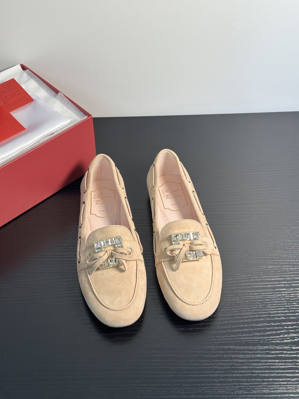 60년대 감성을 불러일으키는 트레 비비에 버클은 이제 하나의 아이콘이 되었습니다. 사각형 크리스털로 구성된 이 버클은 로퍼에 완벽한 마무리를 더합니다. 부드러운 나파 가죽 소재에 앞쪽의 리본 장식으로 우아함과 편안함을 동시에 선사합니다.