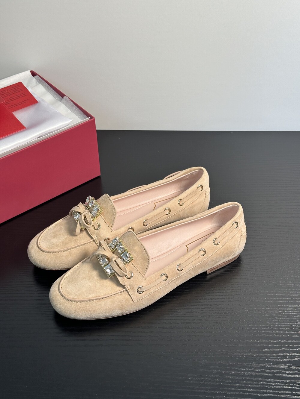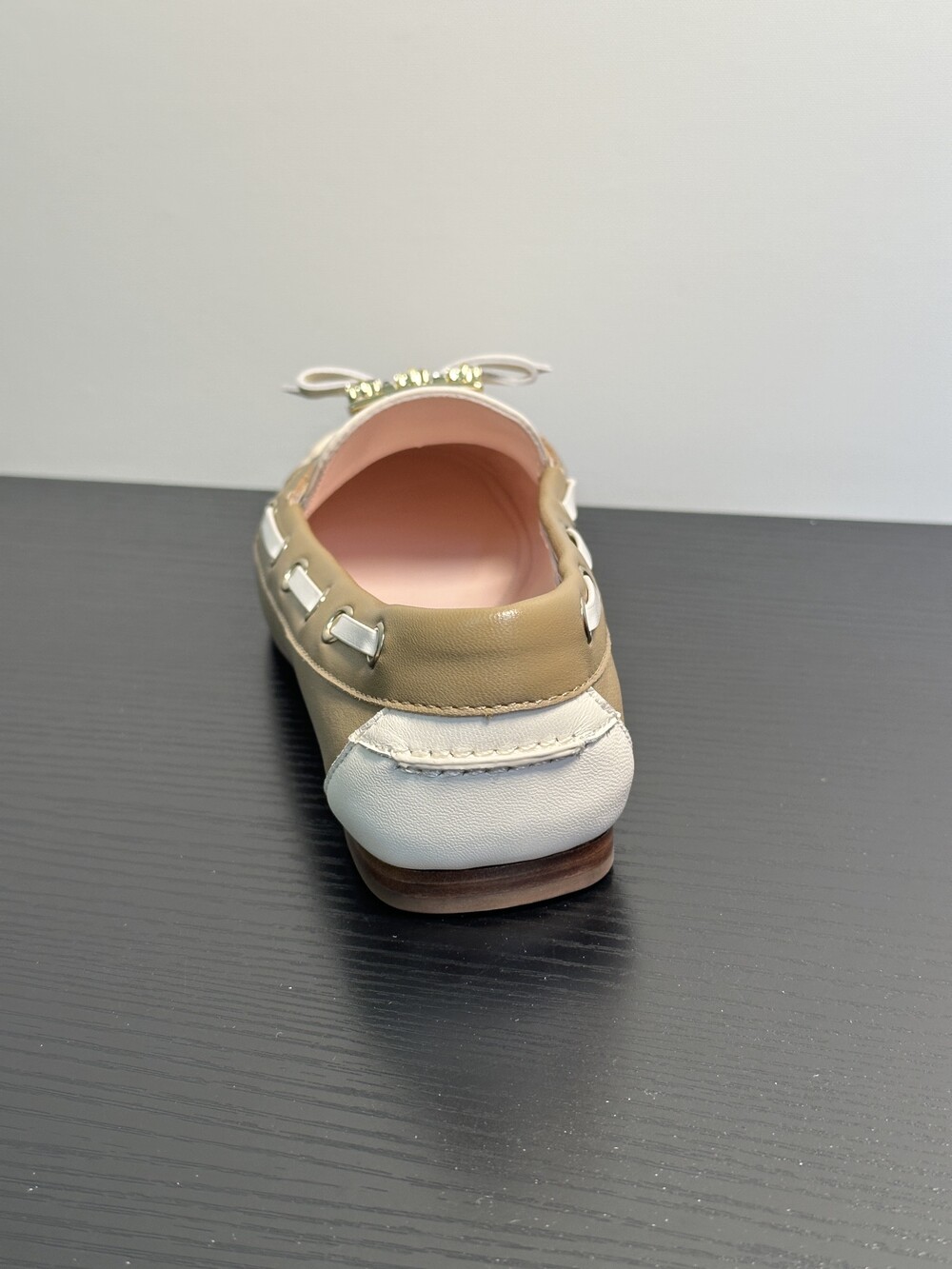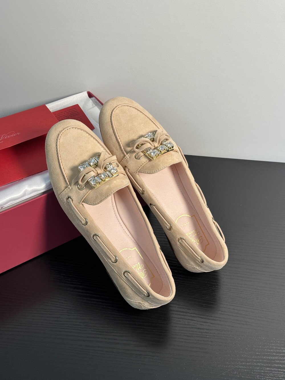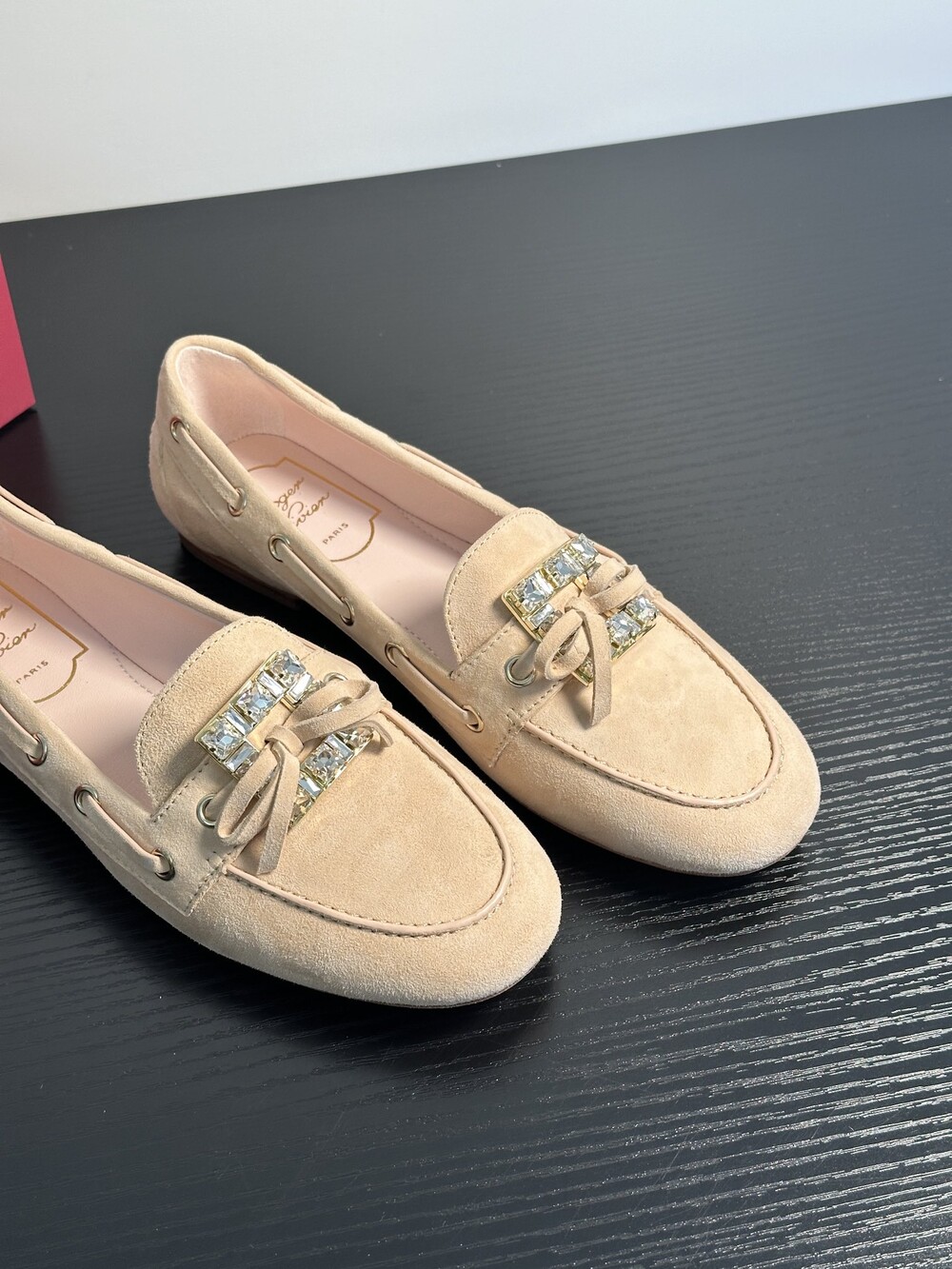 60년대 감성을 불러일으키는 트레 비비에 버클은 이제 하나의 아이콘이 되었습니다. 사각형 크리스털로 구성된 이 버클은 로퍼에 완벽한 마무리를 더합니다. 부드러운 나파 가죽 소재에 앞쪽의 리본 장식으로 우아함과 편안함을 동시에 선사합니다.