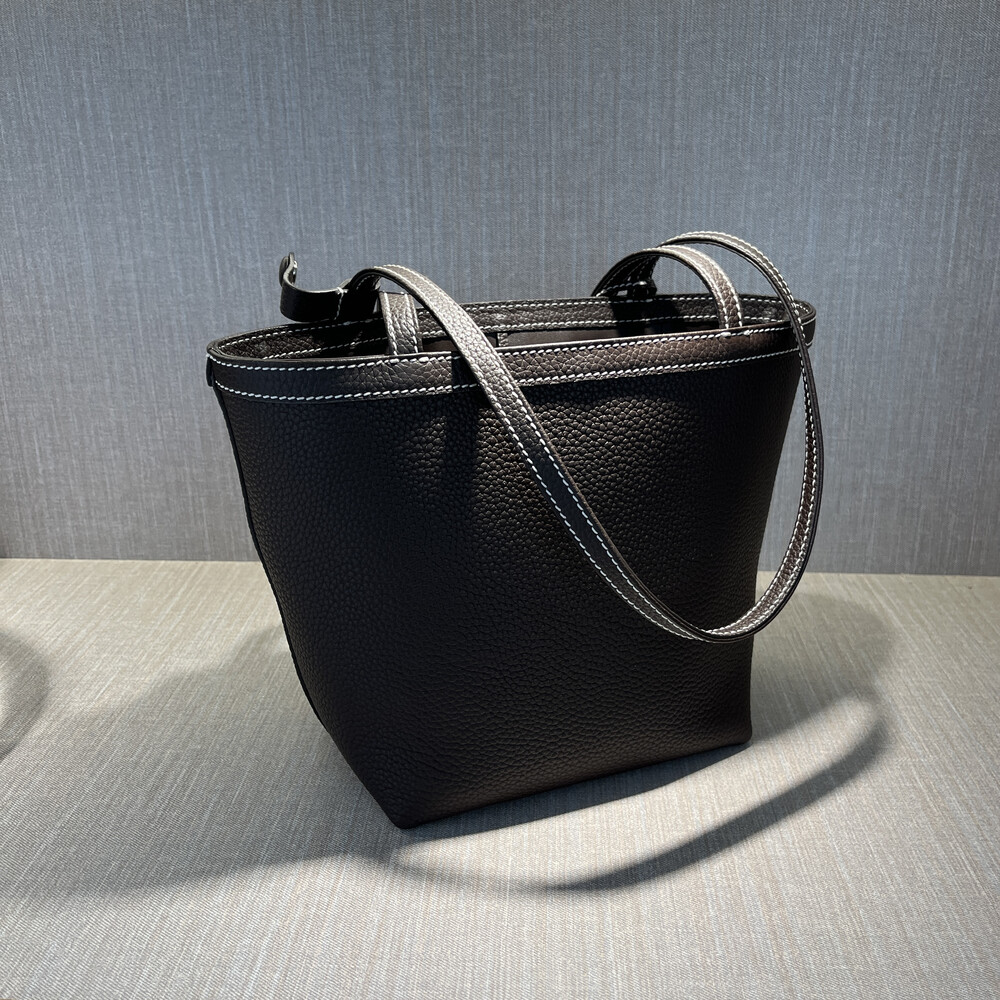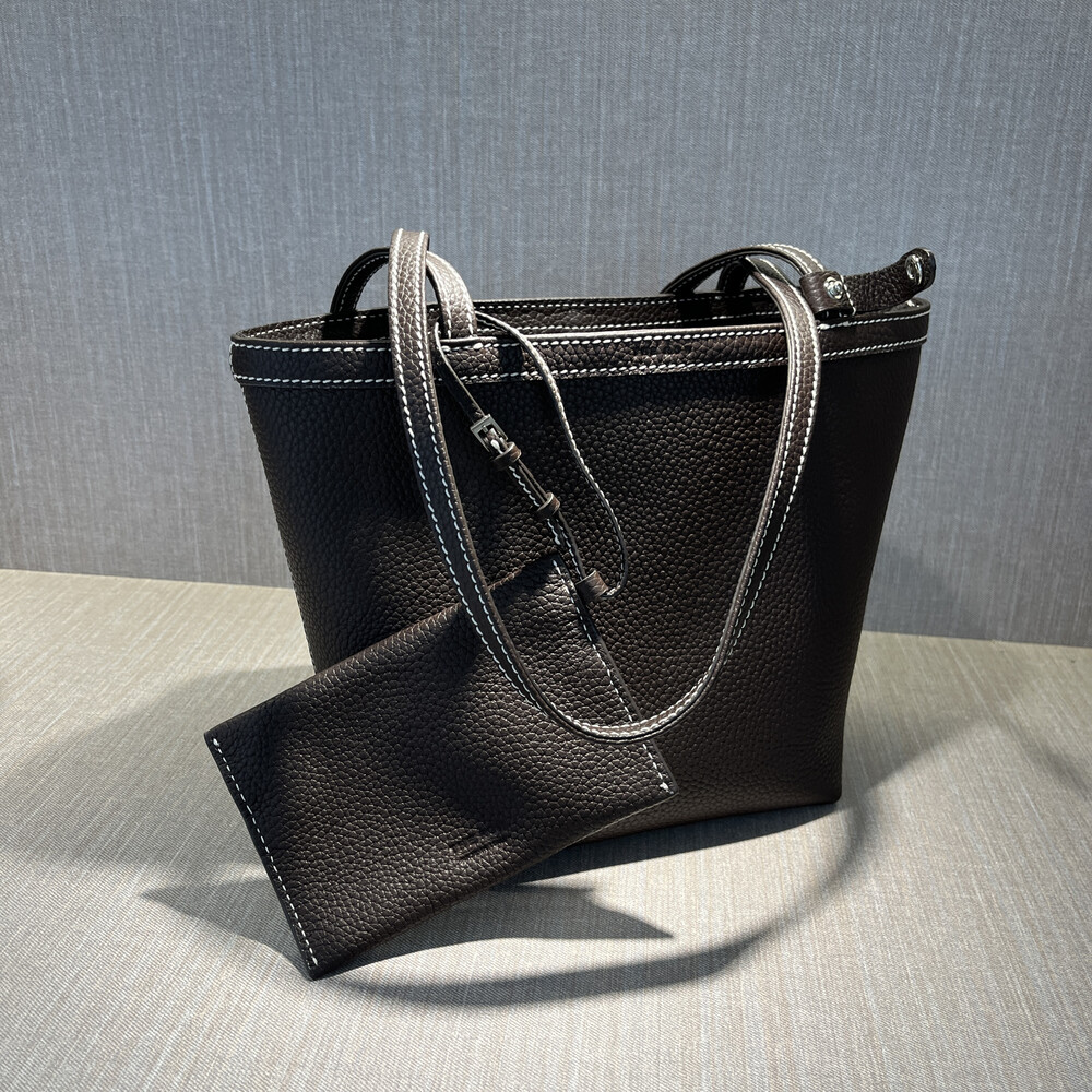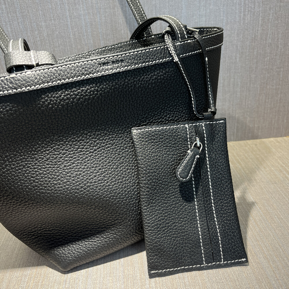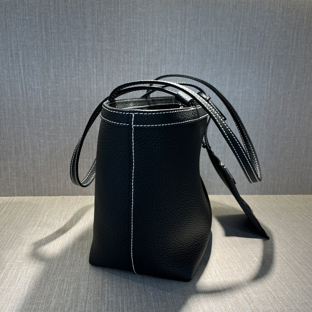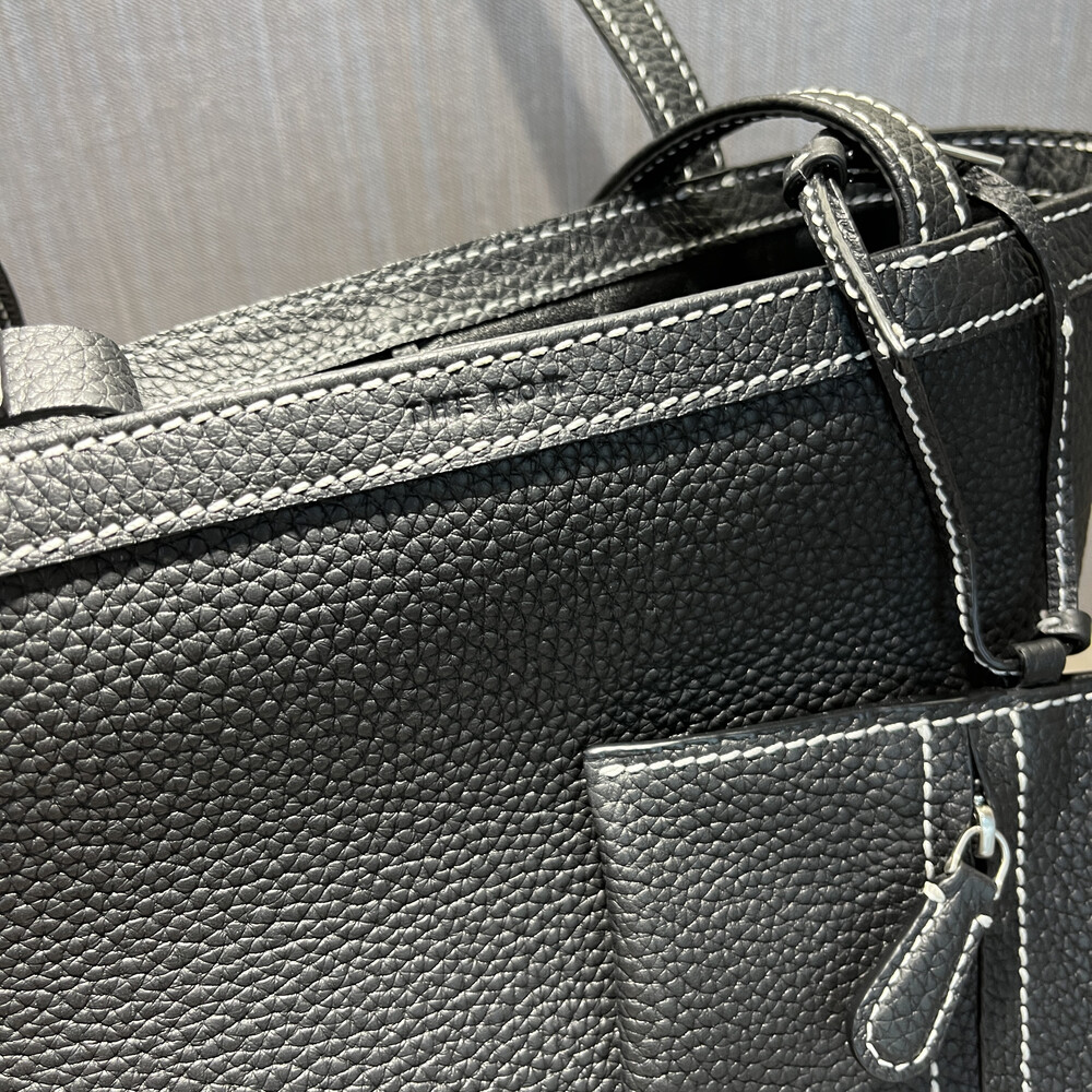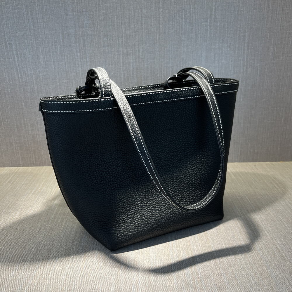 페블 송아지 가죽 소재의 클래식 토트백으로, 내부 토글 클로저, 조절 가능한 스트랩이 연결된 내부 손목 스트랩, 대비를 이루는 탑스티칭 디테일이 특징입니다.