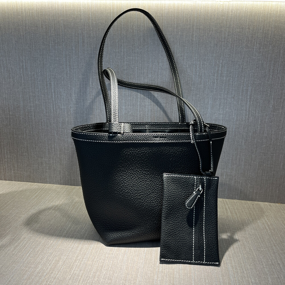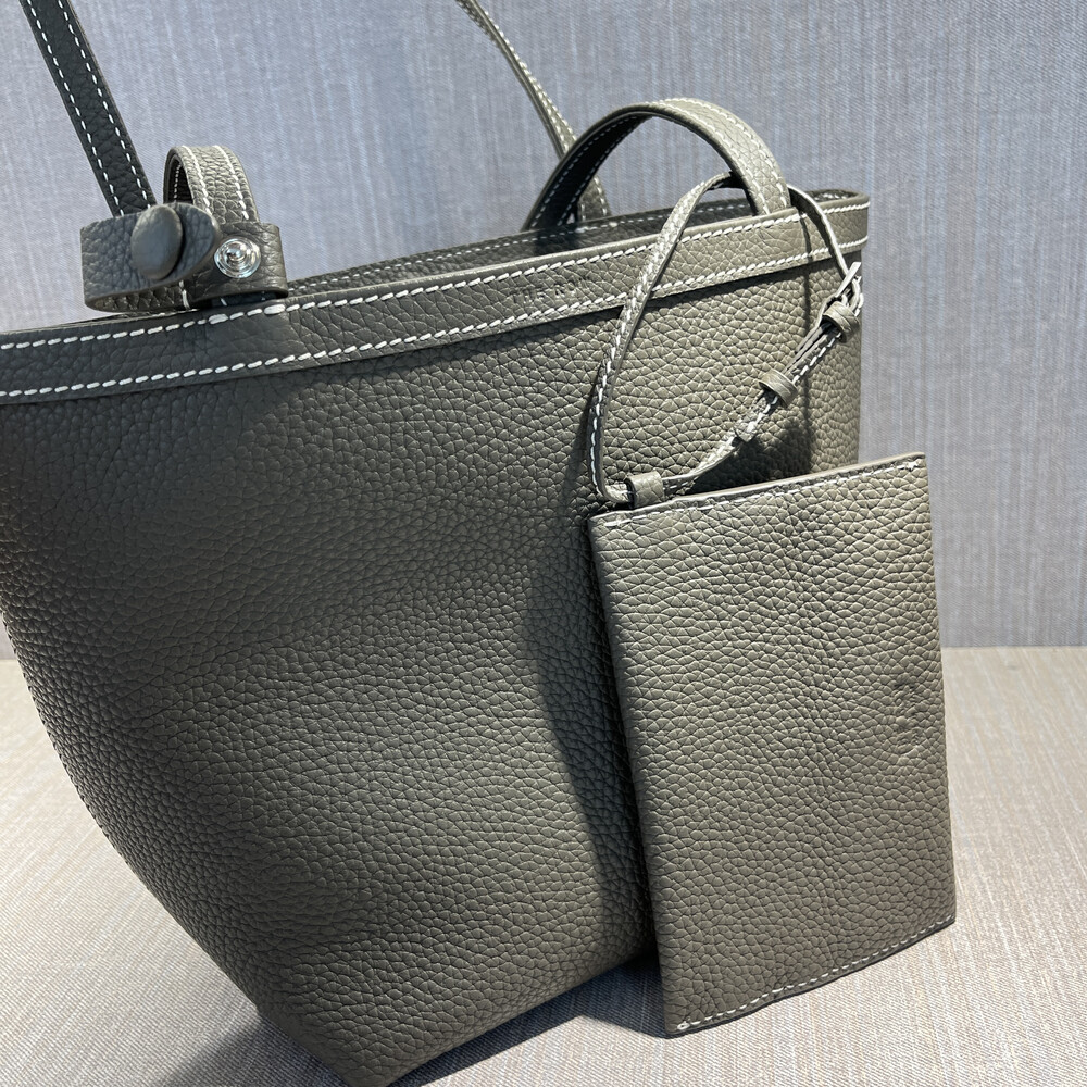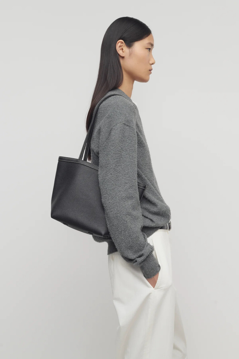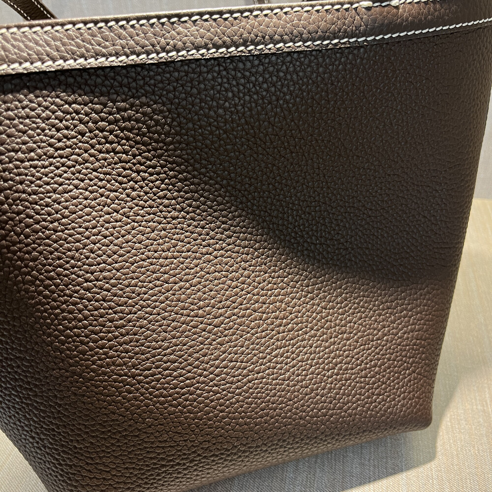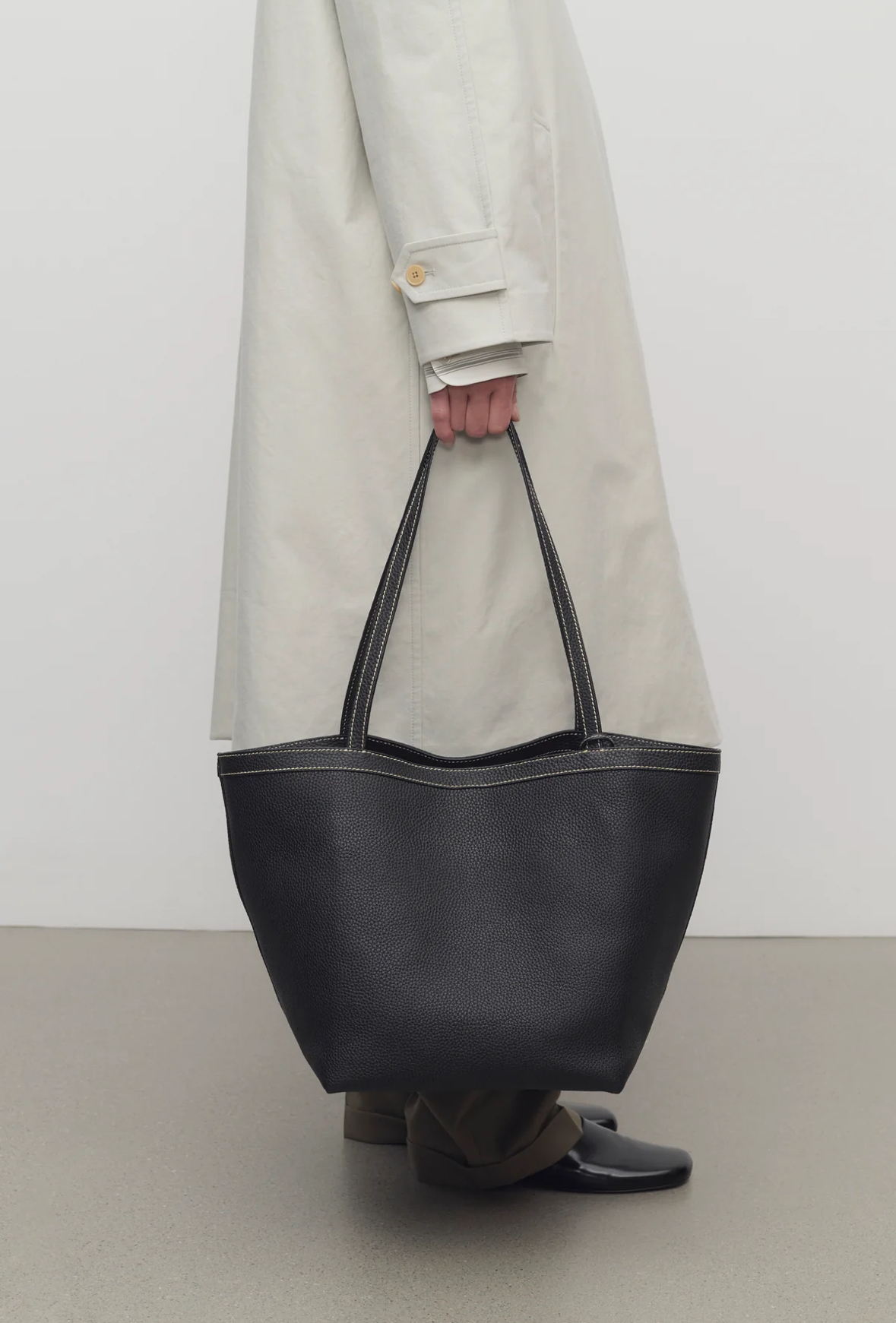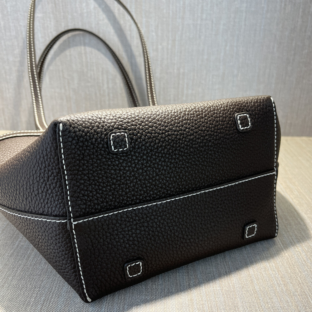페블 송아지 가죽 소재의 클래식 토트백으로, 내부 토글 클로저, 조절 가능한 스트랩이 연결된 내부 손목 스트랩, 대비를 이루는 탑스티칭 디테일이 특징입니다.