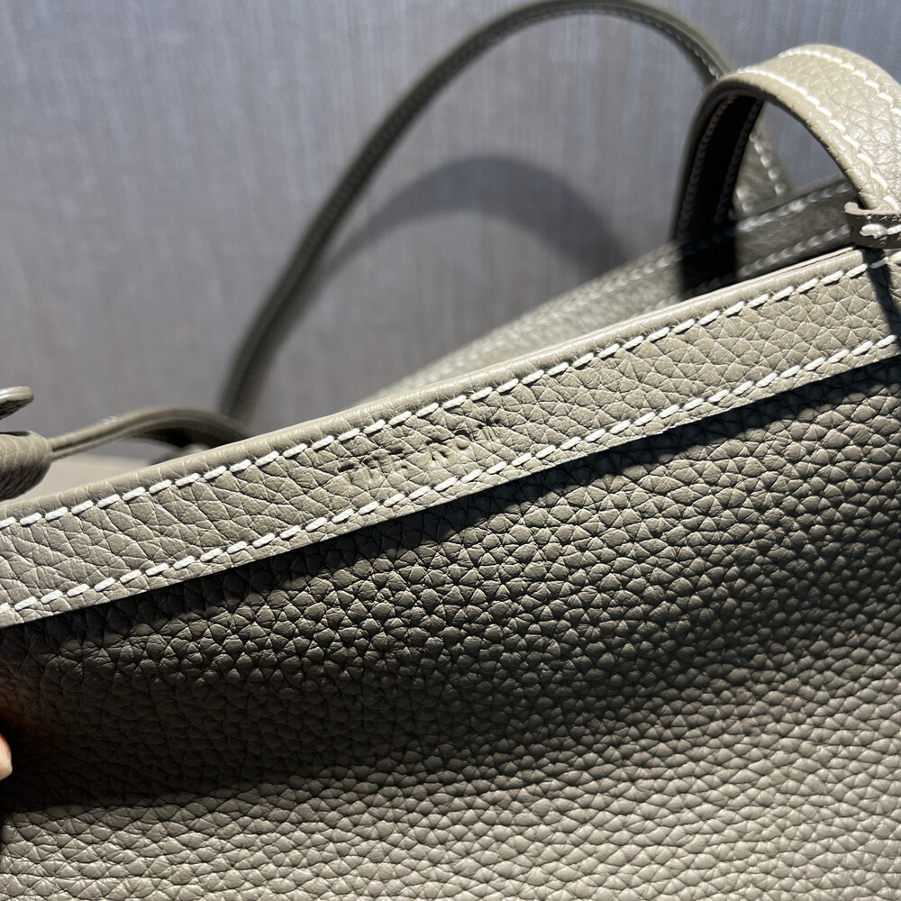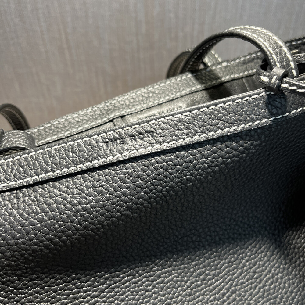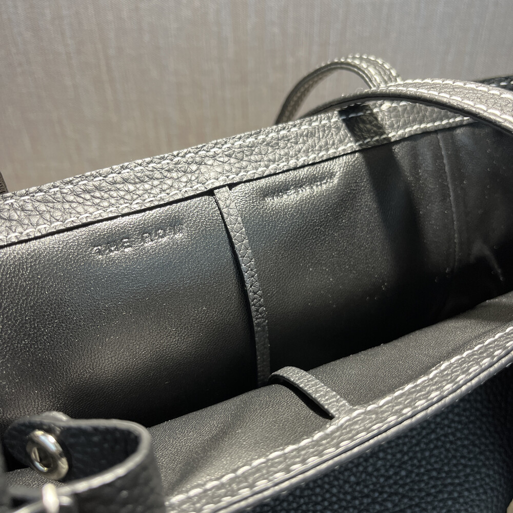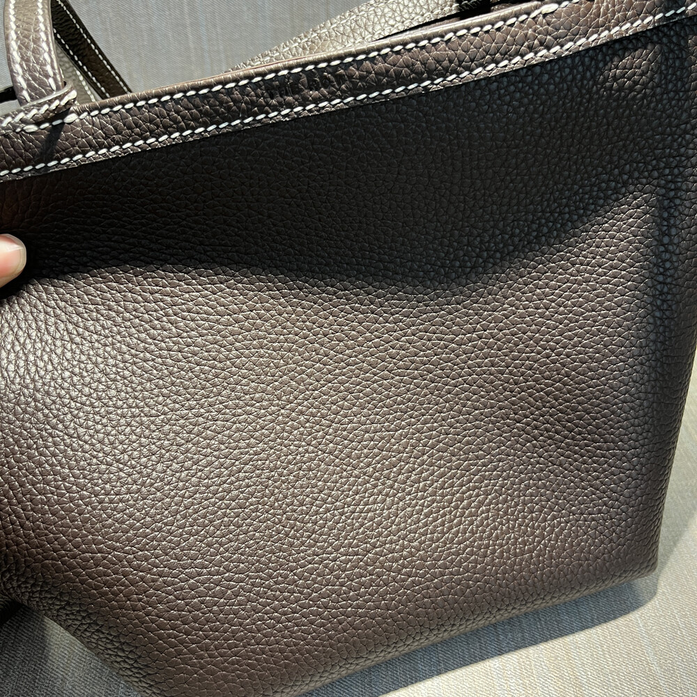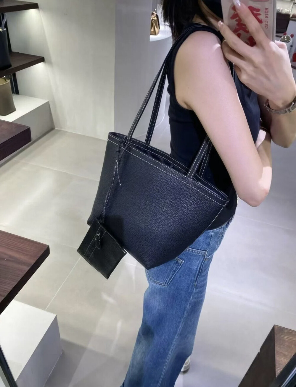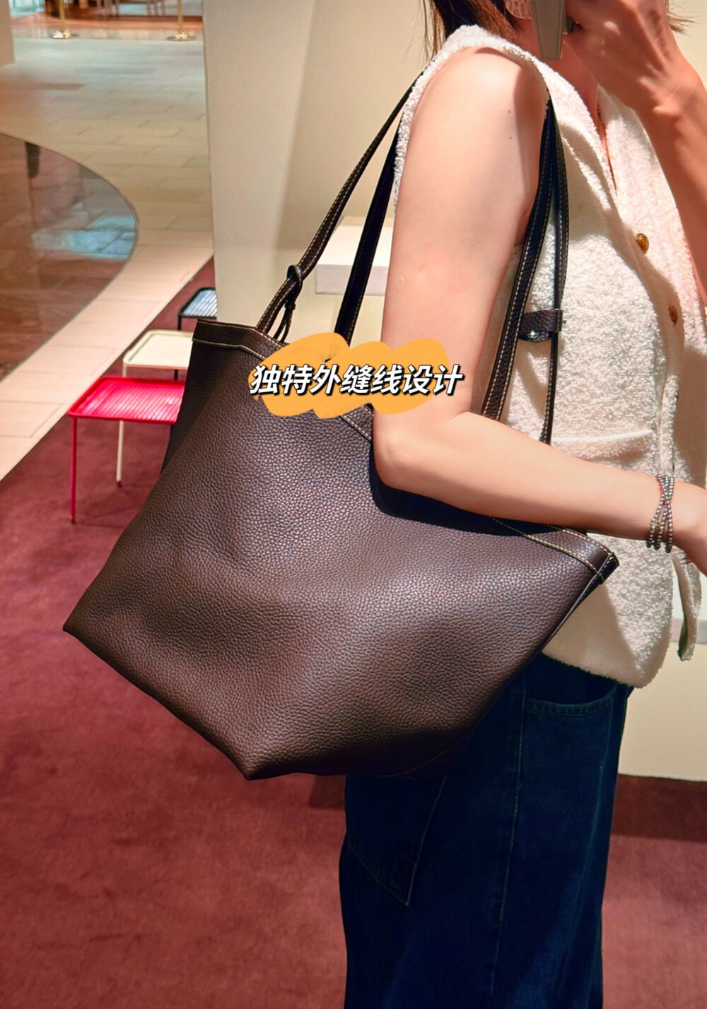 페블 송아지 가죽 소재의 클래식 토트백으로, 내부 토글 클로저, 조절 가능한 스트랩이 연결된 내부 손목 스트랩, 대비를 이루는 탑스티칭 디테일이 특징입니다.