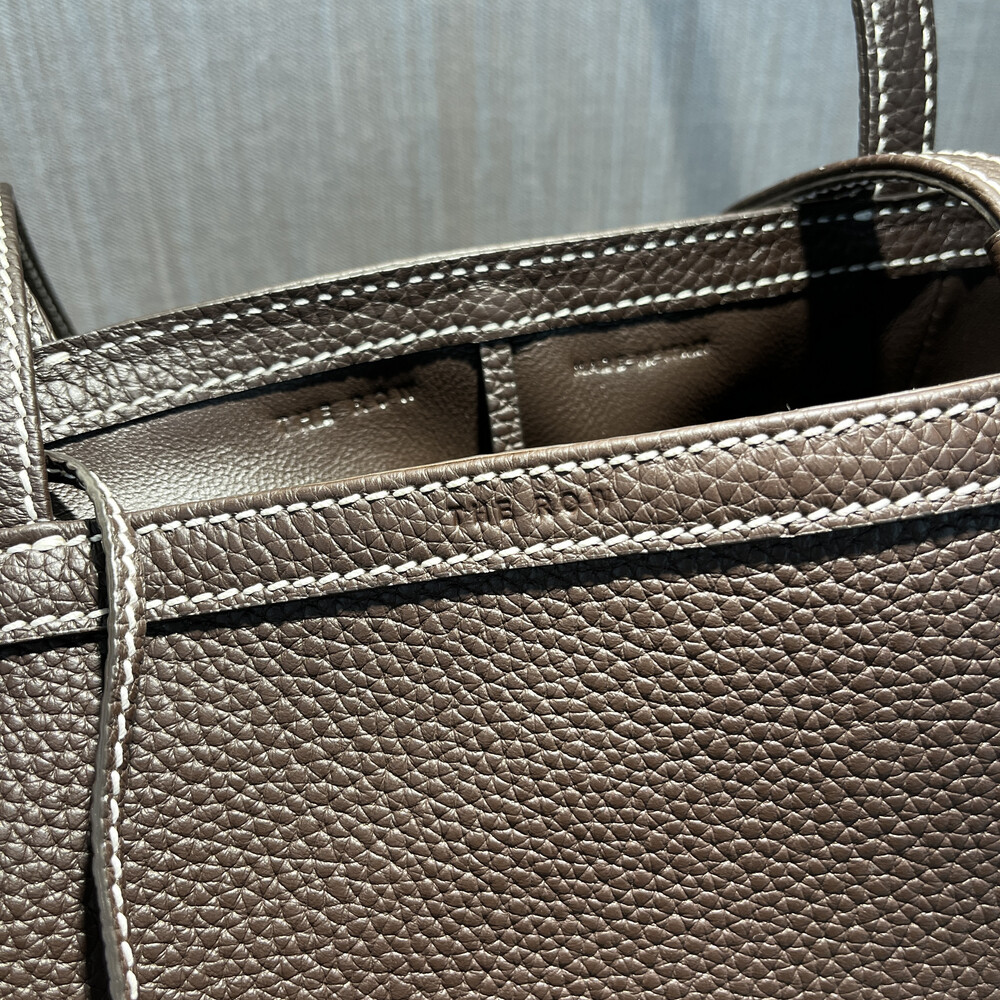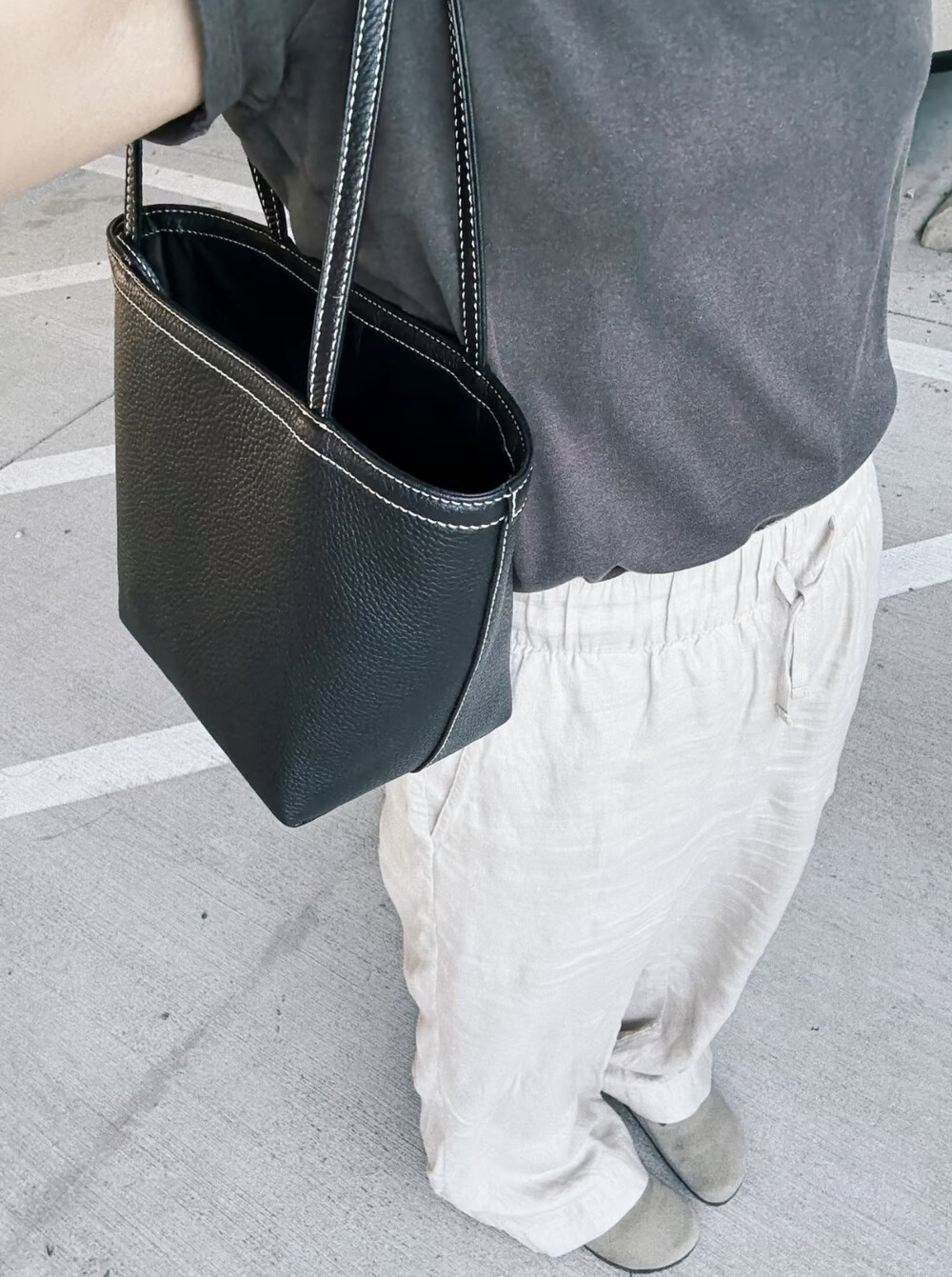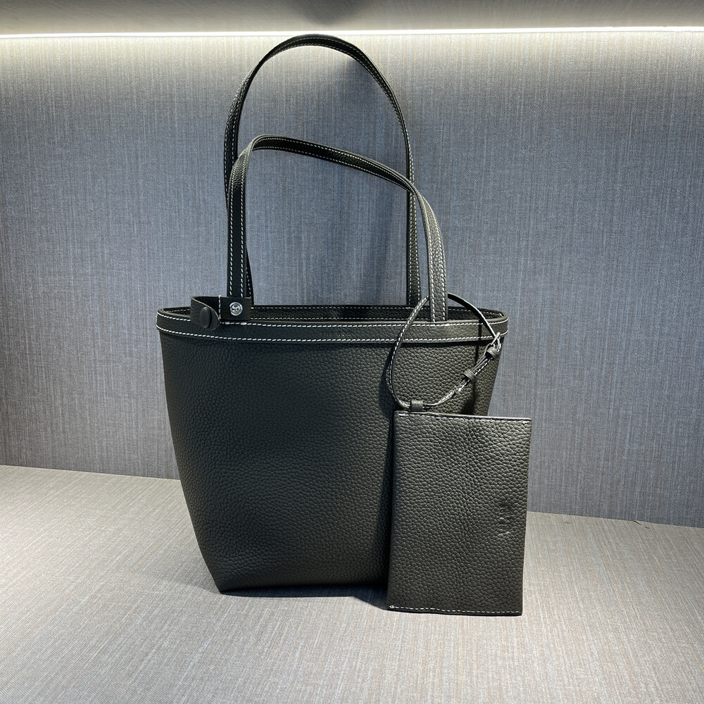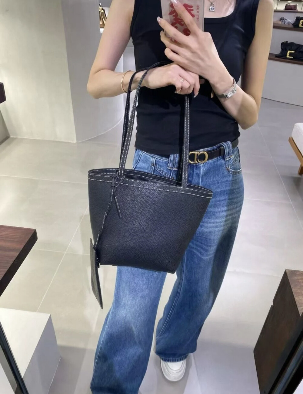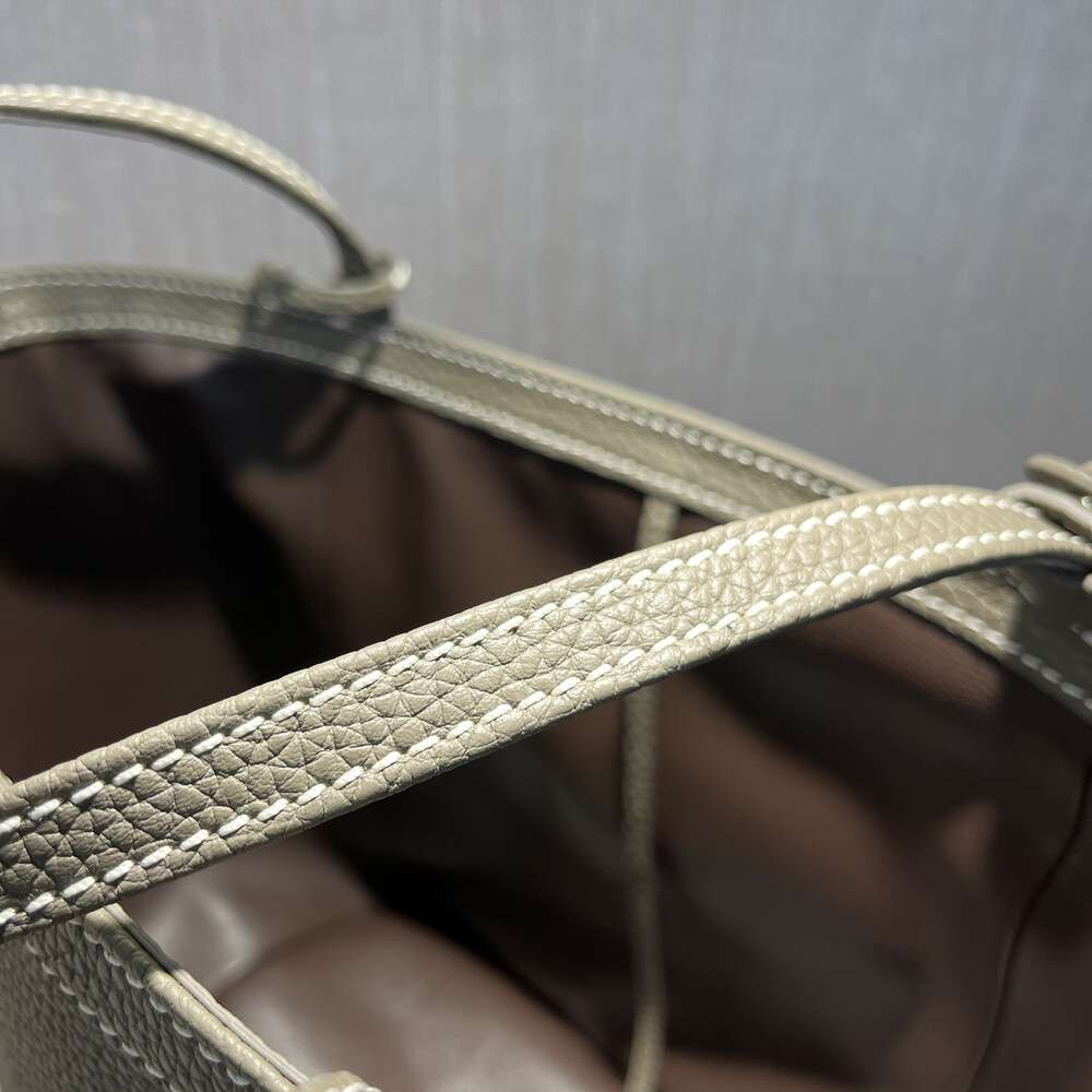 페블 송아지 가죽 소재의 클래식 토트백으로, 내부 토글 클로저, 조절 가능한 스트랩이 연결된 내부 손목 스트랩, 대비를 이루는 탑스티칭 디테일이 특징입니다.