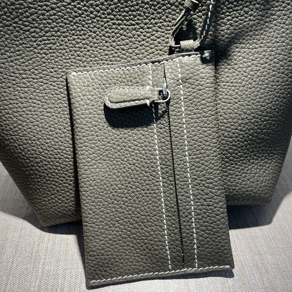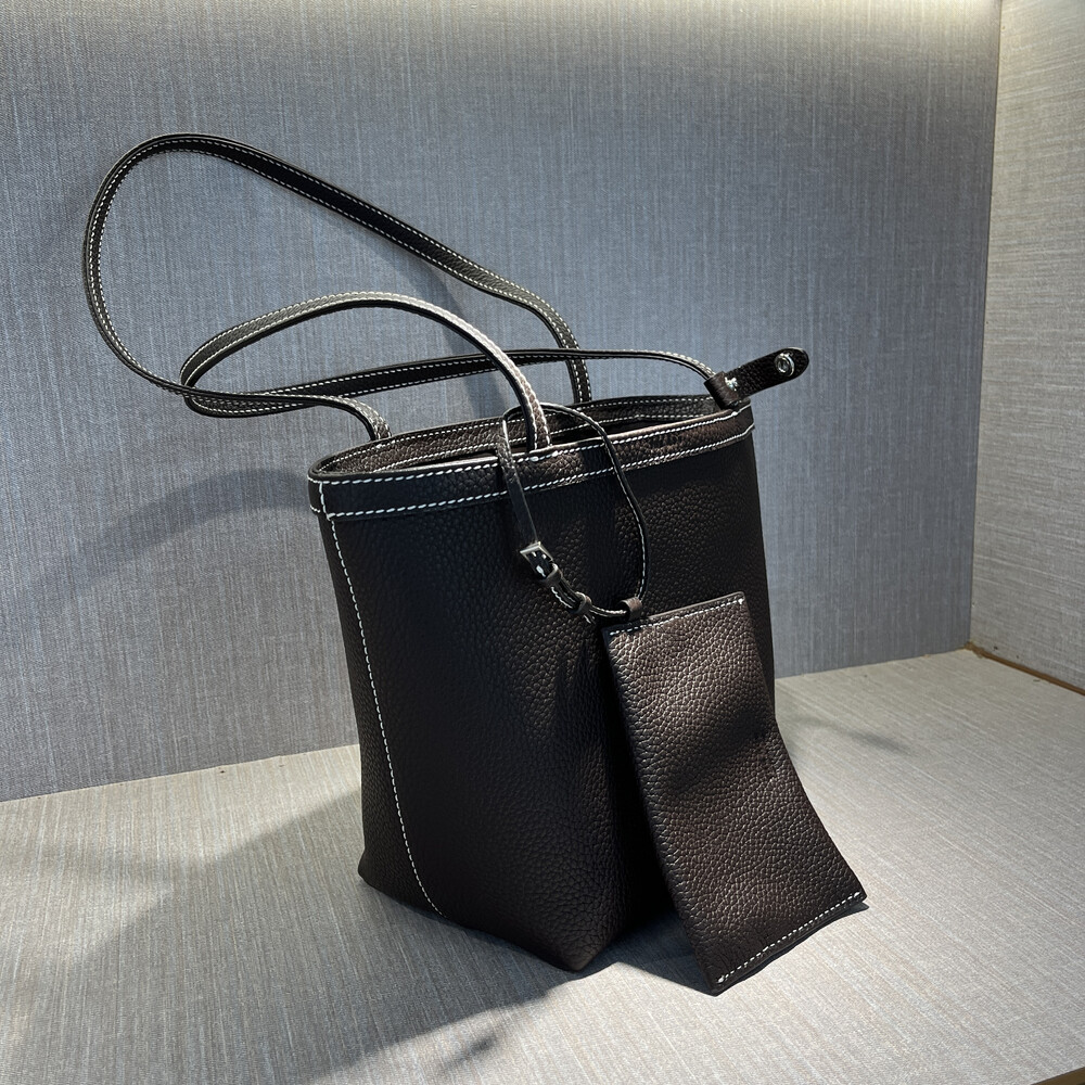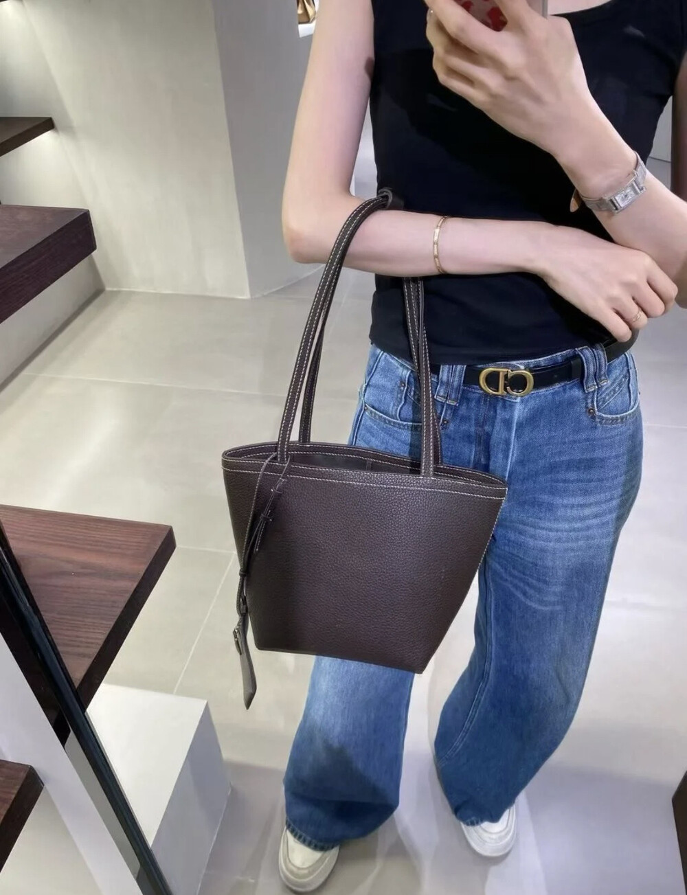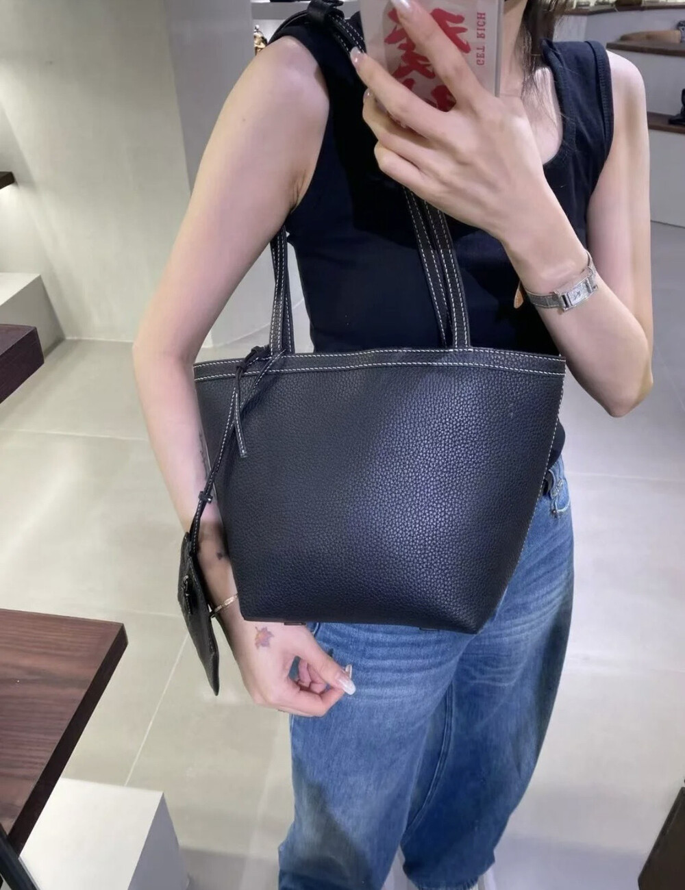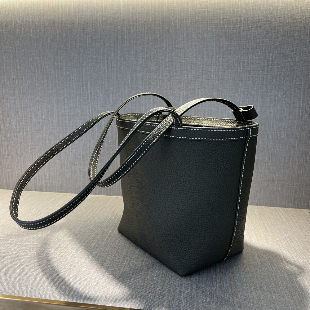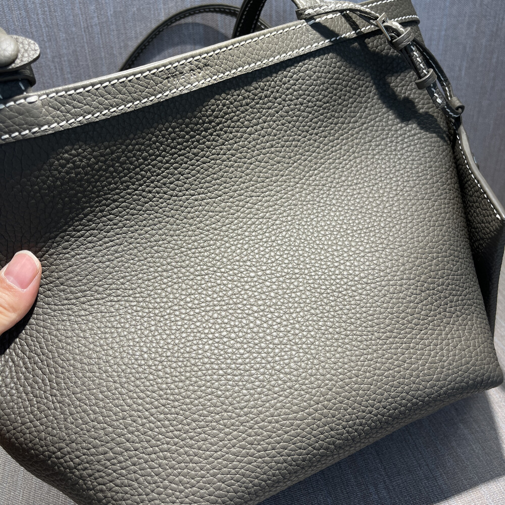 페블 송아지 가죽 소재의 클래식 토트백으로, 내부 토글 클로저, 조절 가능한 스트랩이 연결된 내부 손목 스트랩, 대비를 이루는 탑스티칭 디테일이 특징입니다.