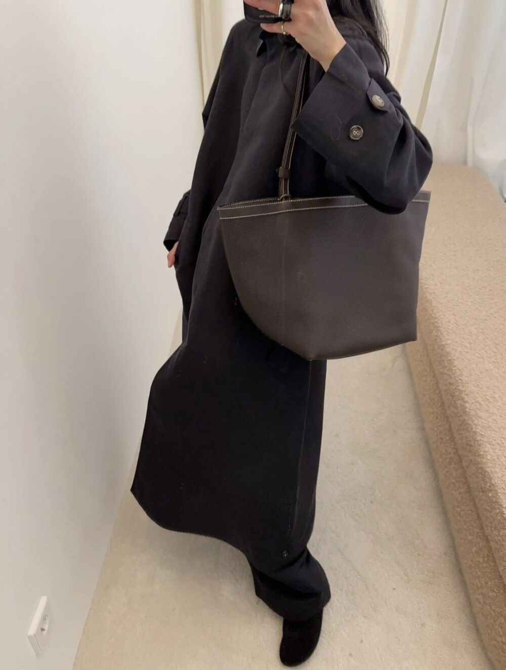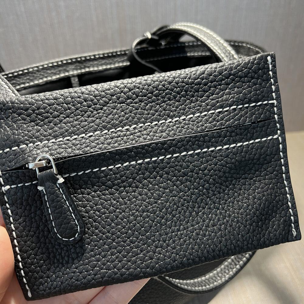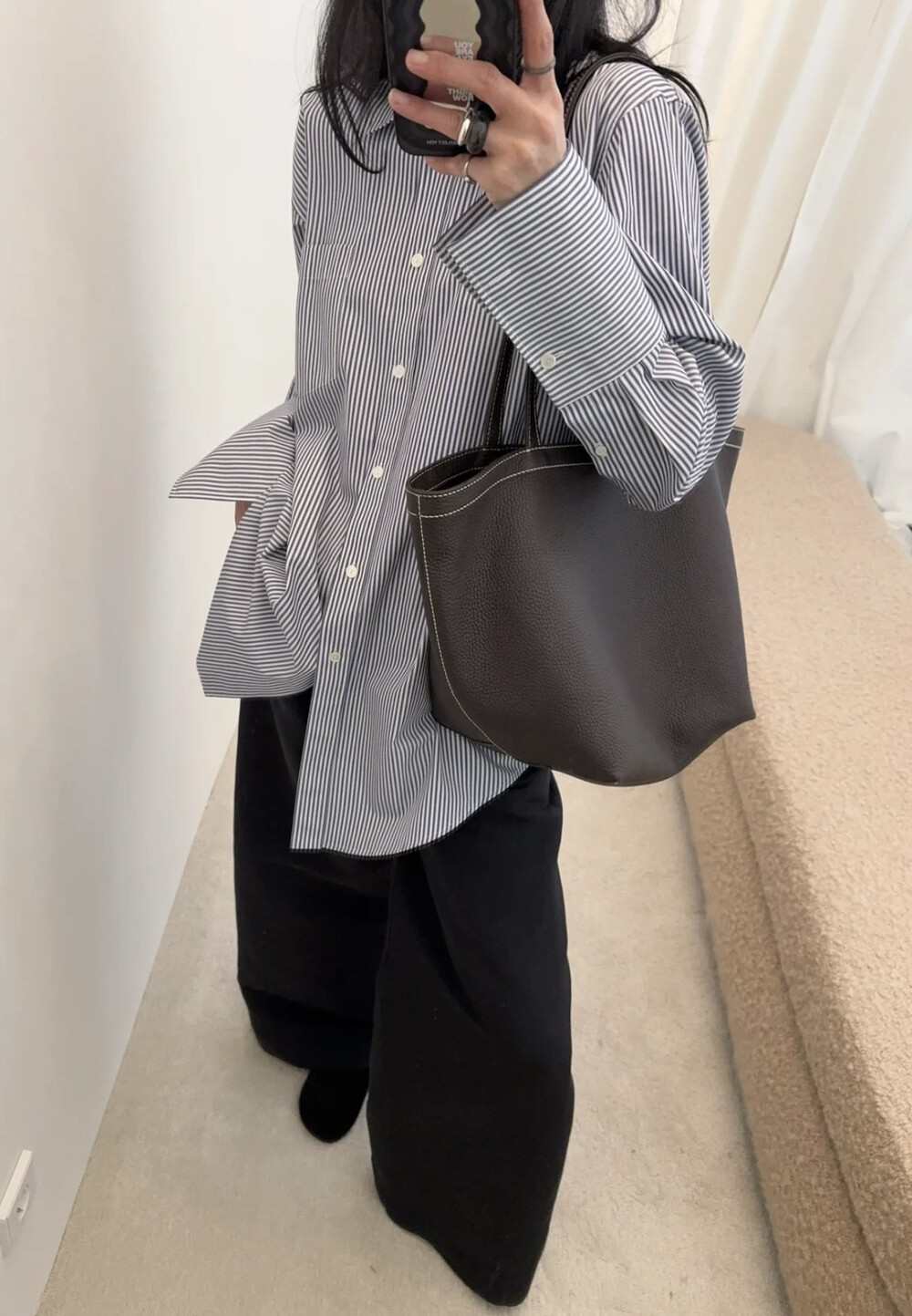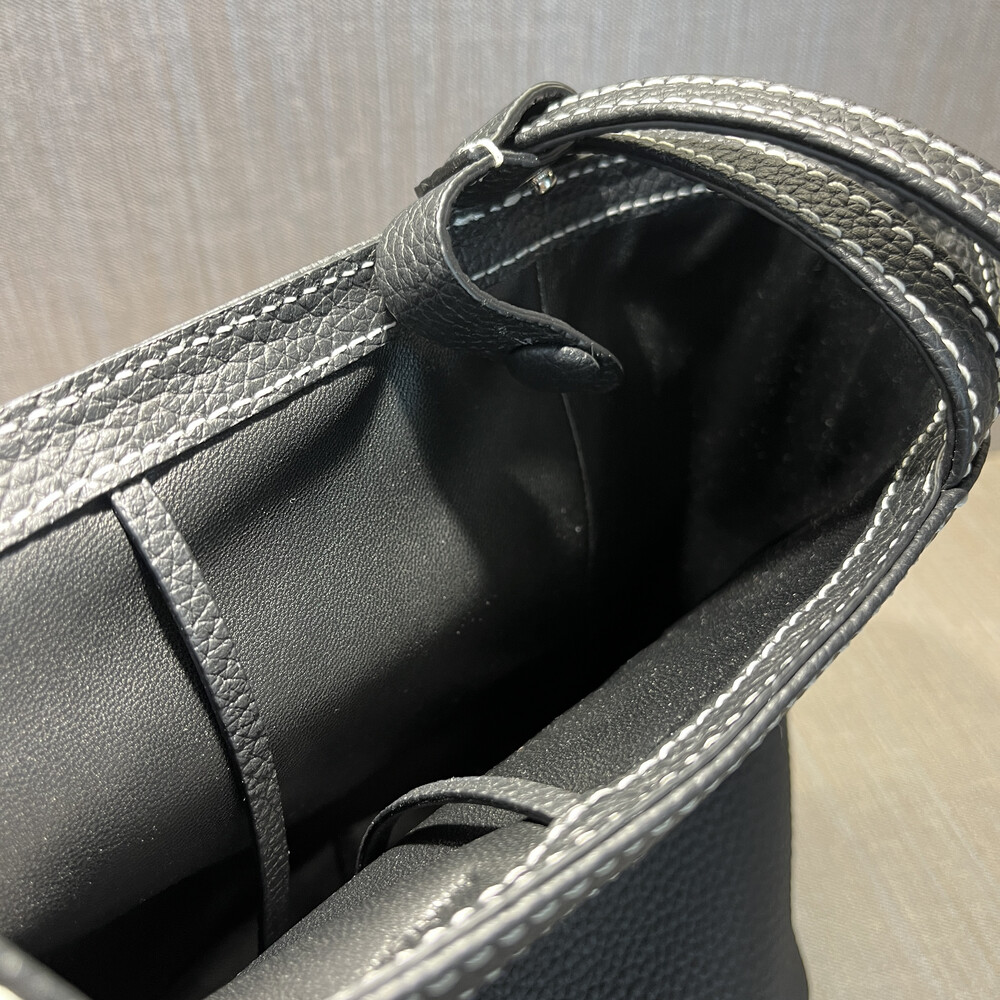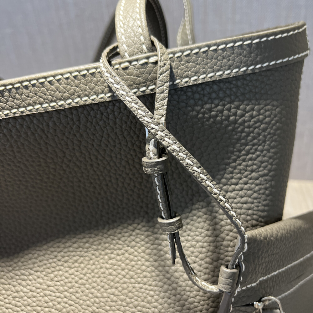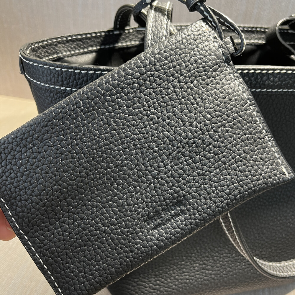 페블 송아지 가죽 소재의 클래식 토트백으로, 내부 토글 클로저, 조절 가능한 스트랩이 연결된 내부 손목 스트랩, 대비를 이루는 탑스티칭 디테일이 특징입니다.
