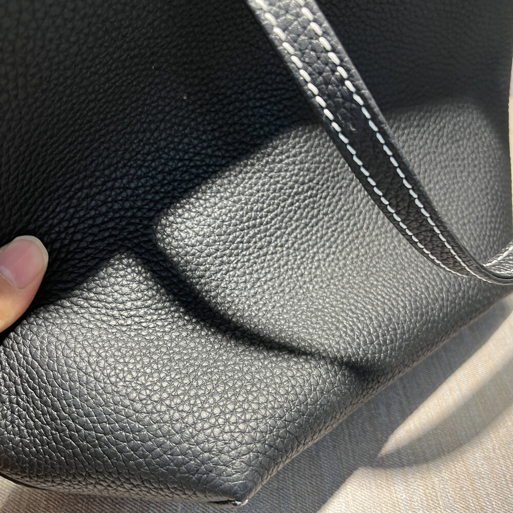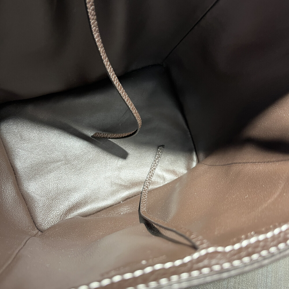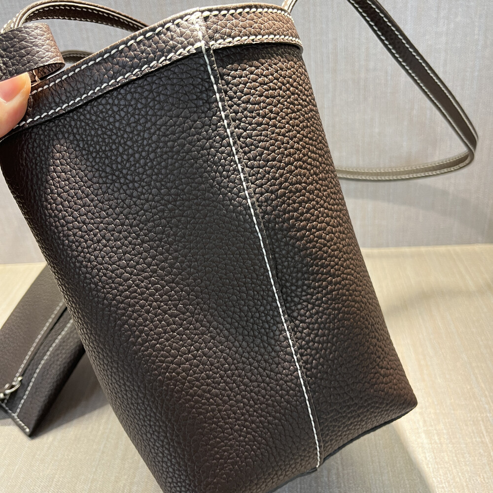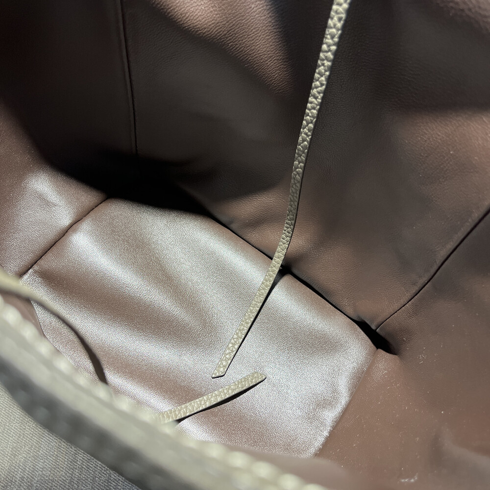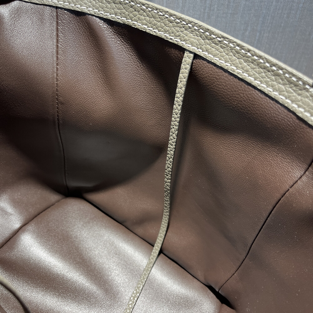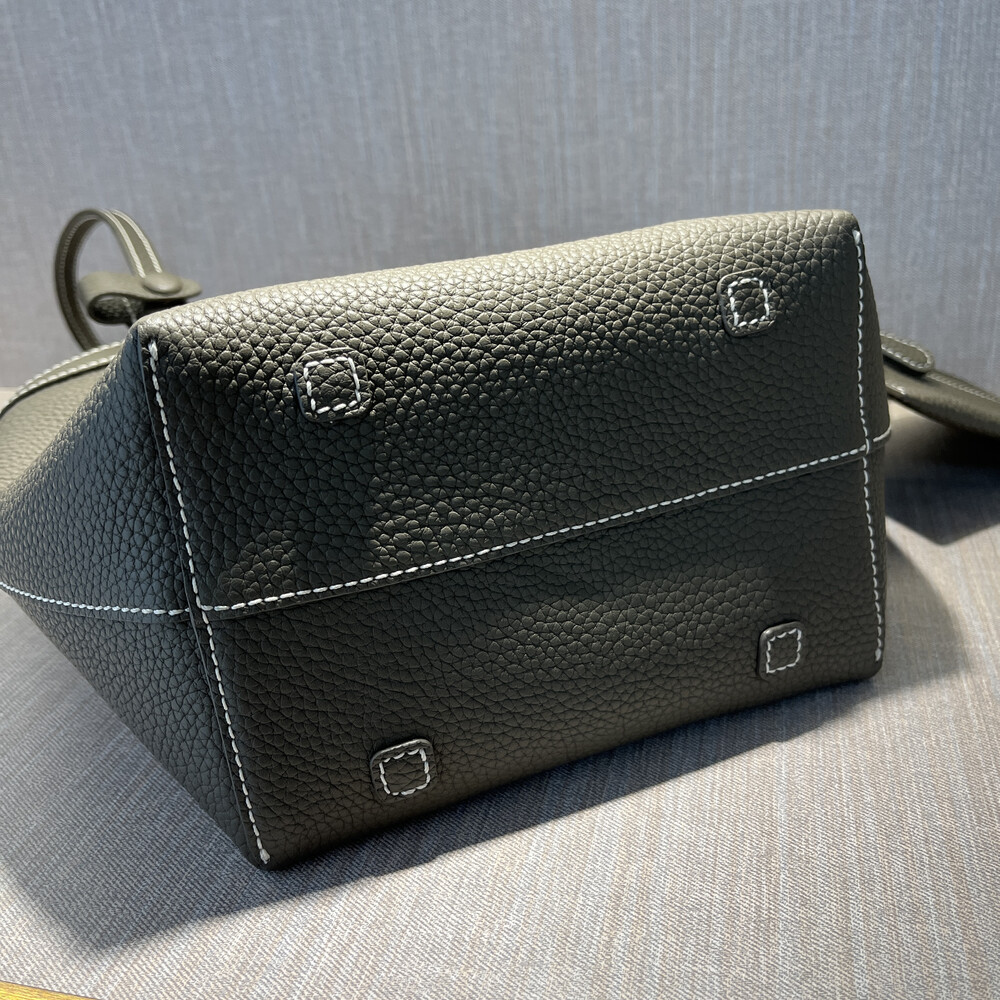 페블 송아지 가죽 소재의 클래식 토트백으로, 내부 토글 클로저, 조절 가능한 스트랩이 연결된 내부 손목 스트랩, 대비를 이루는 탑스티칭 디테일이 특징입니다.