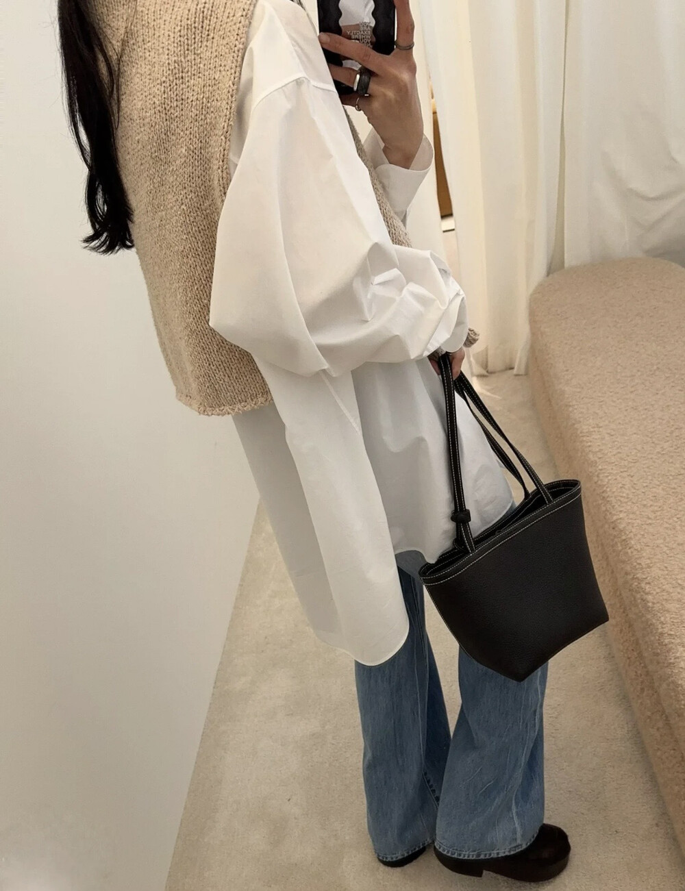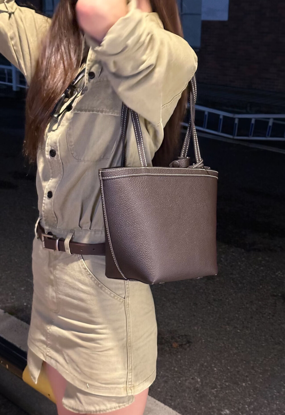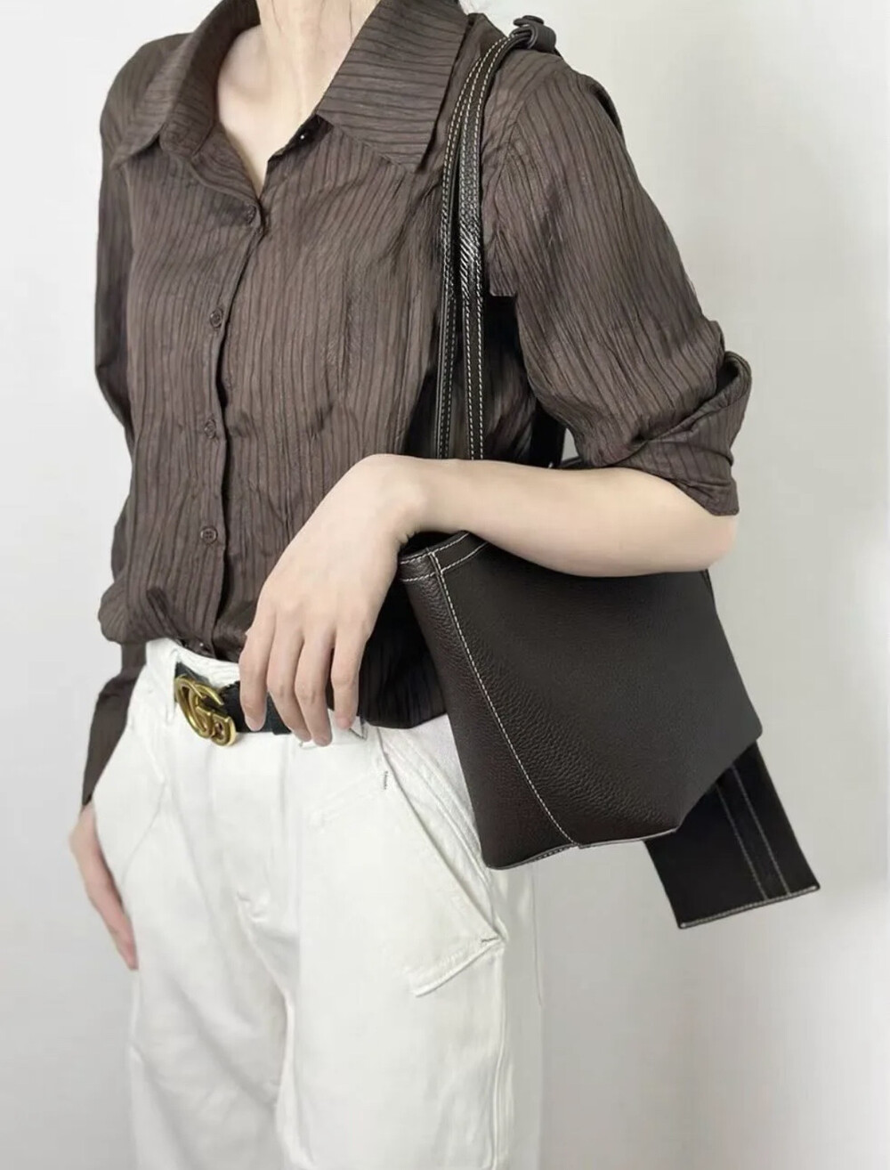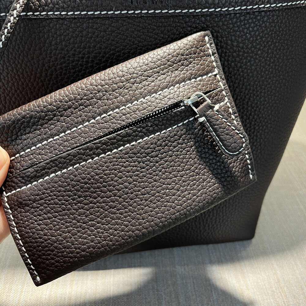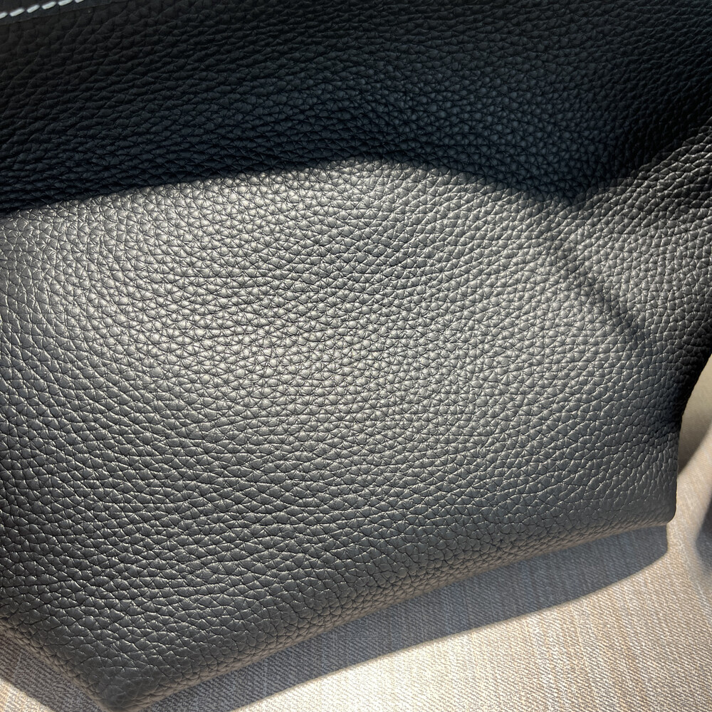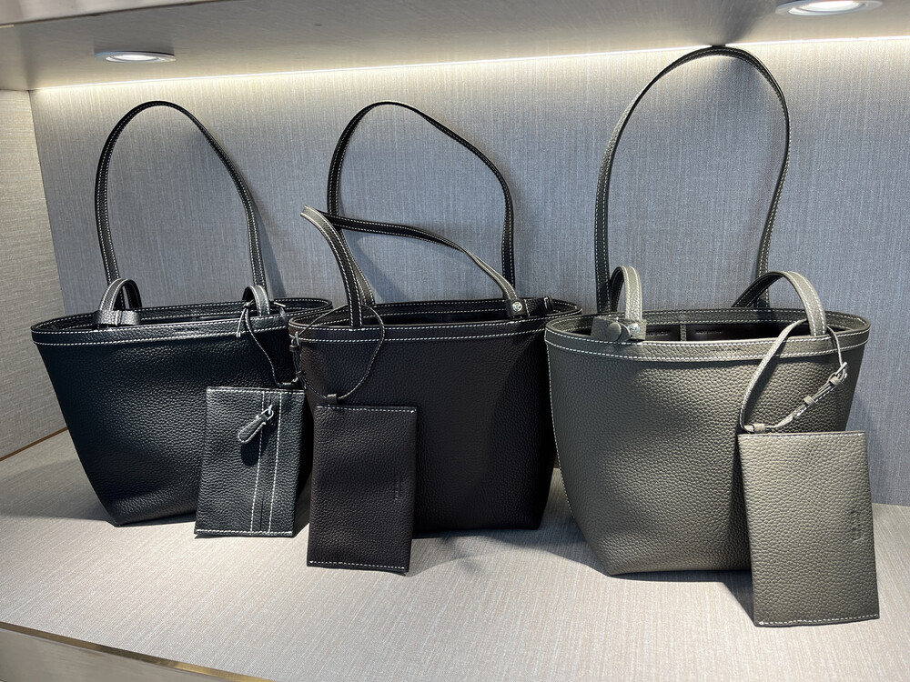 페블 송아지 가죽 소재의 클래식 토트백으로, 내부 토글 클로저, 조절 가능한 스트랩이 연결된 내부 손목 스트랩, 대비를 이루는 탑스티칭 디테일이 특징입니다.