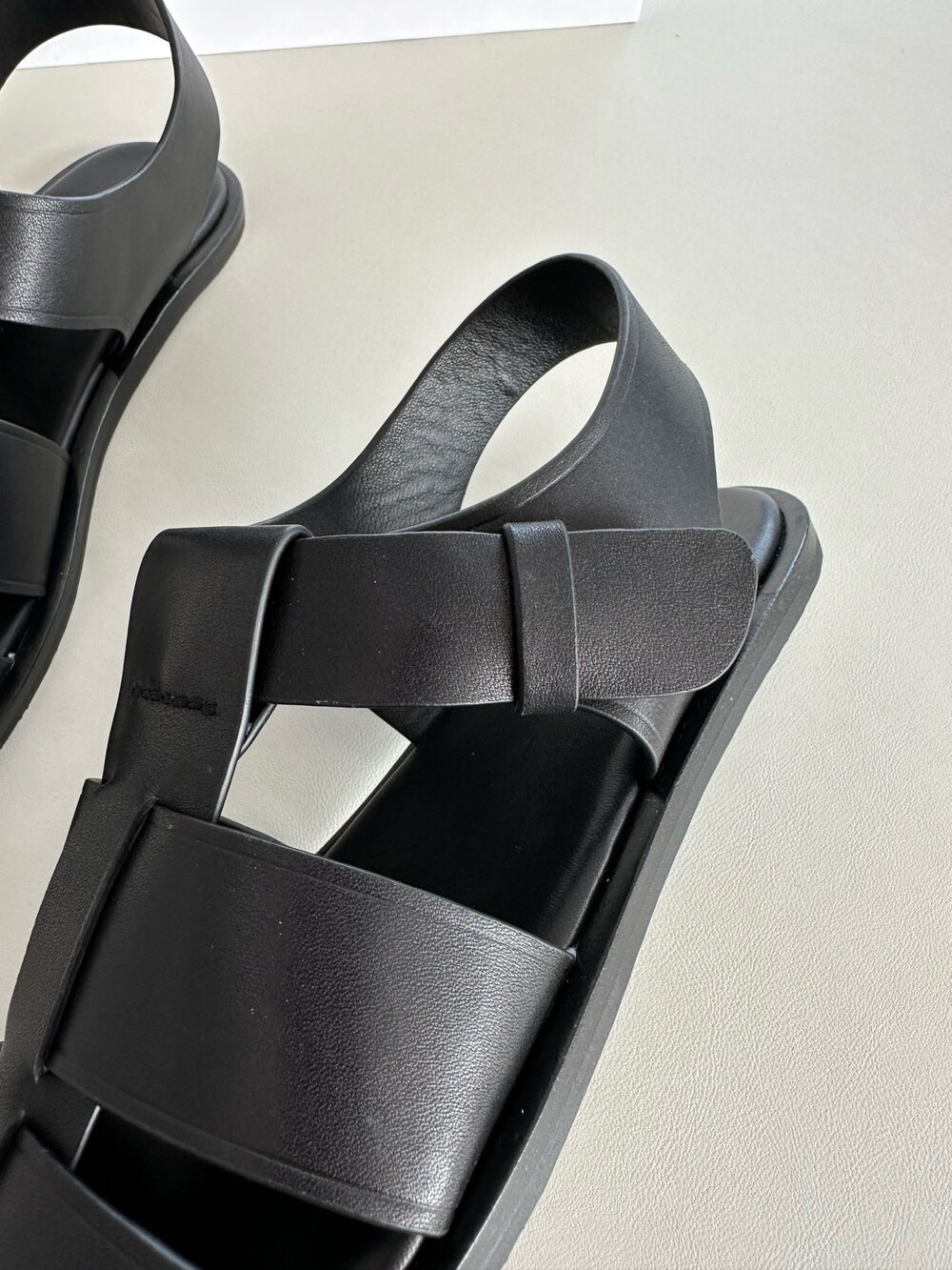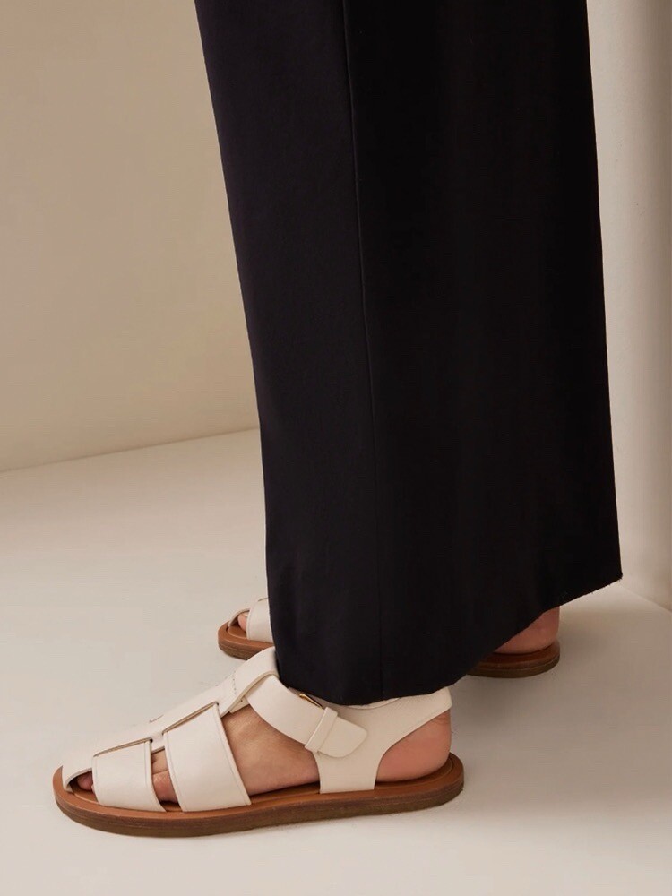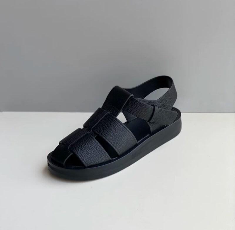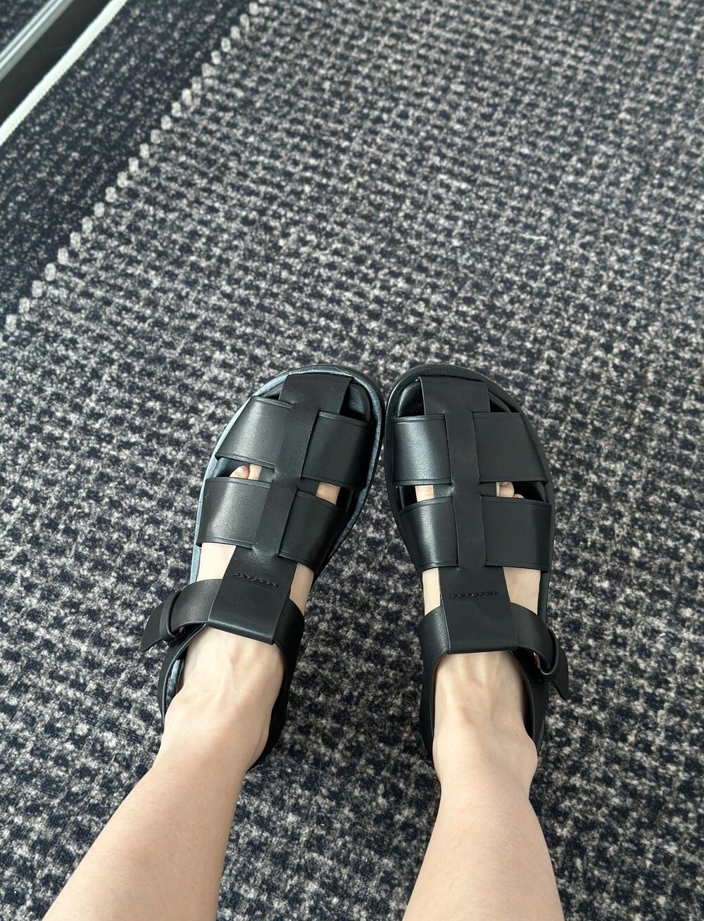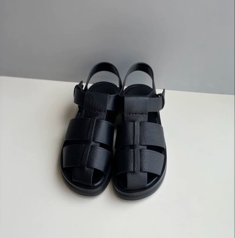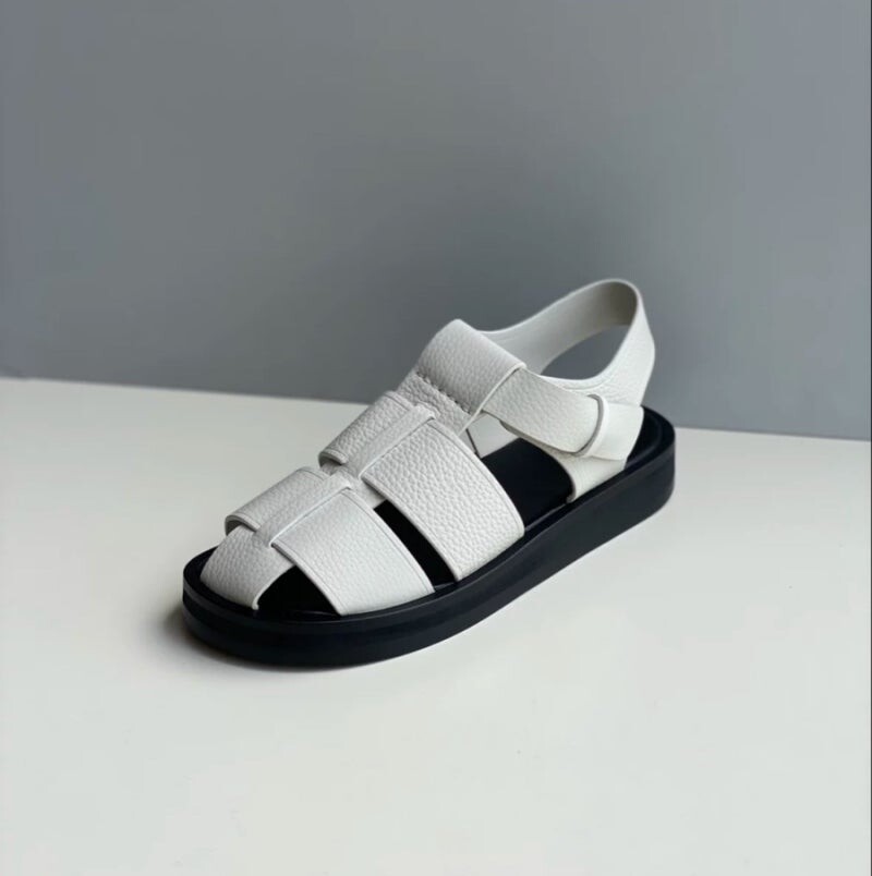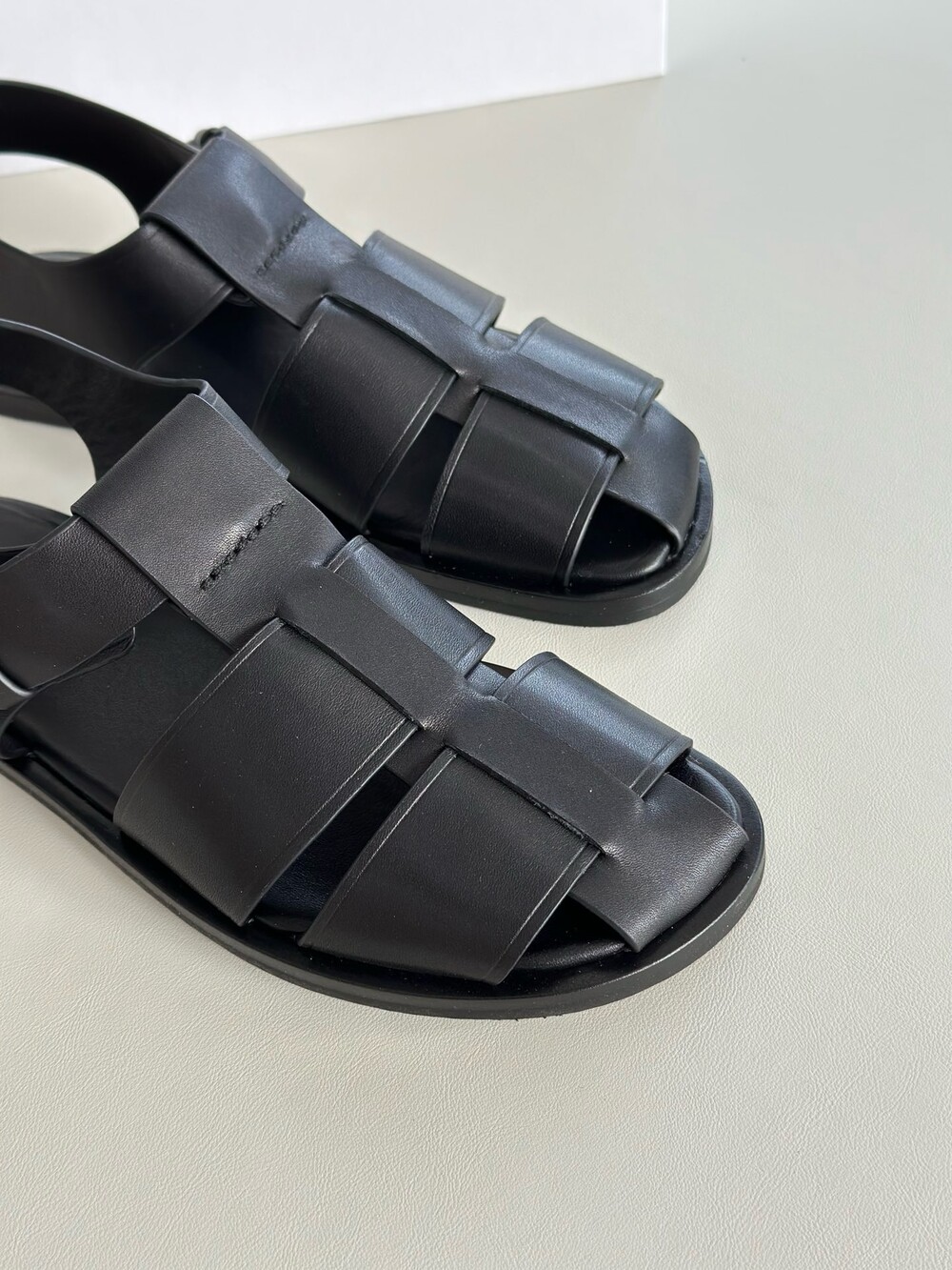 그레인 카프스킨 가죽 소재의 피셔맨 스타일 샌들. 심리스 스트랩 디자인 및