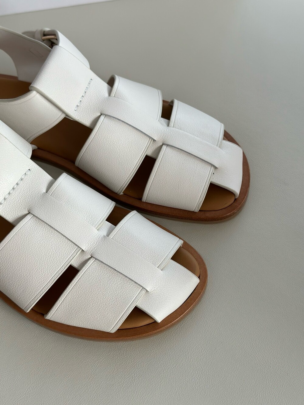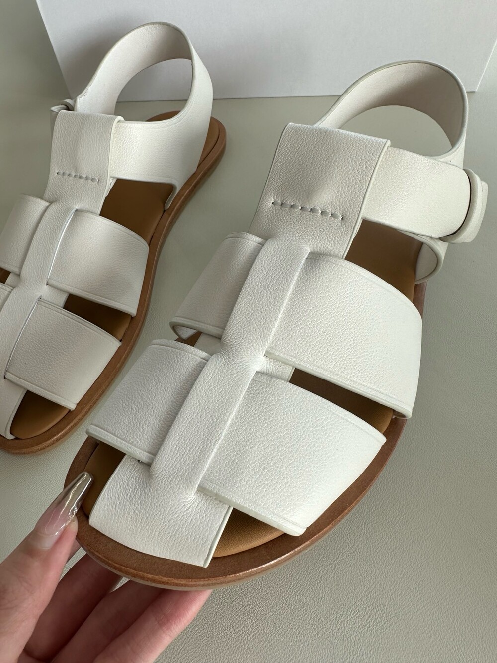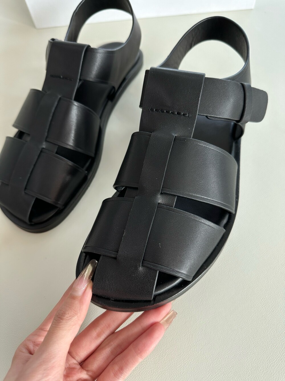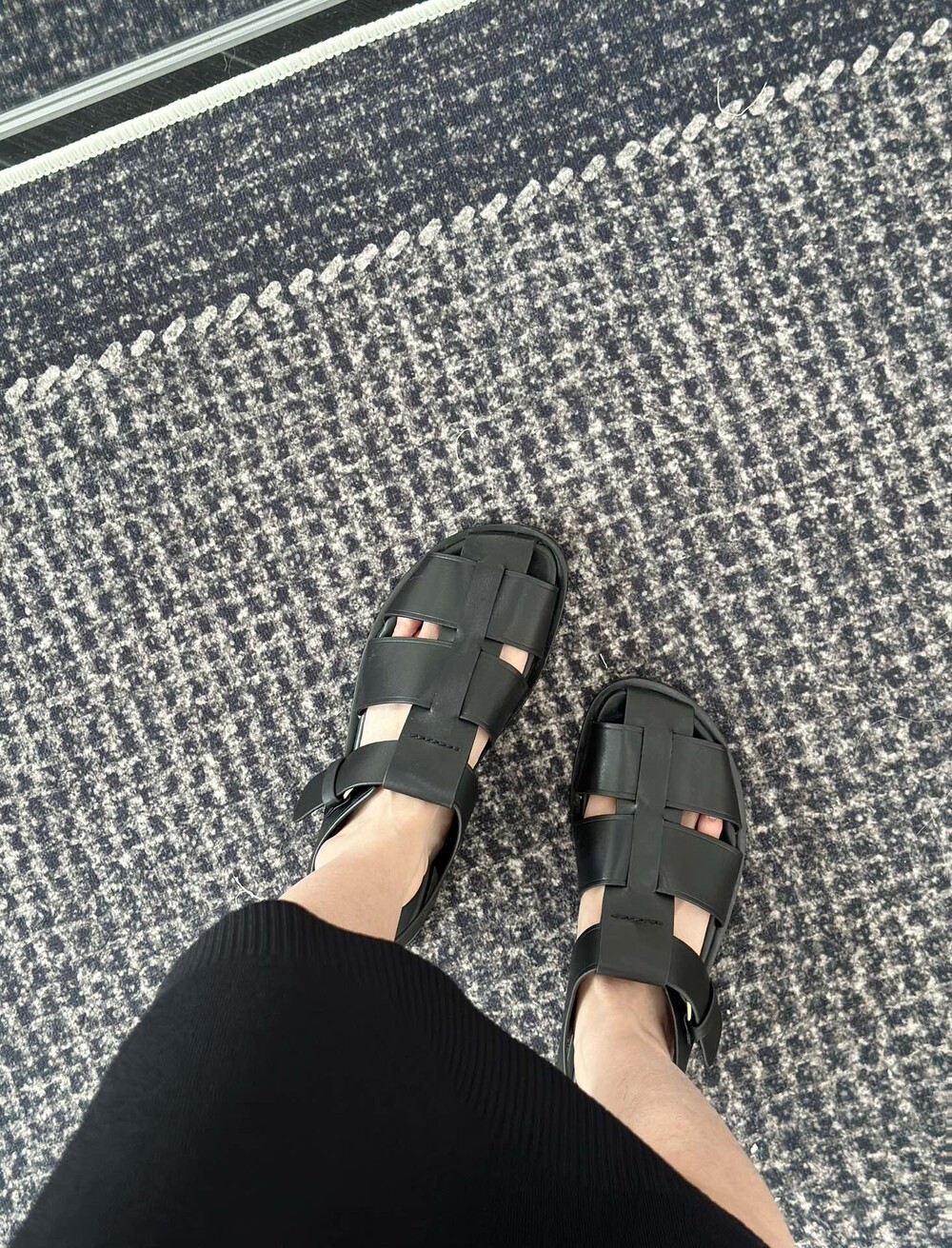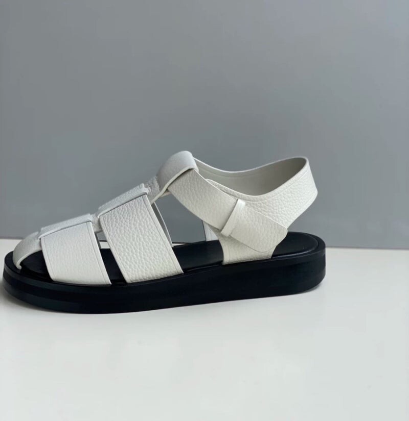 그레인 카프스킨 가죽 소재의 피셔맨 스타일 샌들. 심리스 스트랩 디자인 및