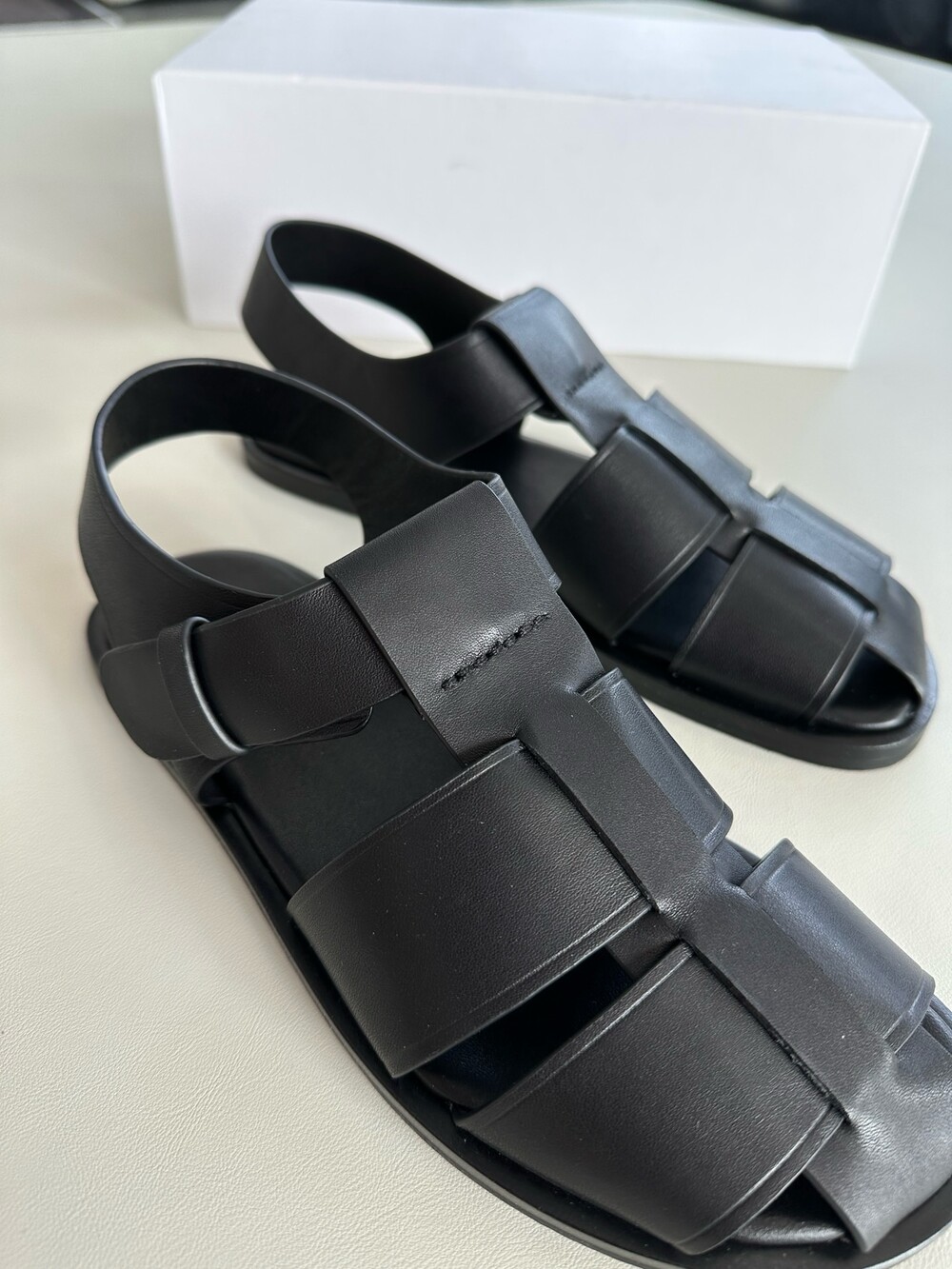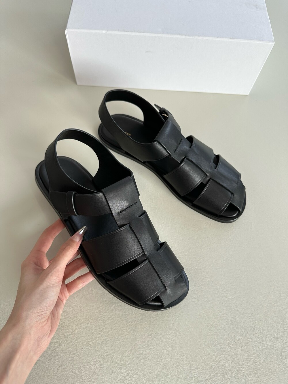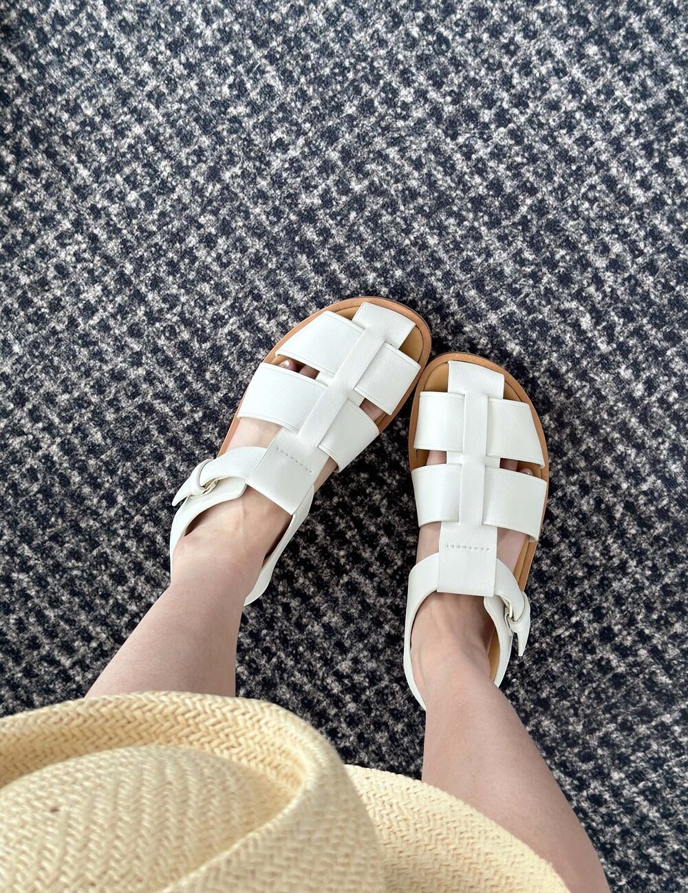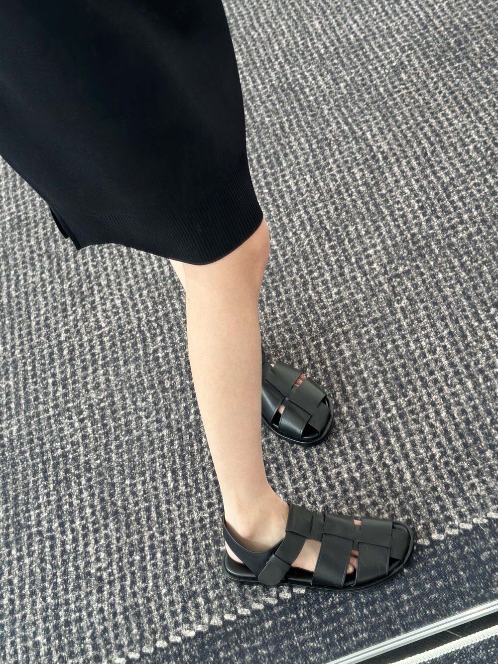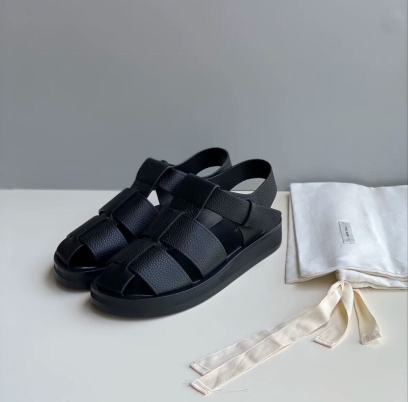 그레인 카프스킨 가죽 소재의 피셔맨 스타일 샌들. 심리스 스트랩 디자인 및
