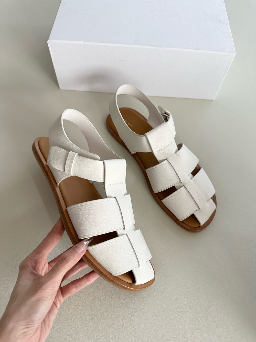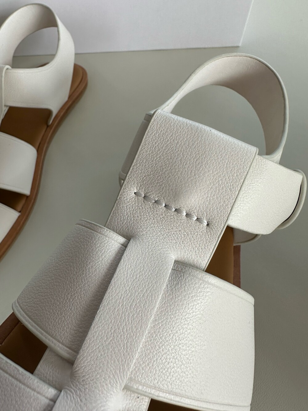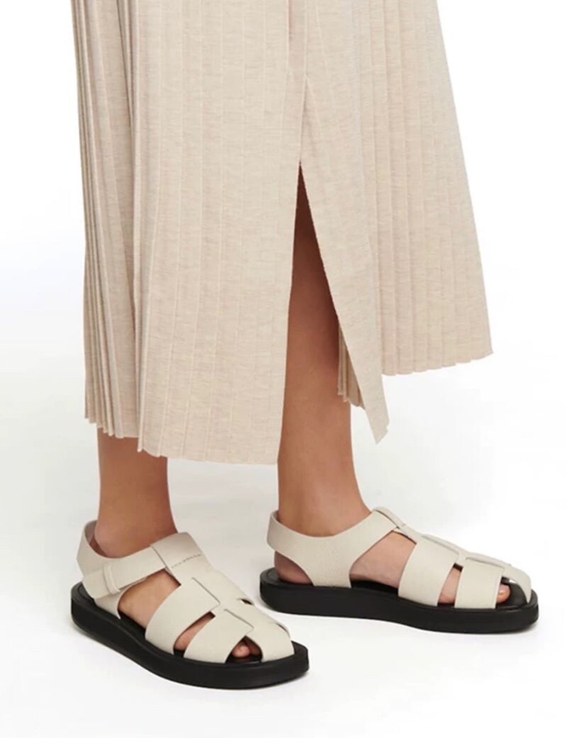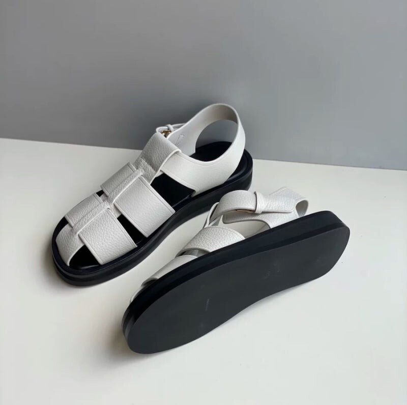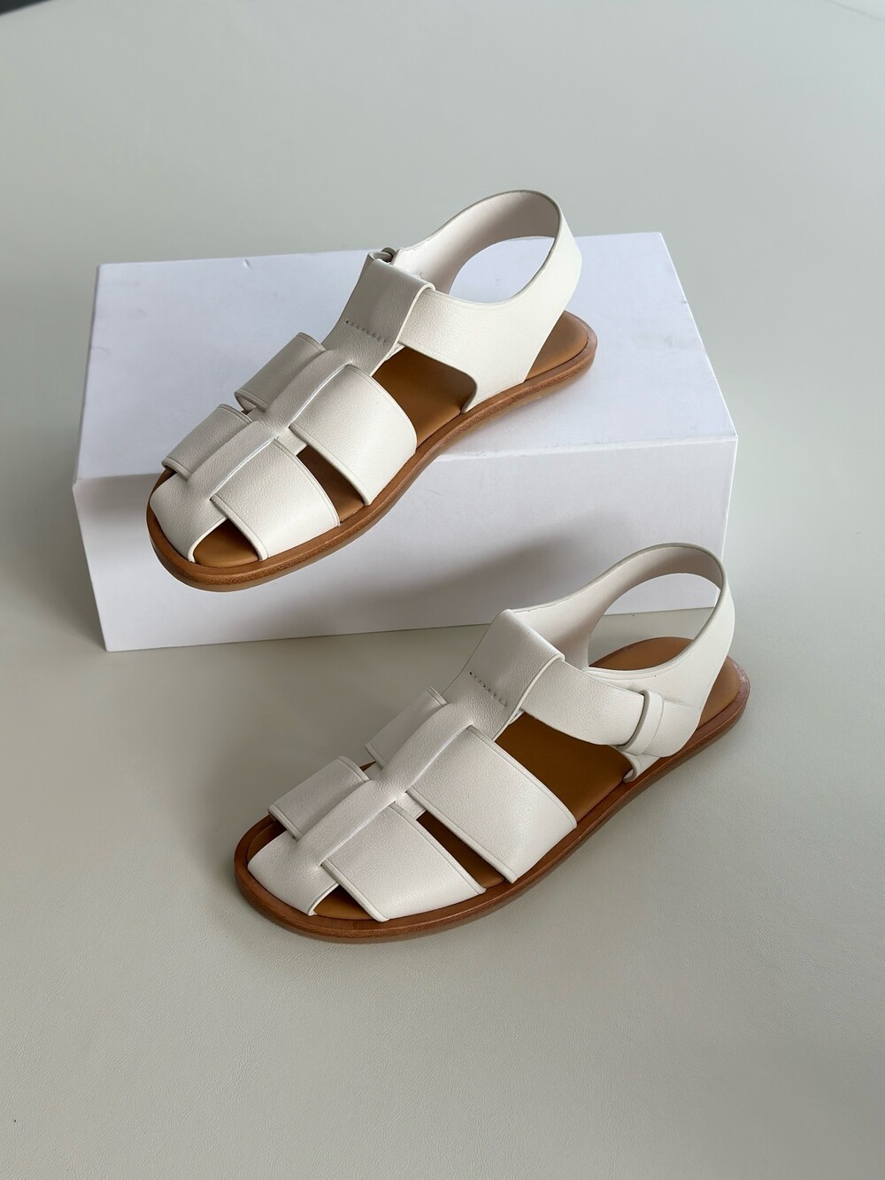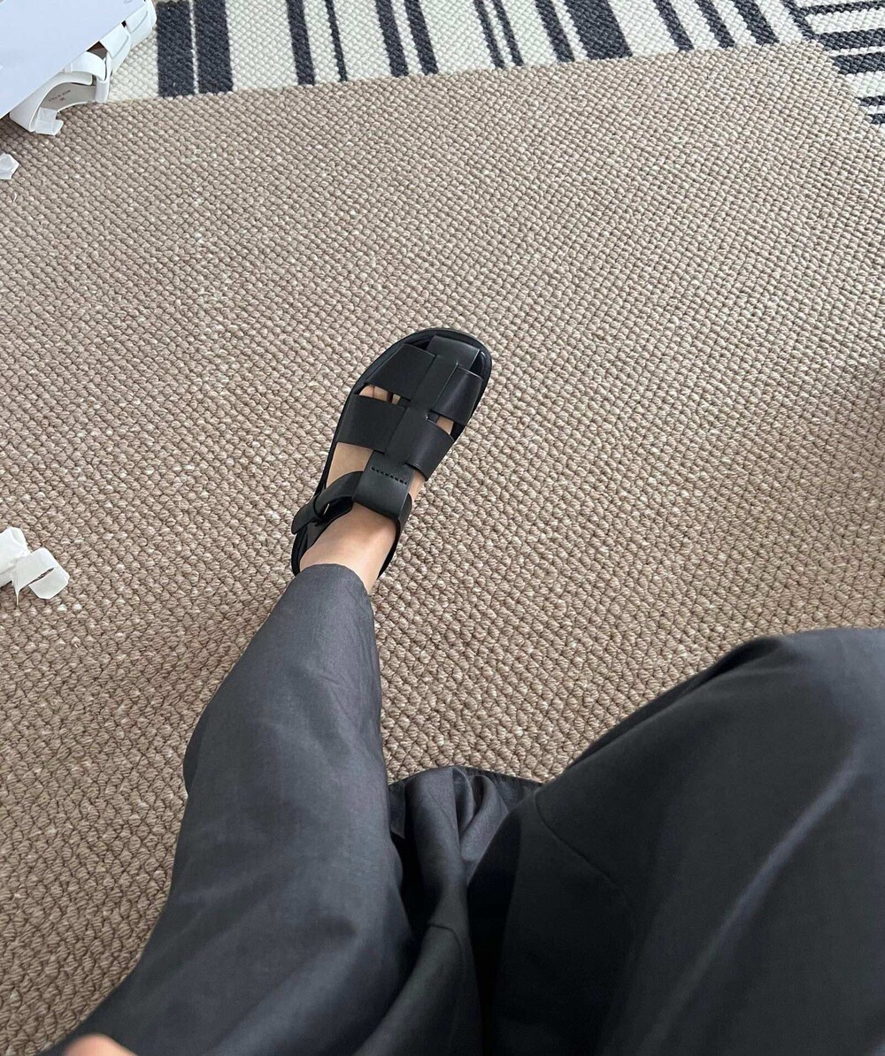 그레인 카프스킨 가죽 소재의 피셔맨 스타일 샌들. 심리스 스트랩 디자인 및