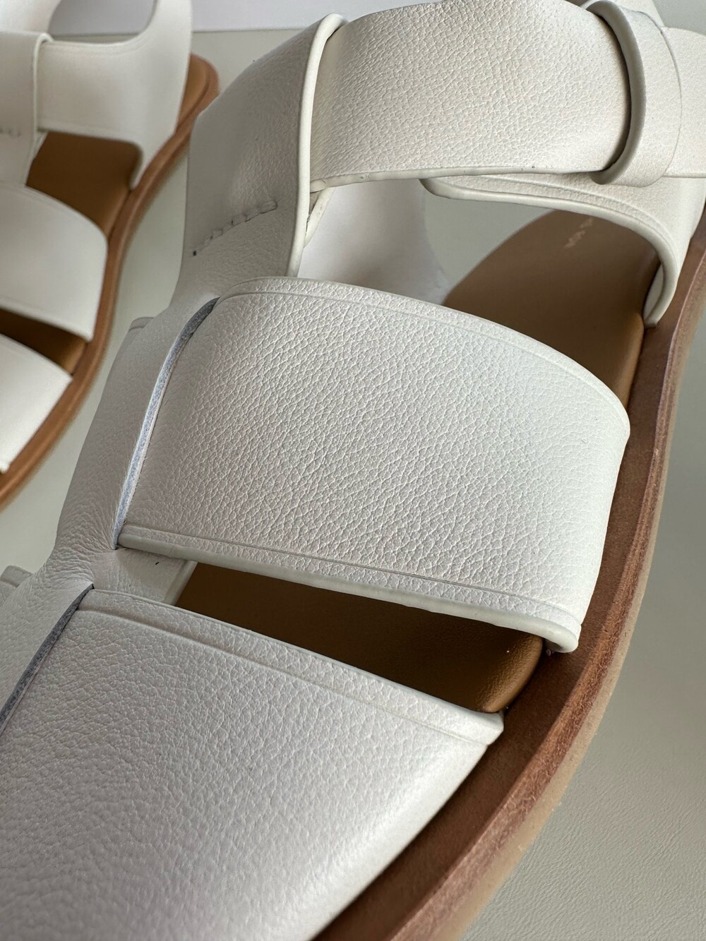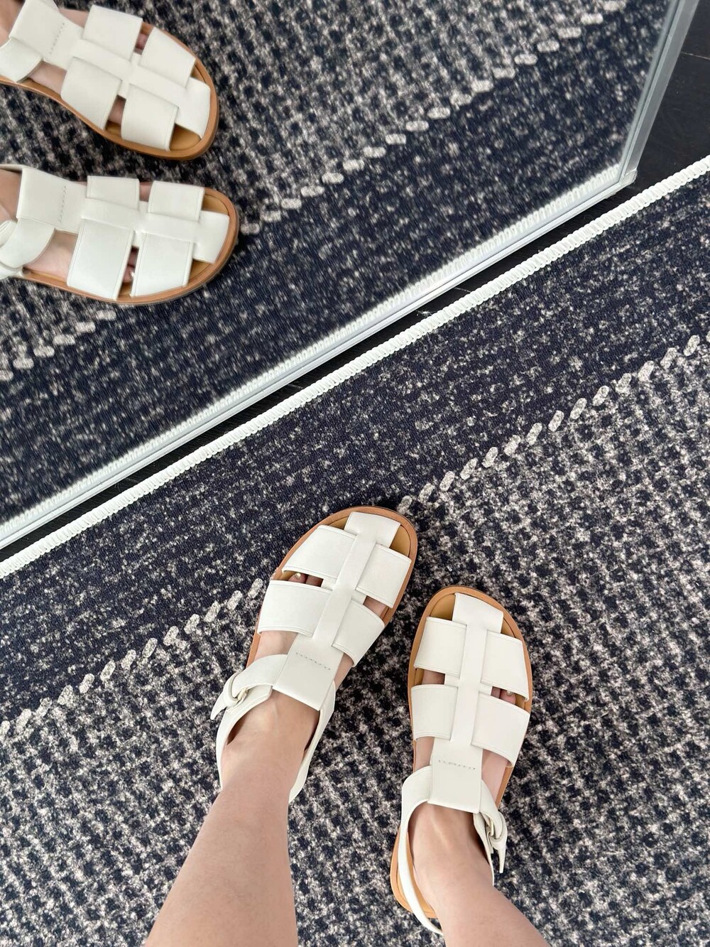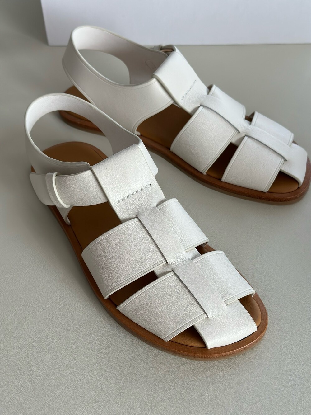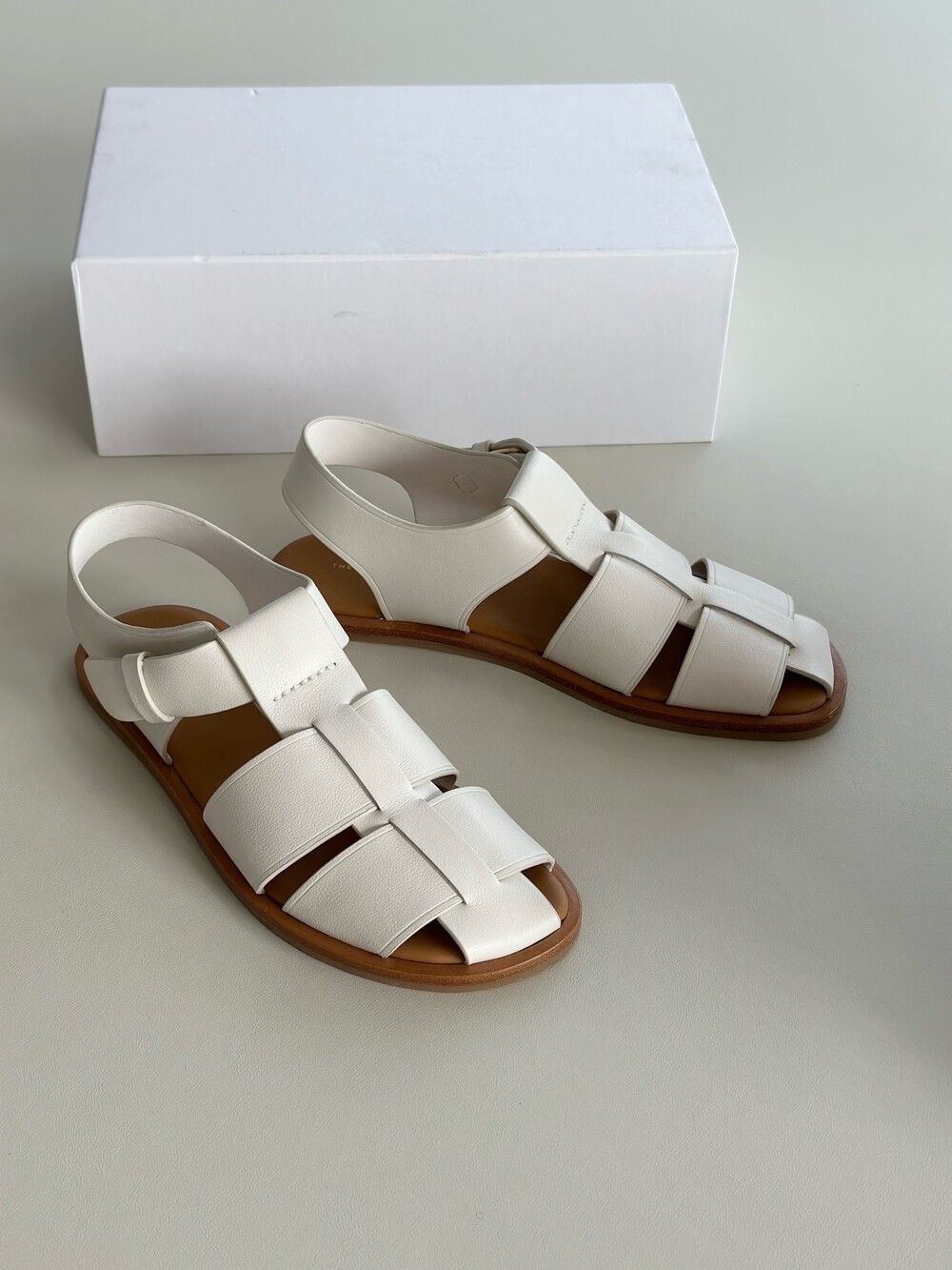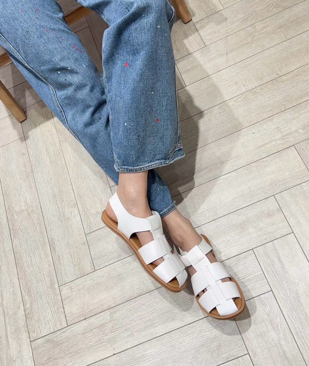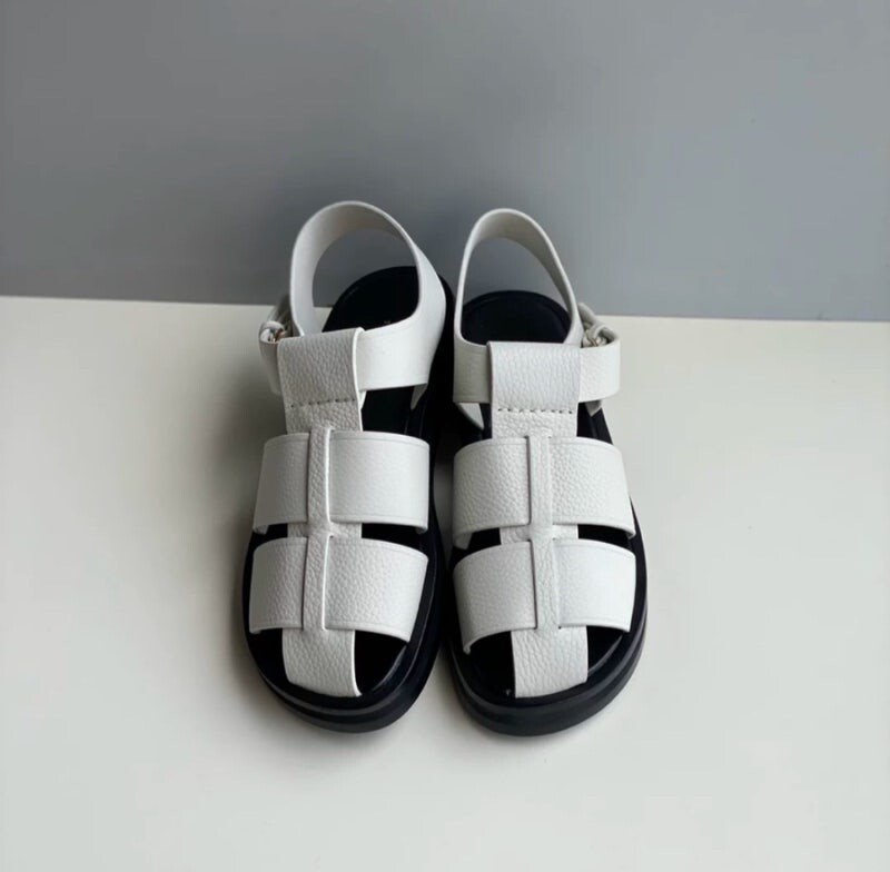 그레인 카프스킨 가죽 소재의 피셔맨 스타일 샌들. 심리스 스트랩 디자인 및
