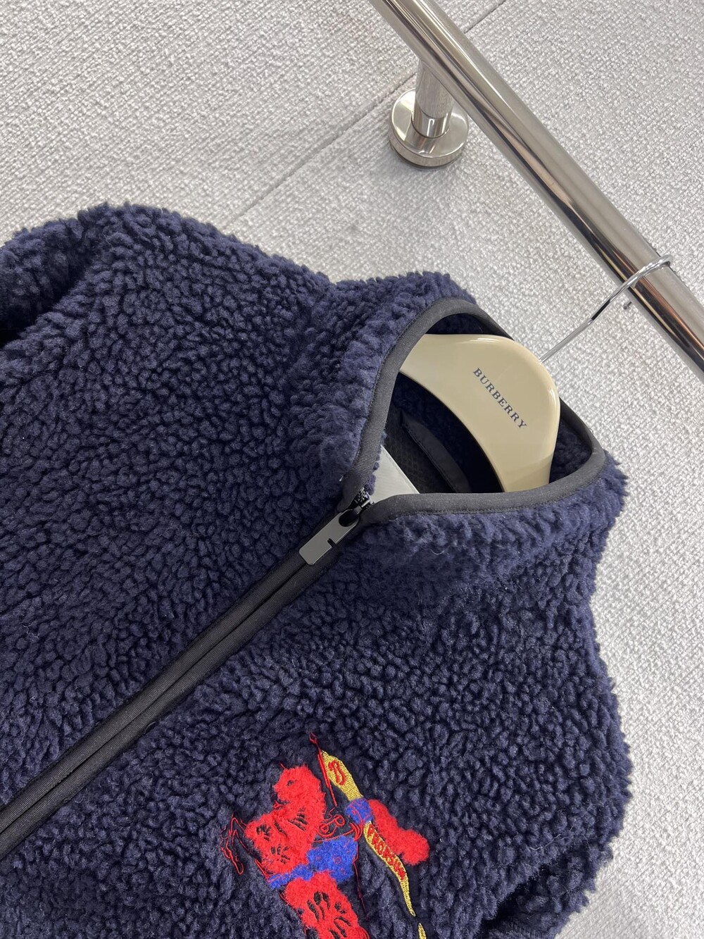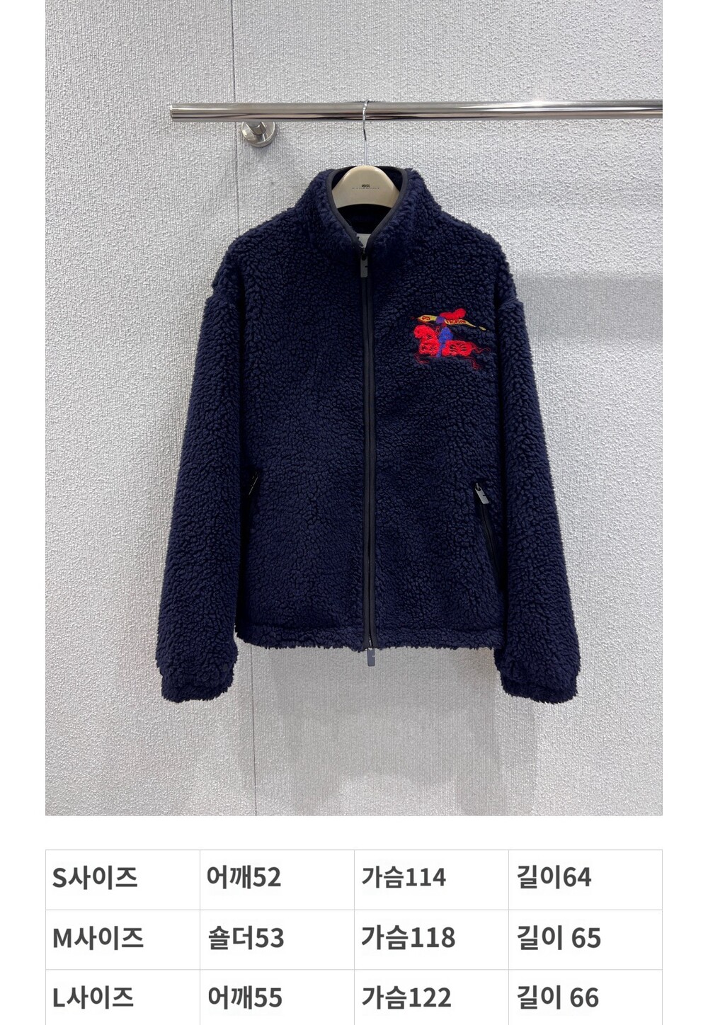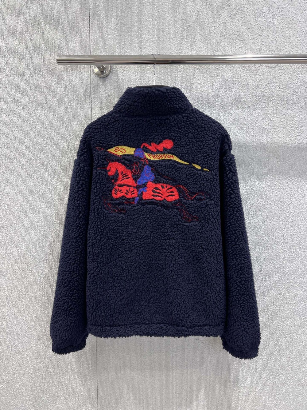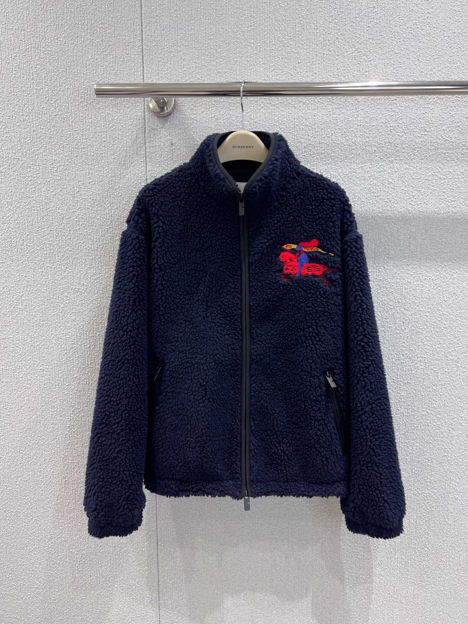 부드러운 울 캐시미어 혼방 플리스 소재의 퍼넬넥 재킷. 말의 해를 기념하는 캡슐 컬렉션의 기마상 디자인(Equestrian Knight Design, EKD) 자수가 특징으로, 버버리 하우스 코드를 독특한 질감과 메탈릭한 원사로 재치 있게 재해석함. 경량 메시 소재로 안감 처리된 릴랙스핏 스타일이며 드로스트링을 사용해 실루엣 조절 가능.