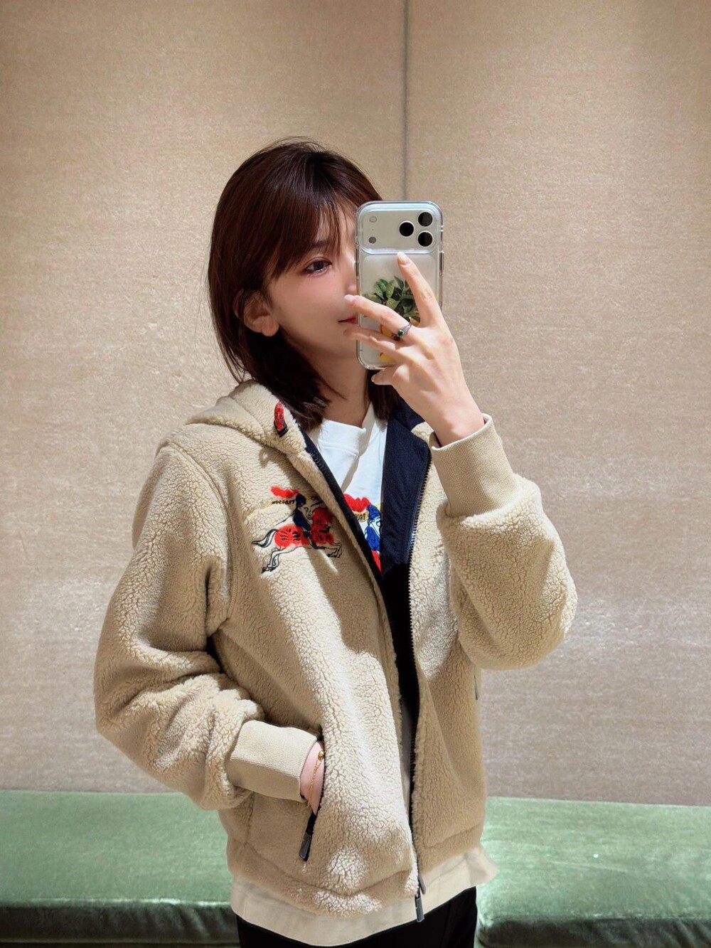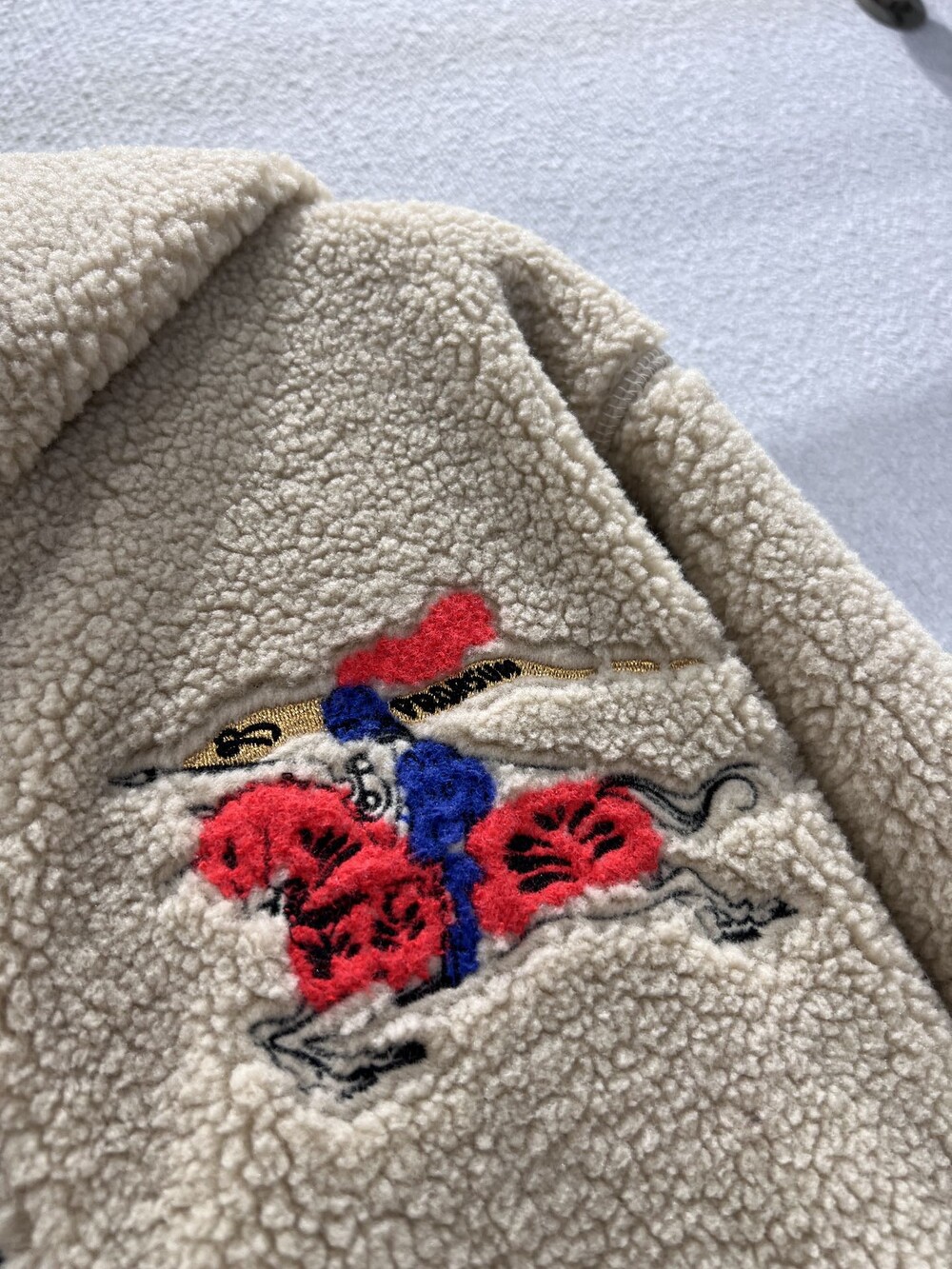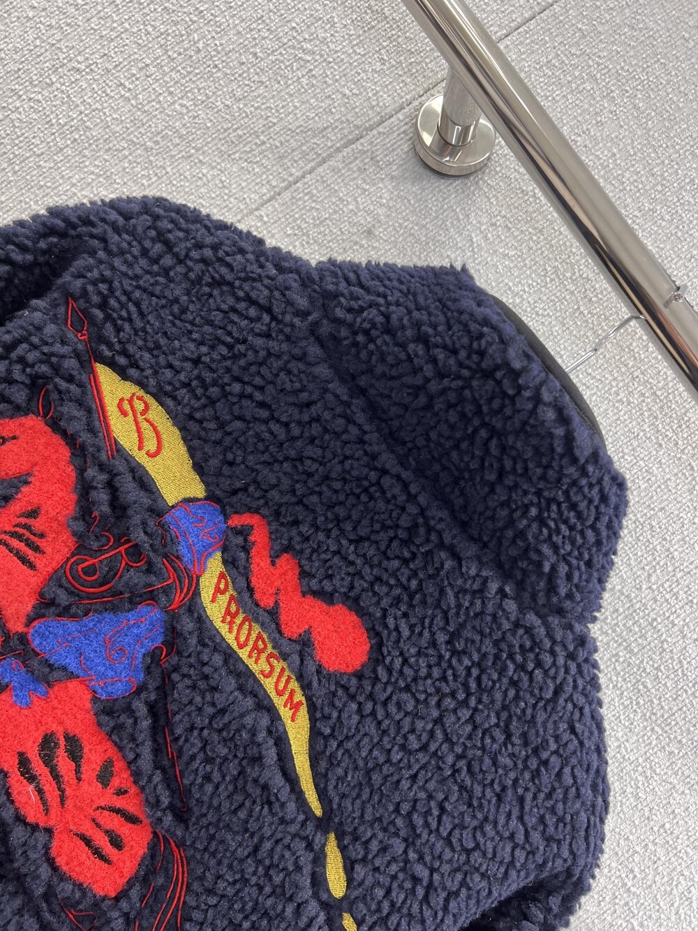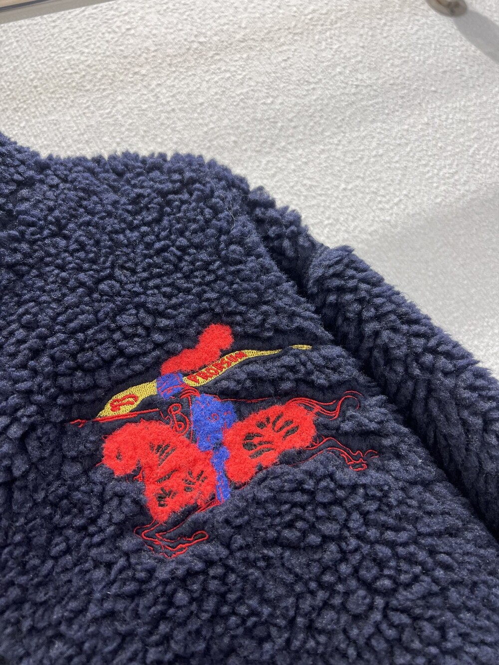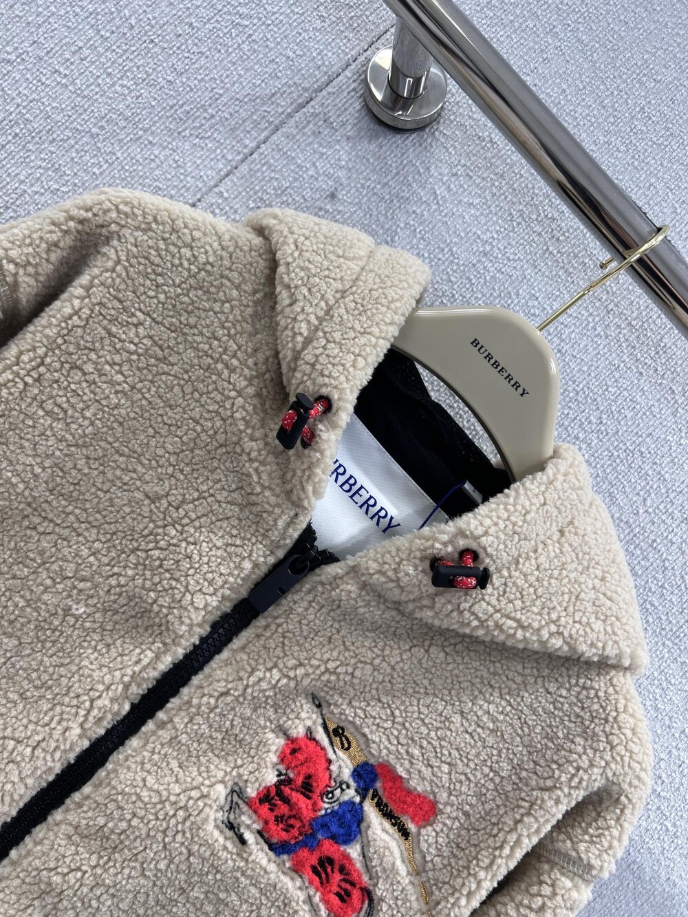 부드러운 울 캐시미어 혼방 플리스 소재의 퍼넬넥 재킷. 말의 해를 기념하는 캡슐 컬렉션의 기마상 디자인(Equestrian Knight Design, EKD) 자수가 특징으로, 버버리 하우스 코드를 독특한 질감과 메탈릭한 원사로 재치 있게 재해석함. 경량 메시 소재로 안감 처리된 릴랙스핏 스타일이며 드로스트링을 사용해 실루엣 조절 가능.