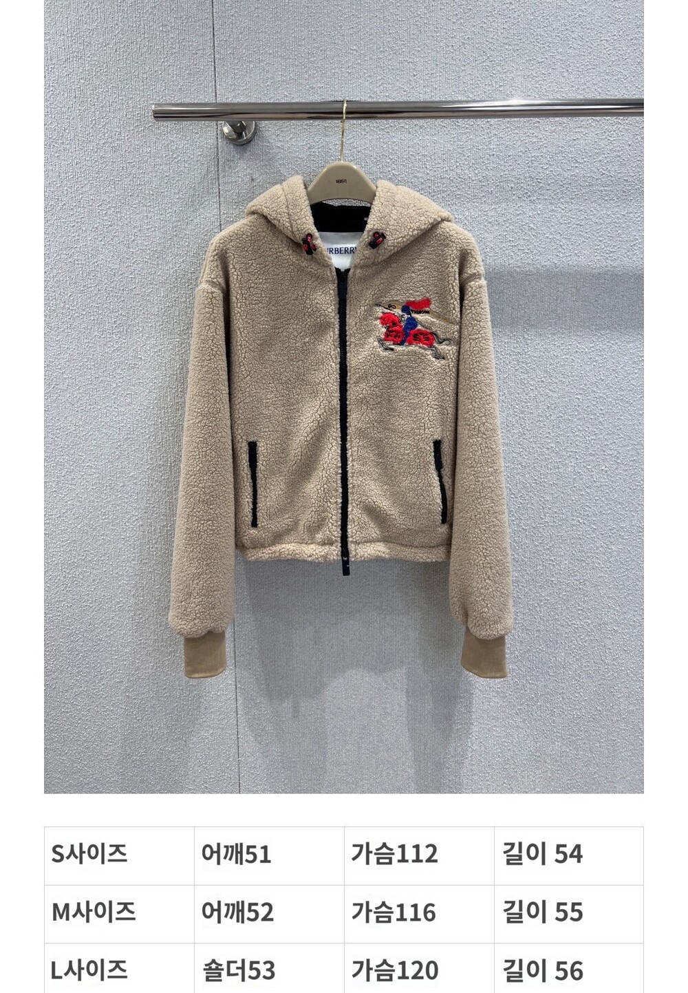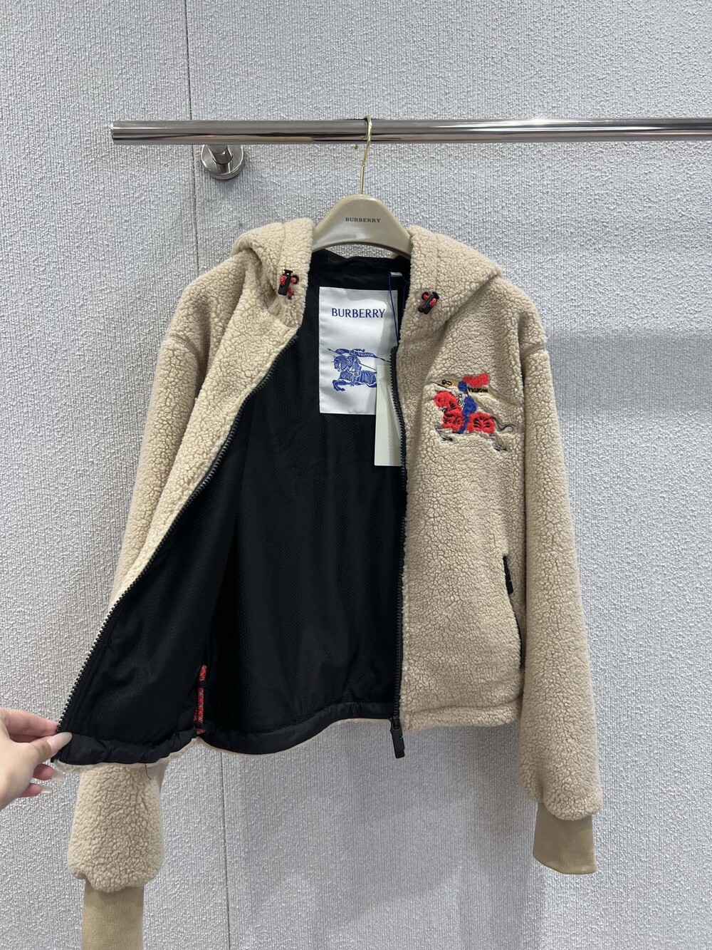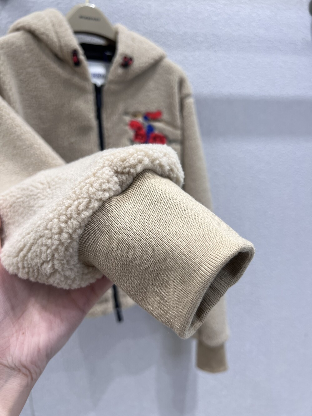 부드러운 울 캐시미어 혼방 플리스 소재의 후드 재킷. 말의 해를 기념하는 캡슐 컬렉션의 기마상 디자인(Equestrian Knight Design, EKD) 자수가 특징으로, 버버리 하우스 코드를 독특한 질감과 메탈릭한 원사로 재치 있게 재해석함. 경량 메시 소재로 안감 처리된 레귤러핏 스타일.