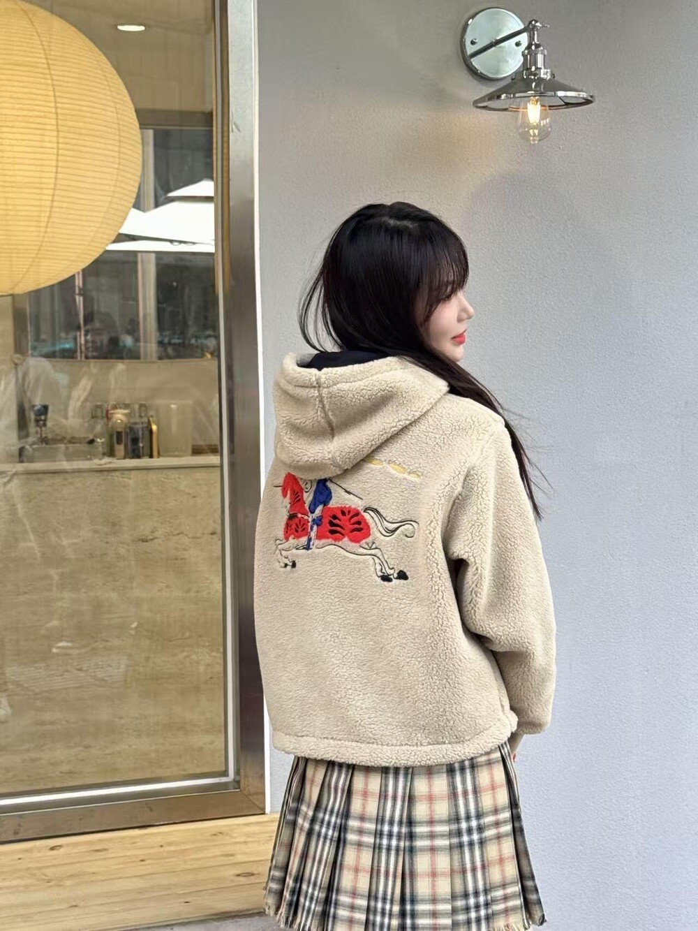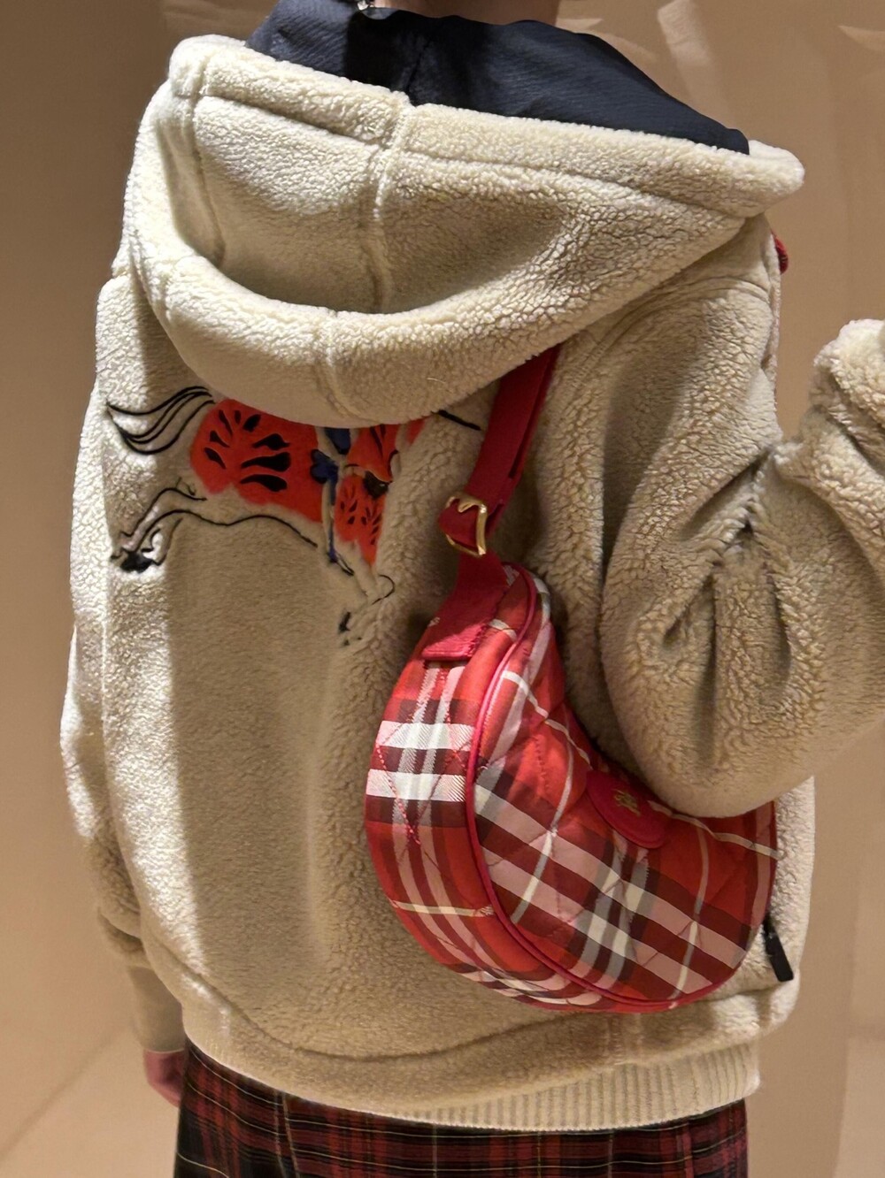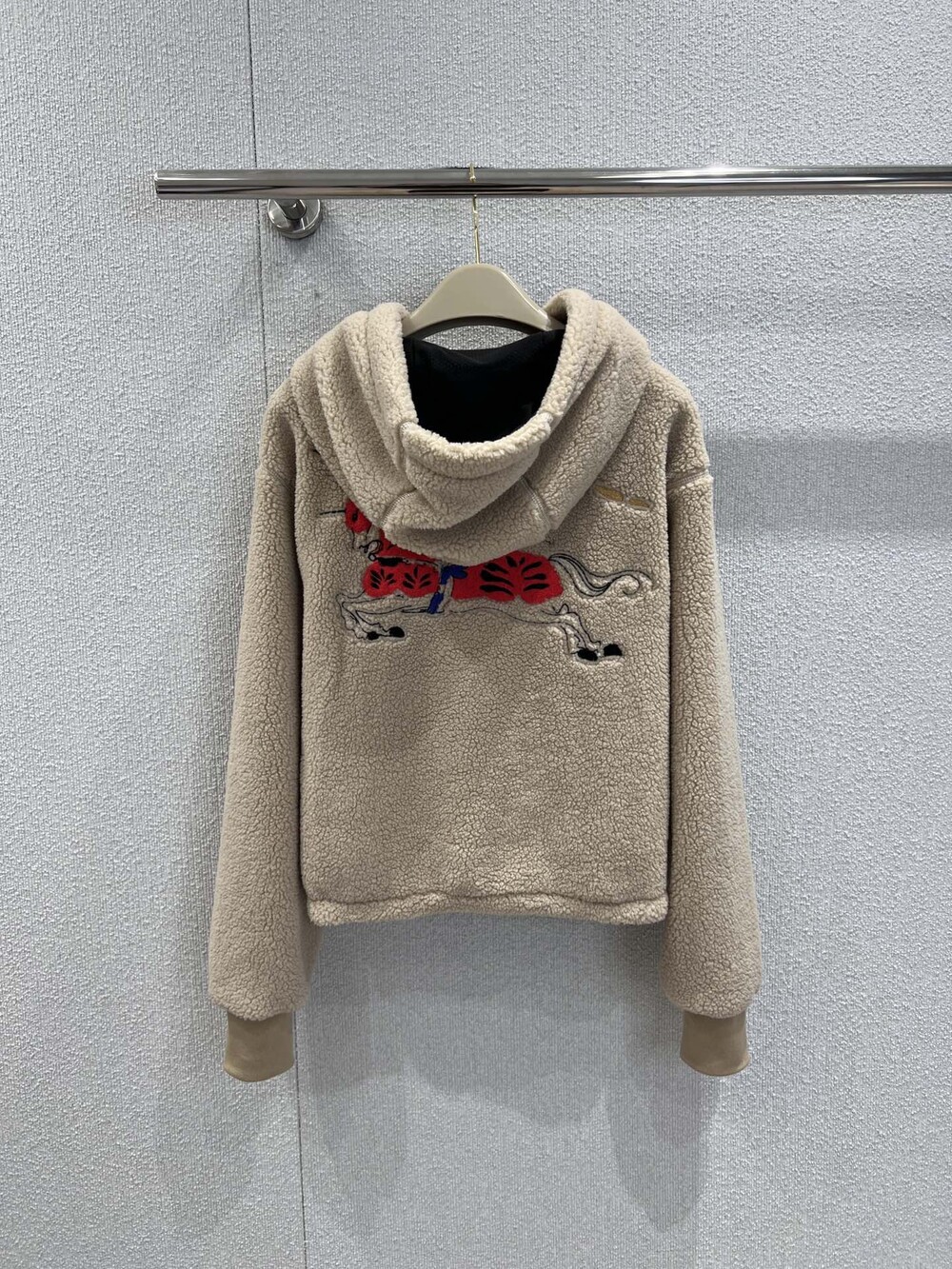 부드러운 울 캐시미어 혼방 플리스 소재의 후드 재킷. 말의 해를 기념하는 캡슐 컬렉션의 기마상 디자인(Equestrian Knight Design, EKD) 자수가 특징으로, 버버리 하우스 코드를 독특한 질감과 메탈릭한 원사로 재치 있게 재해석함. 경량 메시 소재로 안감 처리된 레귤러핏 스타일.