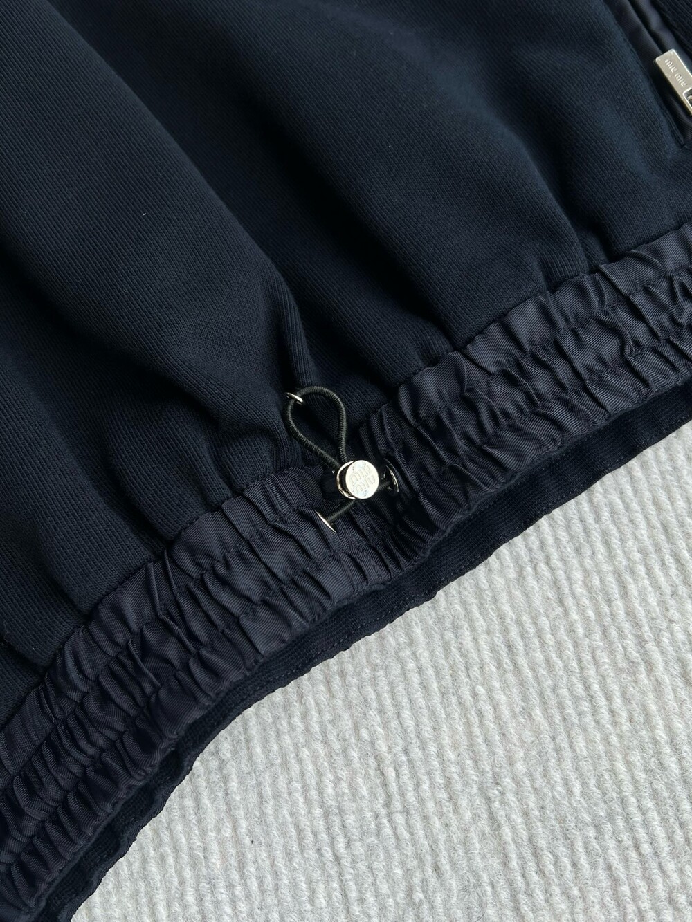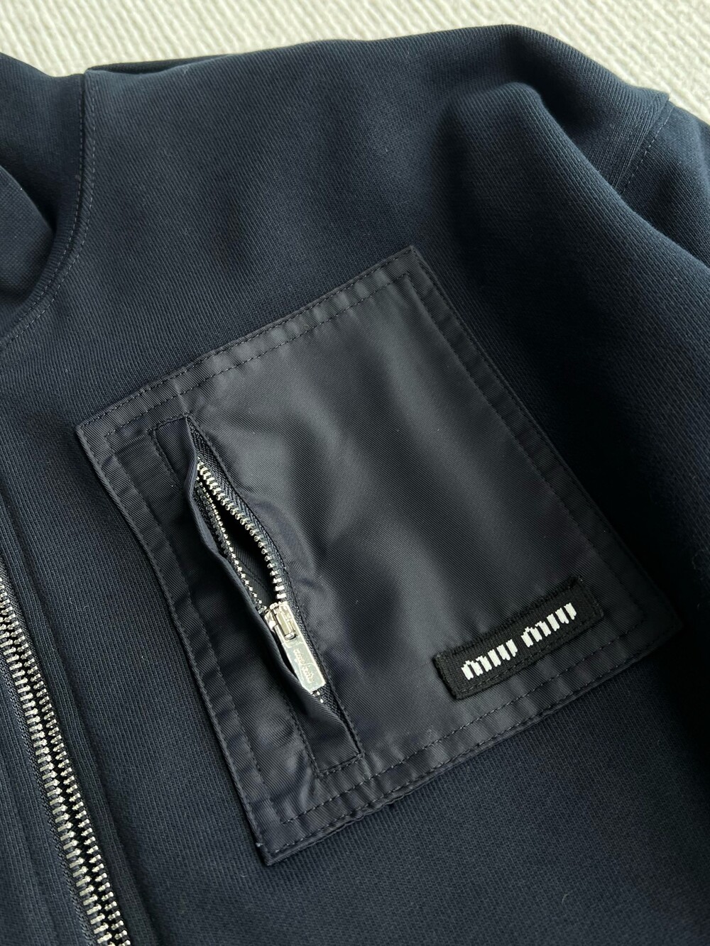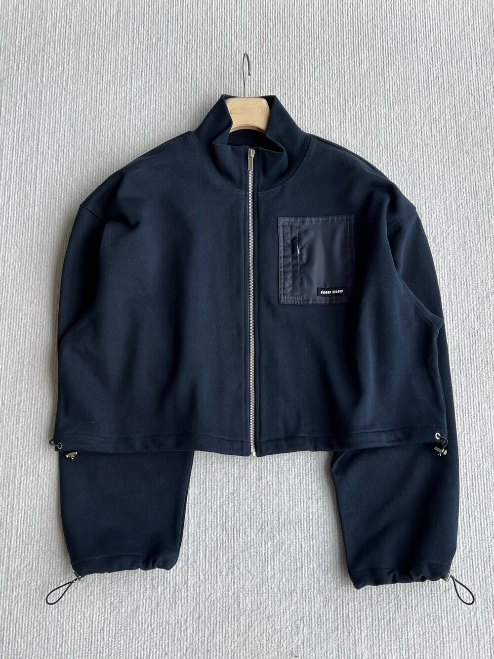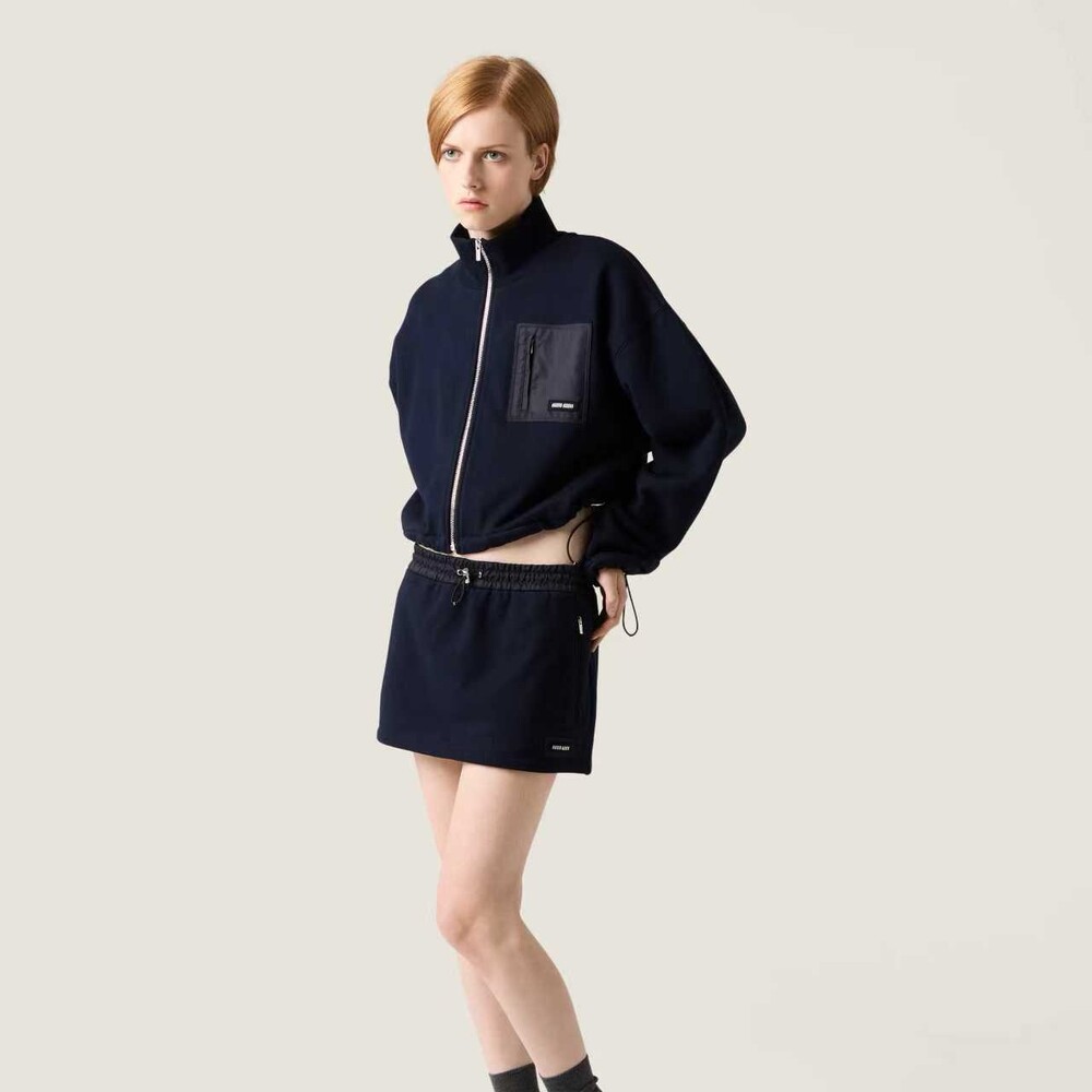 미우미우 워드로브의 필수품인 플리스 재킷은 기술적 패브릭의 특성을 살리면서 스포티하고 크롭된 라인을 강조하는 디테일을 결합하여 현대적이고 캐주얼한 룩의 비율을 새롭게 해석합니다.