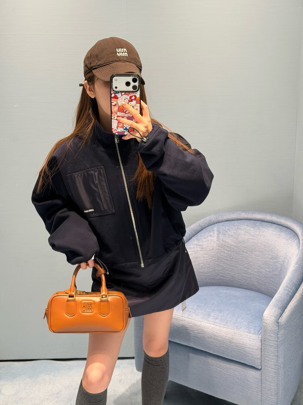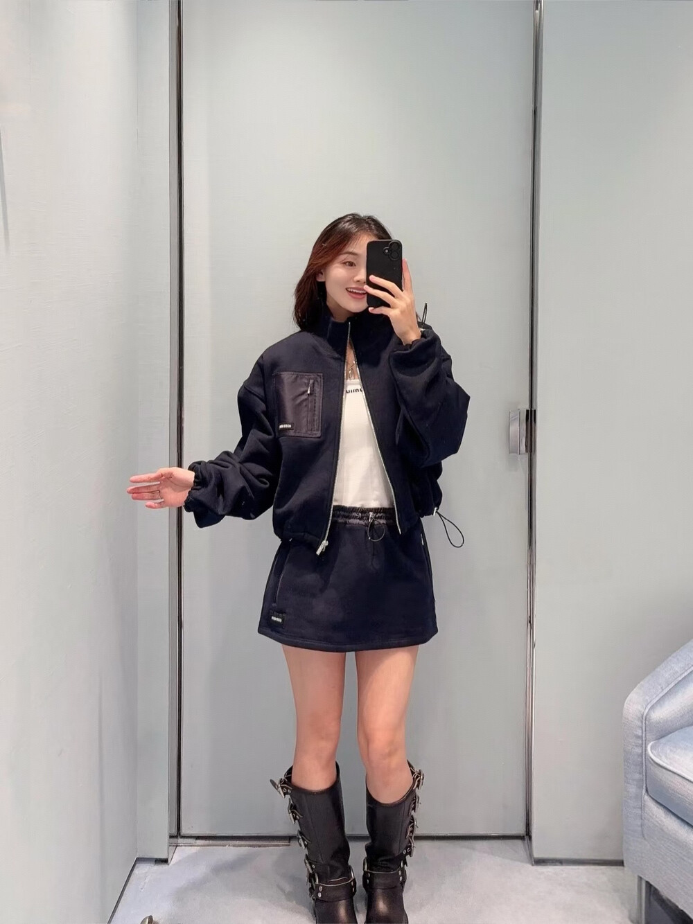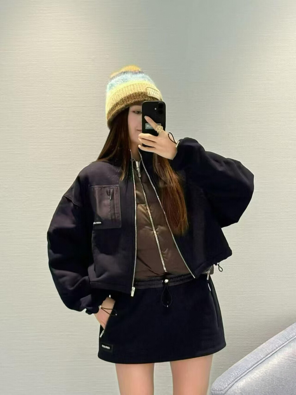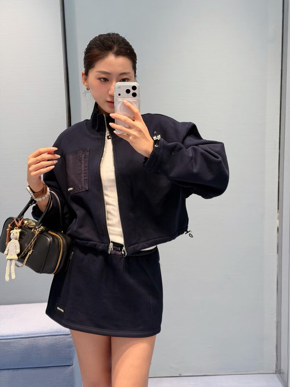 미우미우 워드로브의 필수품인 플리스 재킷은 기술적 패브릭의 특성을 살리면서 스포티하고 크롭된 라인을 강조하는 디테일을 결합하여 현대적이고 캐주얼한 룩의 비율을 새롭게 해석합니다.