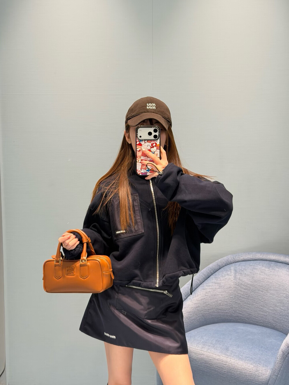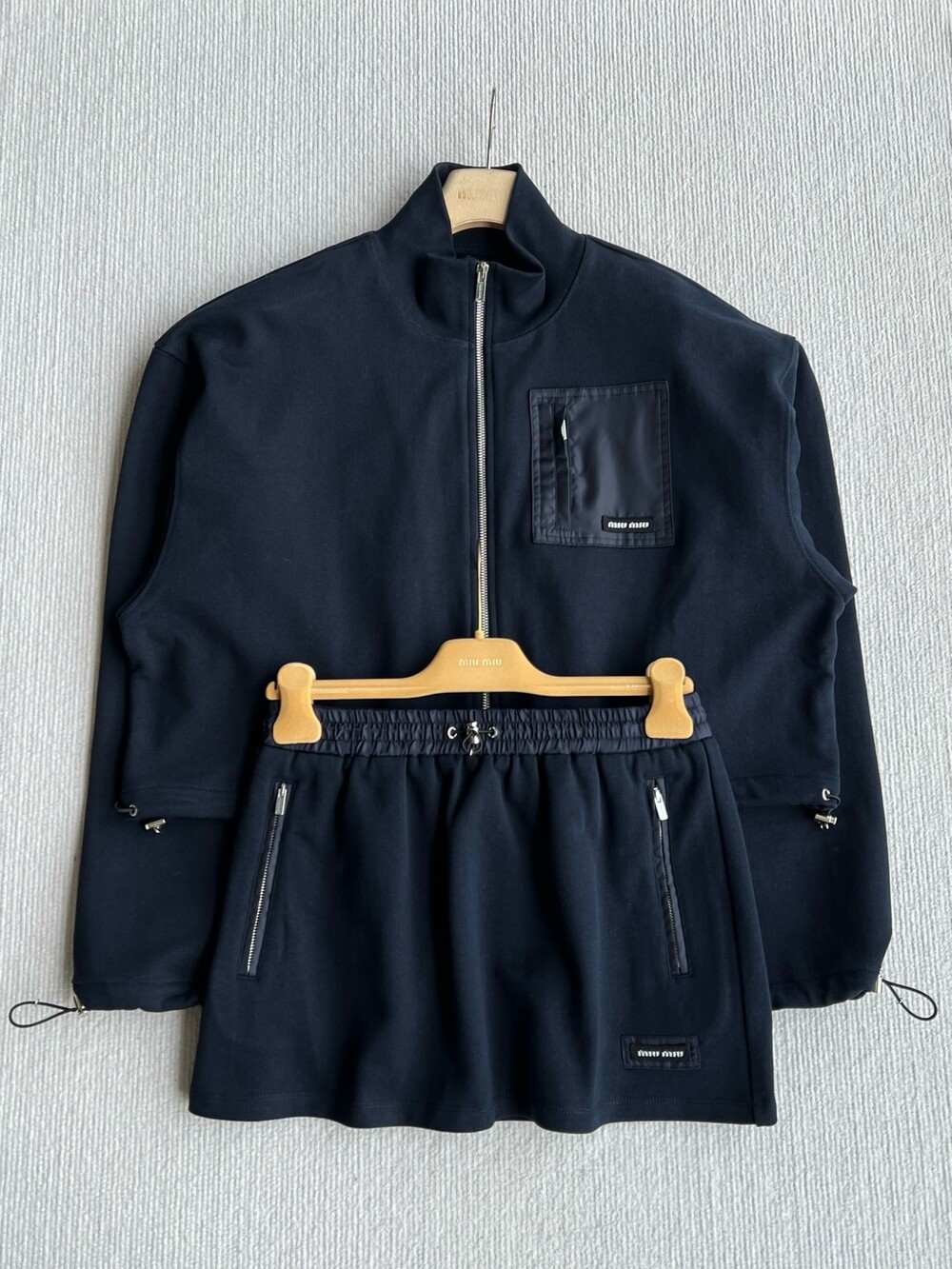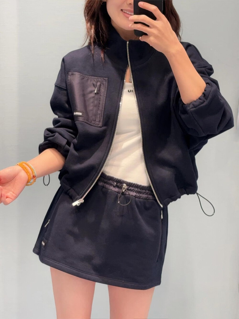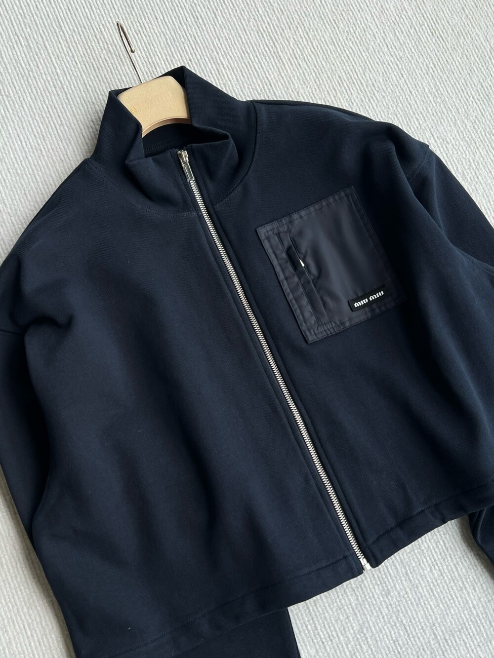 미우미우 워드로브의 필수품인 플리스 재킷은 기술적 패브릭의 특성을 살리면서 스포티하고 크롭된 라인을 강조하는 디테일을 결합하여 현대적이고 캐주얼한 룩의 비율을 새롭게 해석합니다.