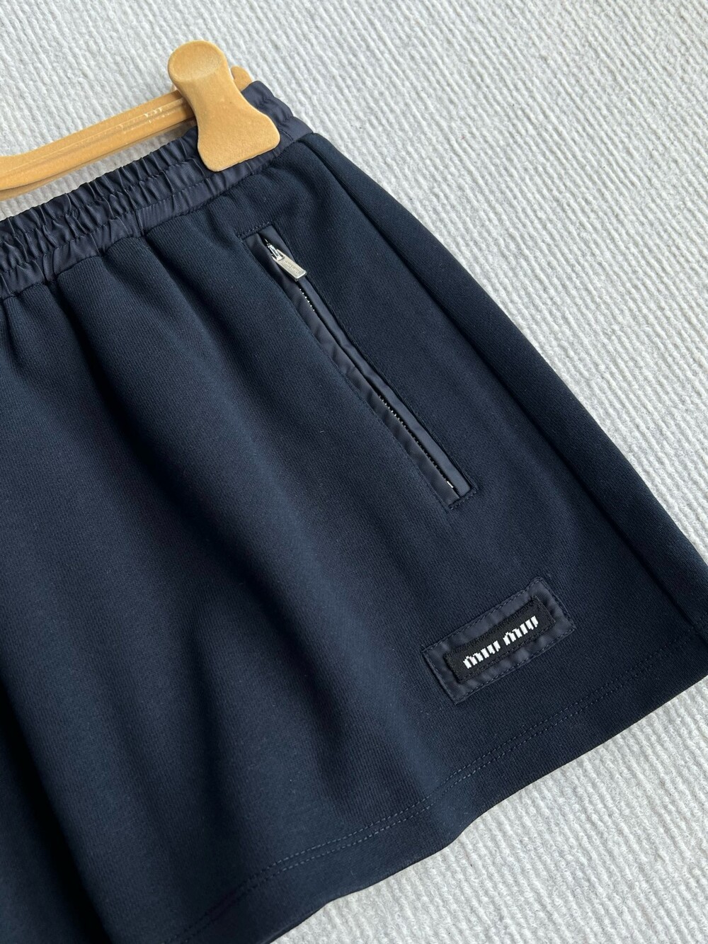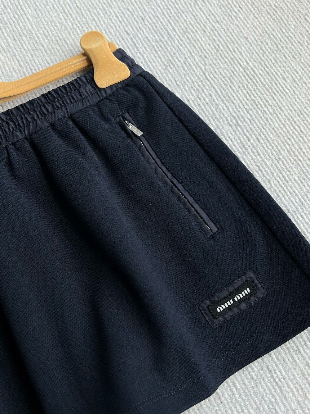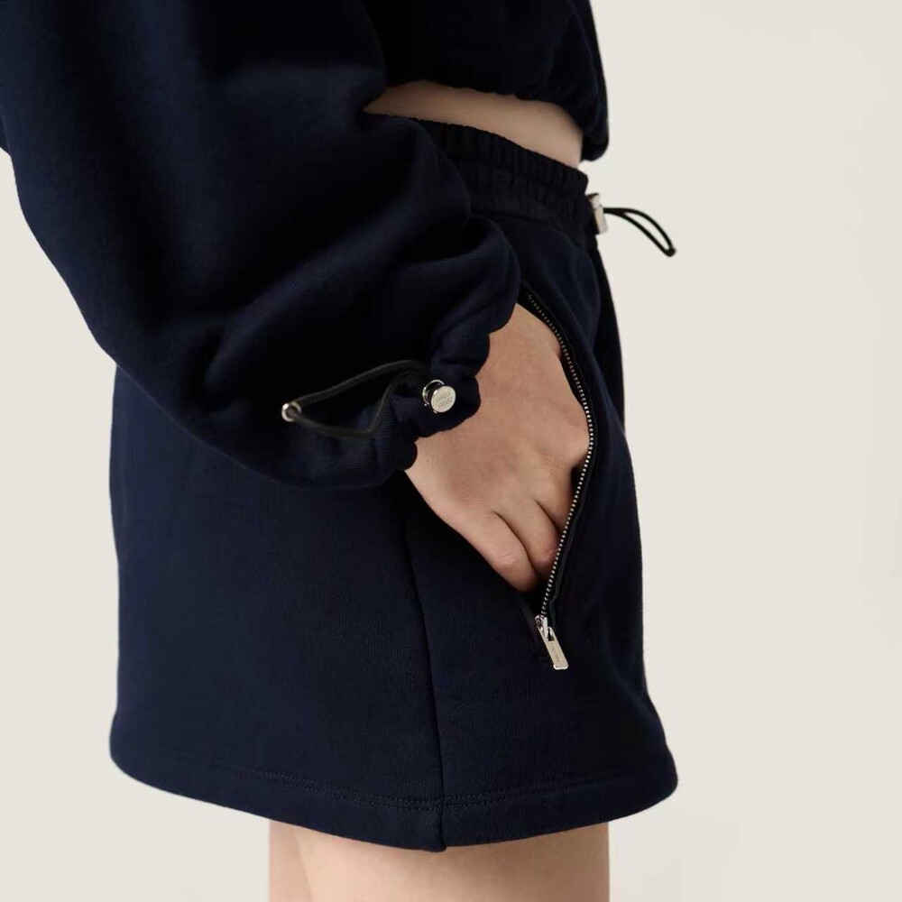 코튼 플리스는 미우미우 워드로브의 상징으로, 미니스커트의 편안하고 스포티한 룩을 정의합니다. 기술적인 패브릭을 실루엣과 캐주얼 스타일을 돋보이게 하는 디테일과 결합했습니다.