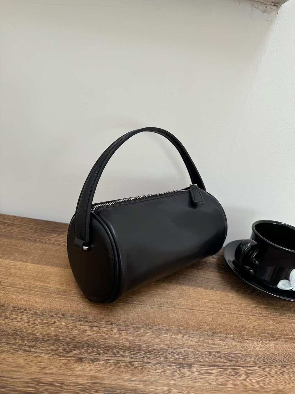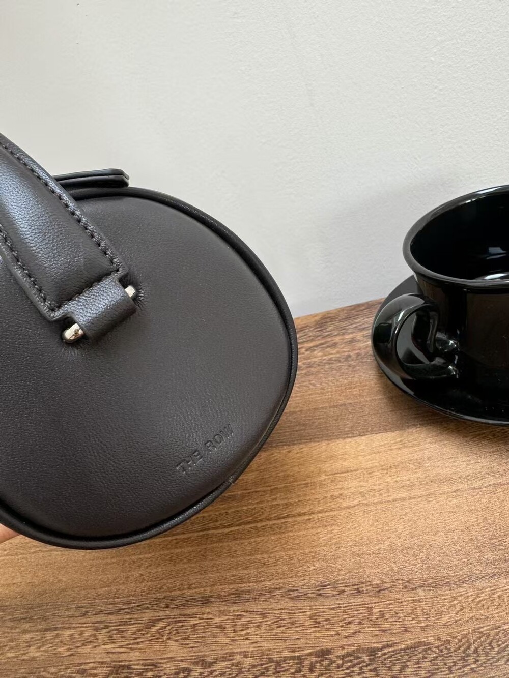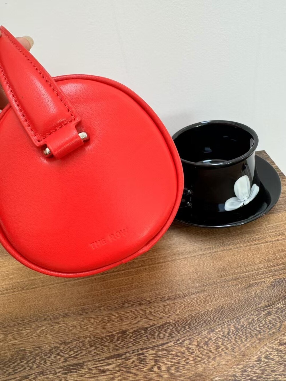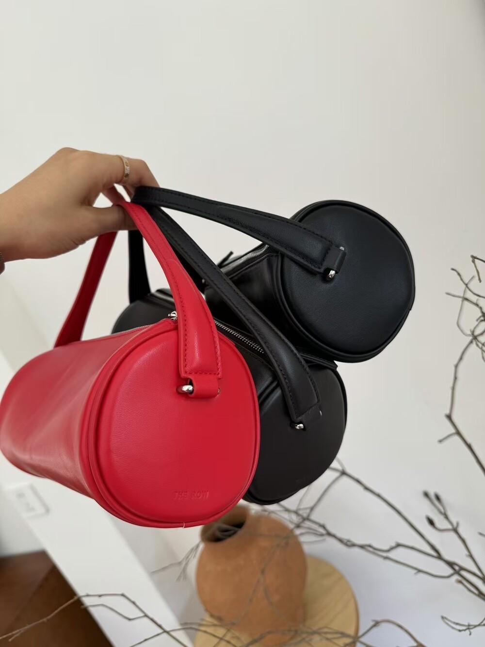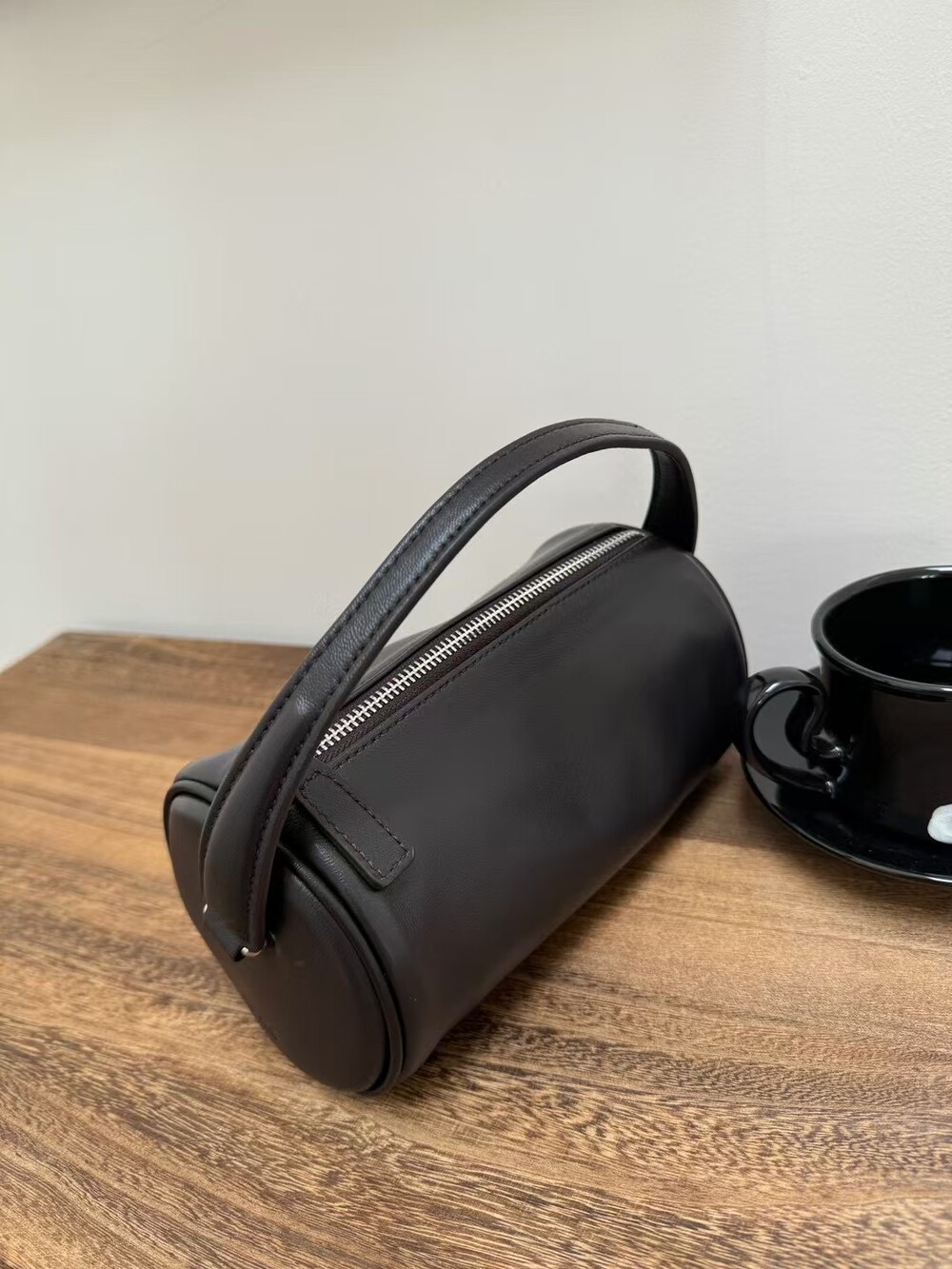 곡선형 거싯, 가죽 파이핑, 금속 하드웨어가 있는 슬림 가죽 스트랩을 갖춘 부드러운 나파 가죽 소재의 둥근 디자인의 탑 핸들 백.