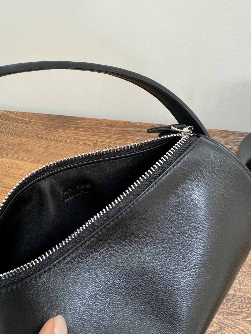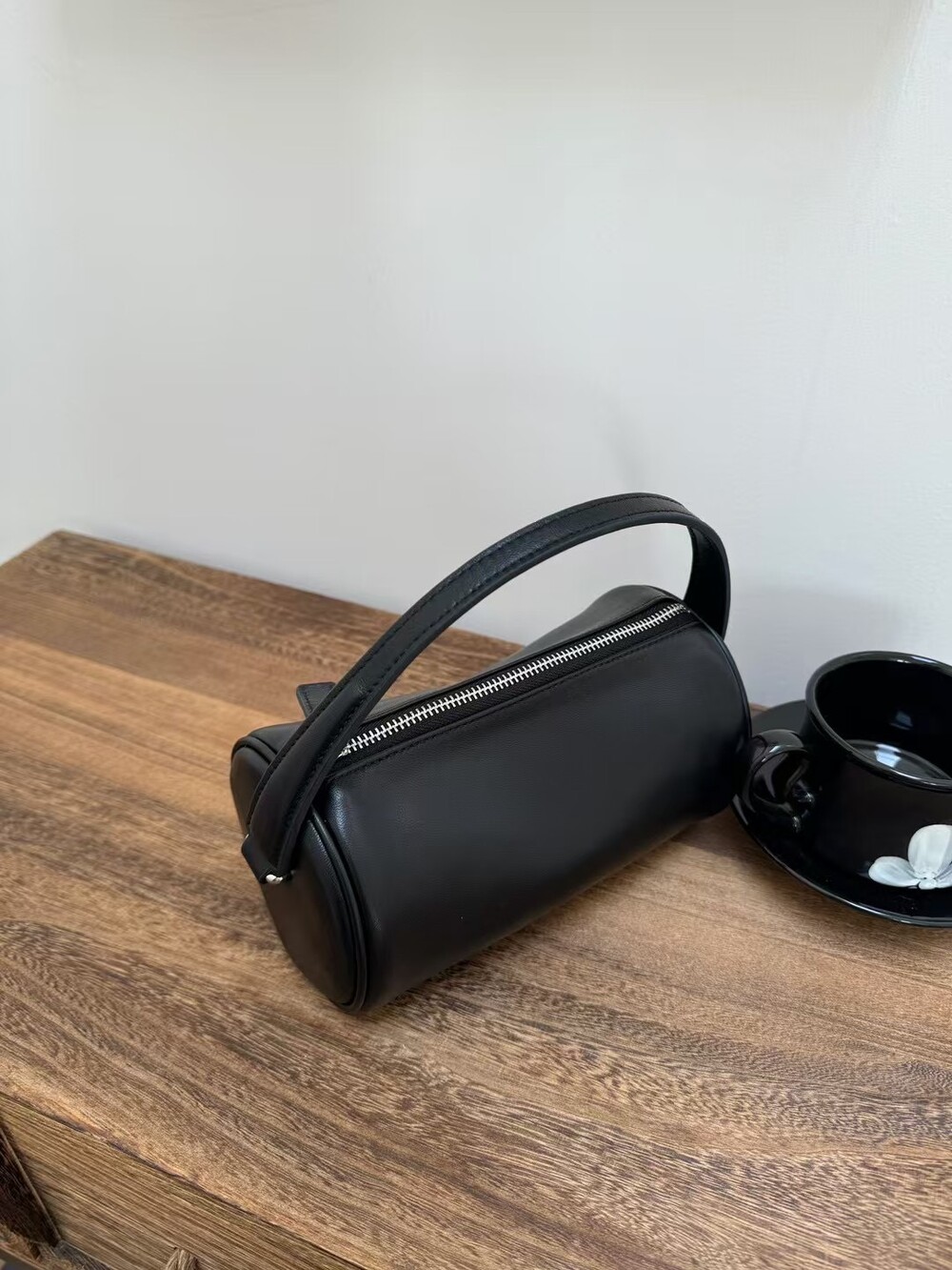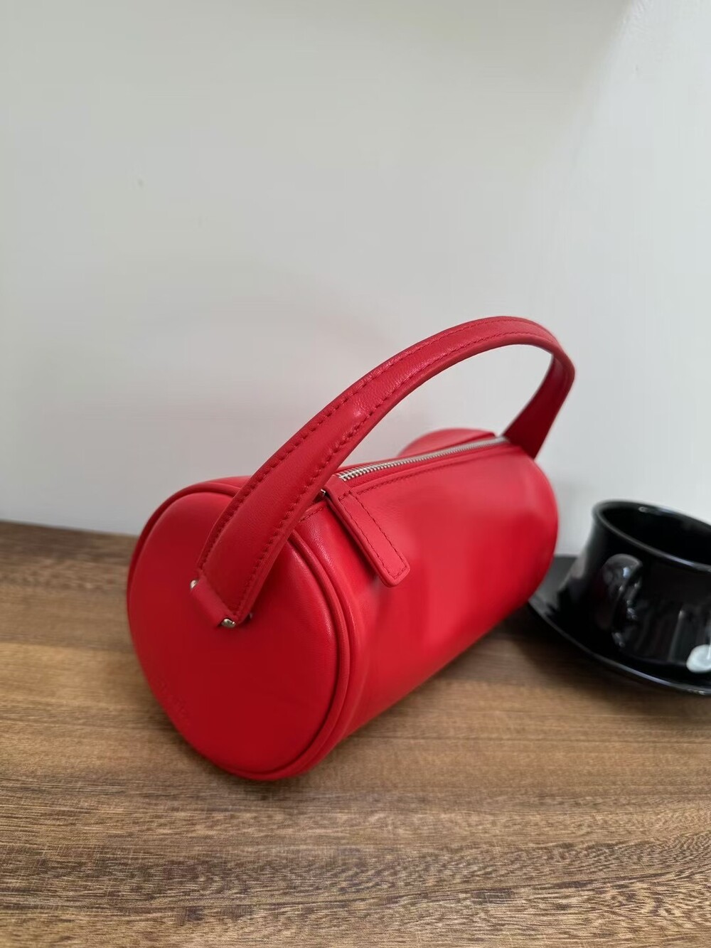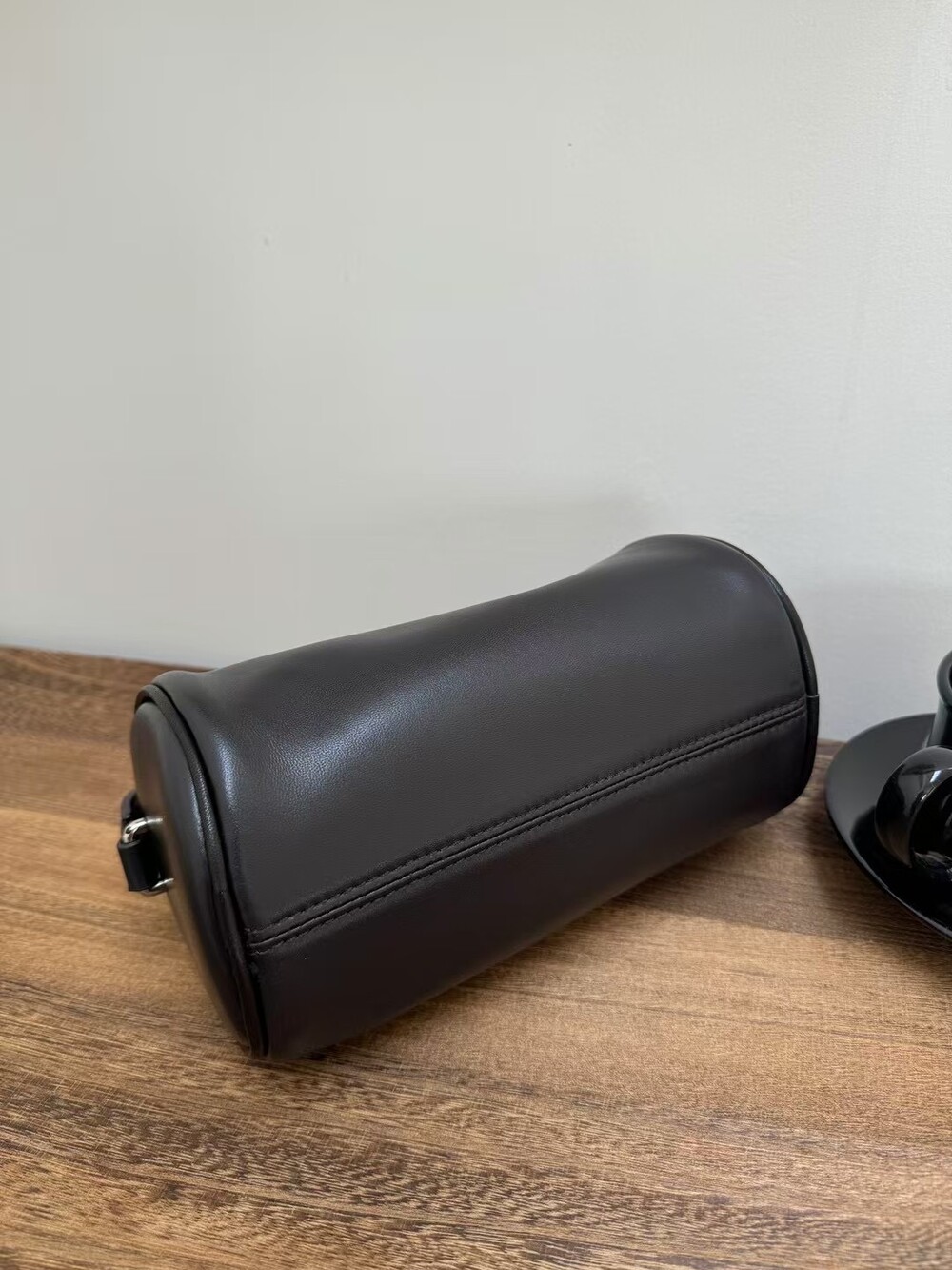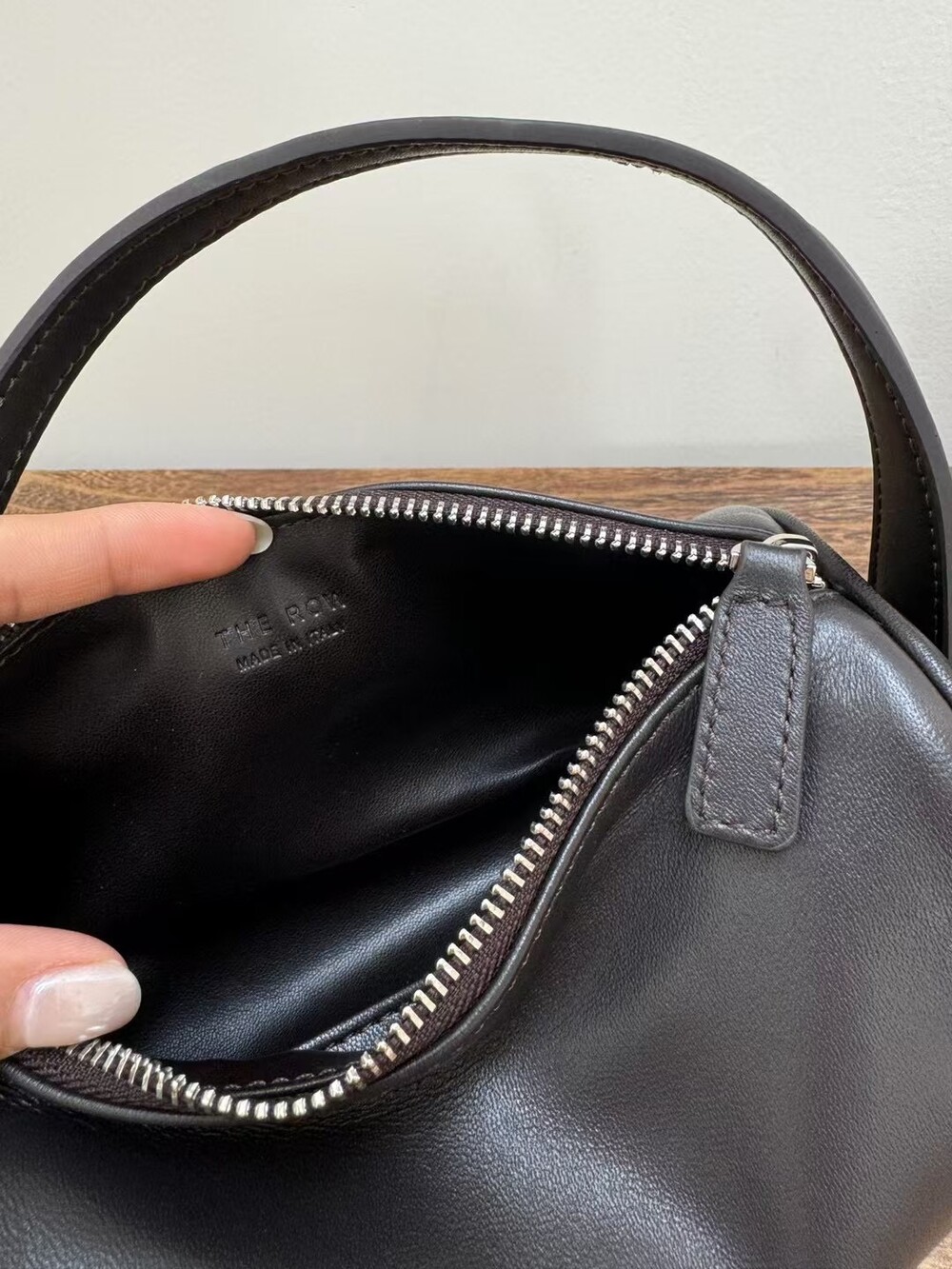 곡선형 거싯, 가죽 파이핑, 금속 하드웨어가 있는 슬림 가죽 스트랩을 갖춘 부드러운 나파 가죽 소재의 둥근 디자인의 탑 핸들 백.