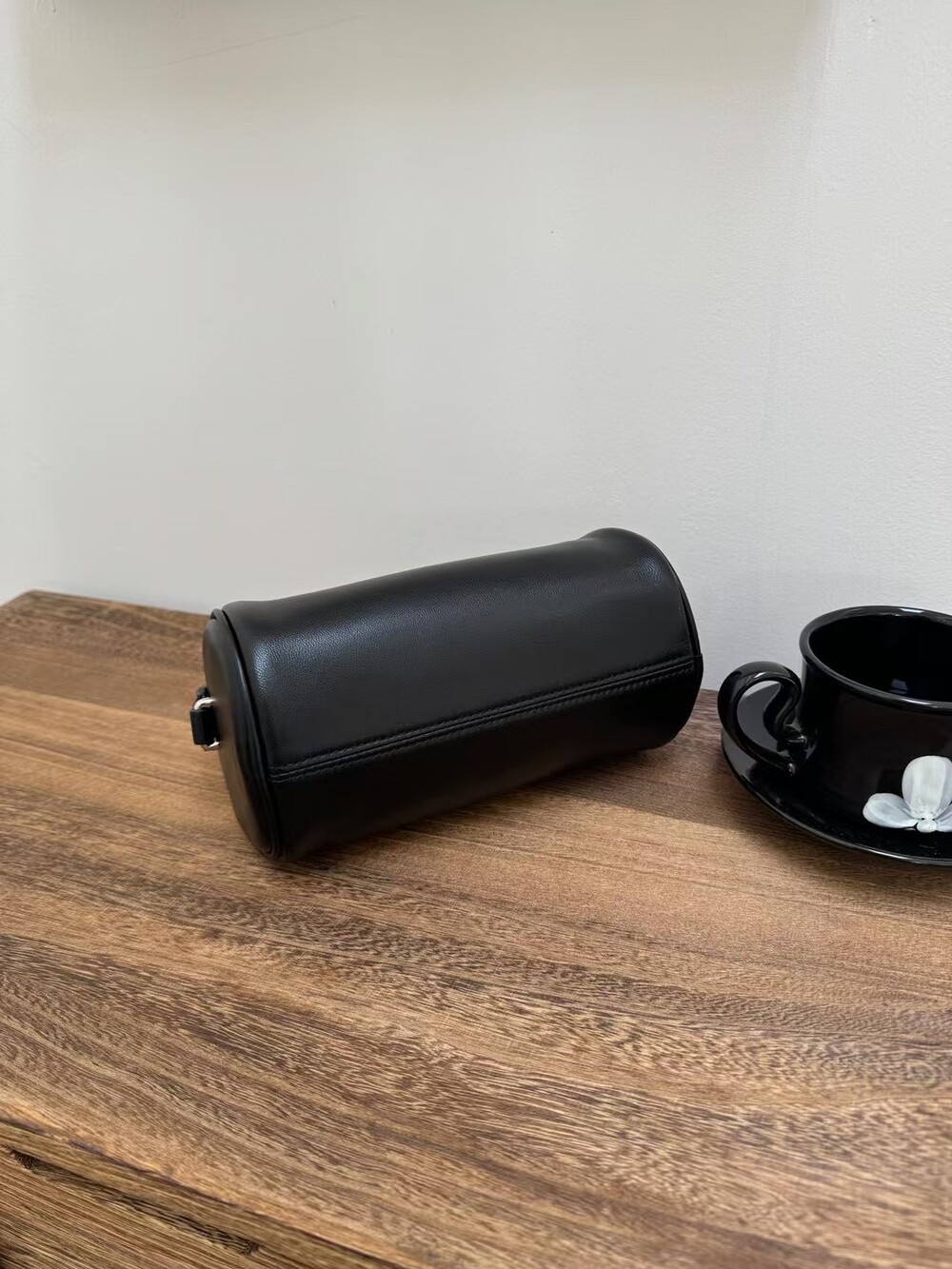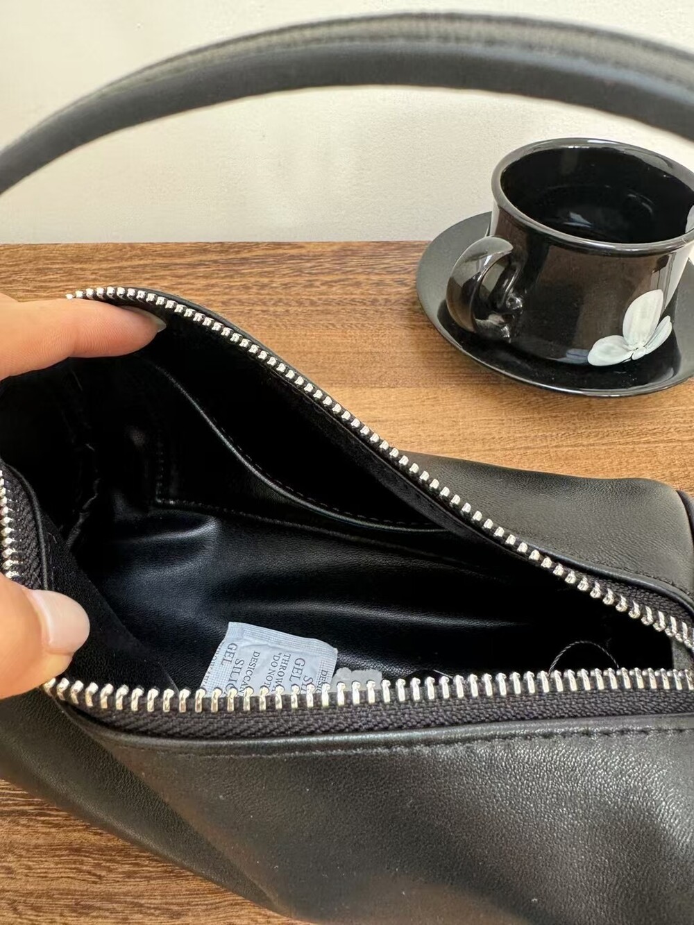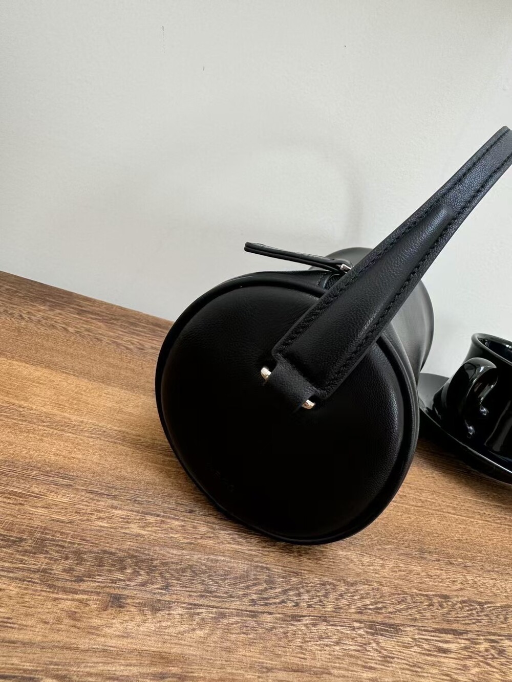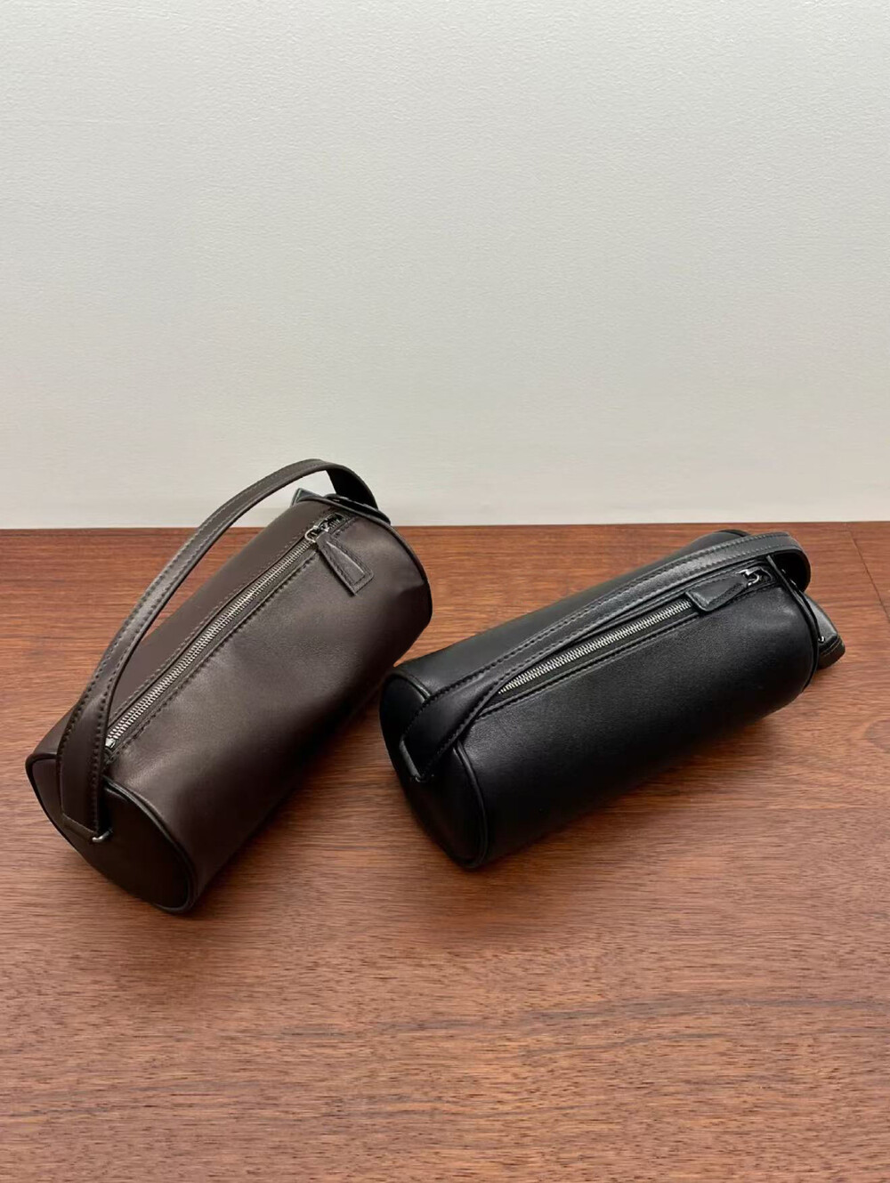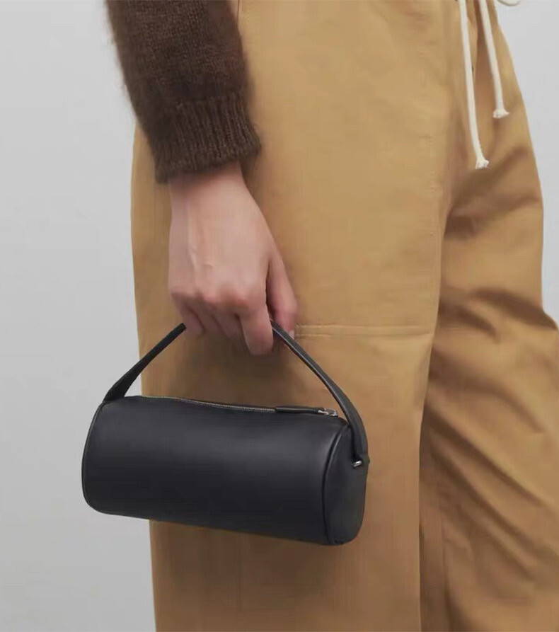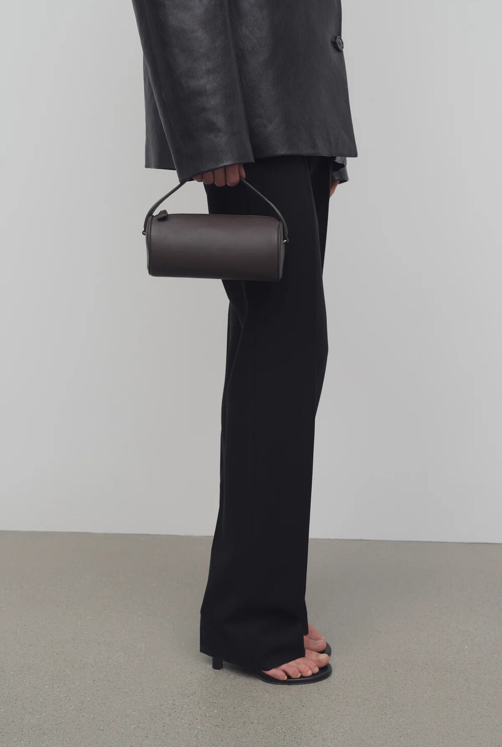 곡선형 거싯, 가죽 파이핑, 금속 하드웨어가 있는 슬림 가죽 스트랩을 갖춘 부드러운 나파 가죽 소재의 둥근 디자인의 탑 핸들 백.