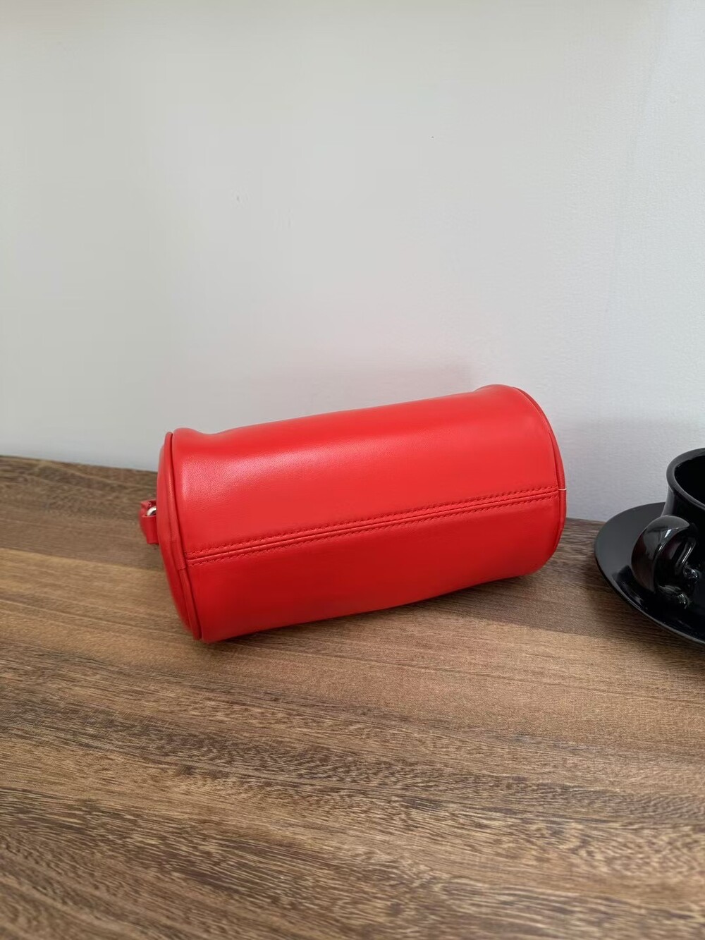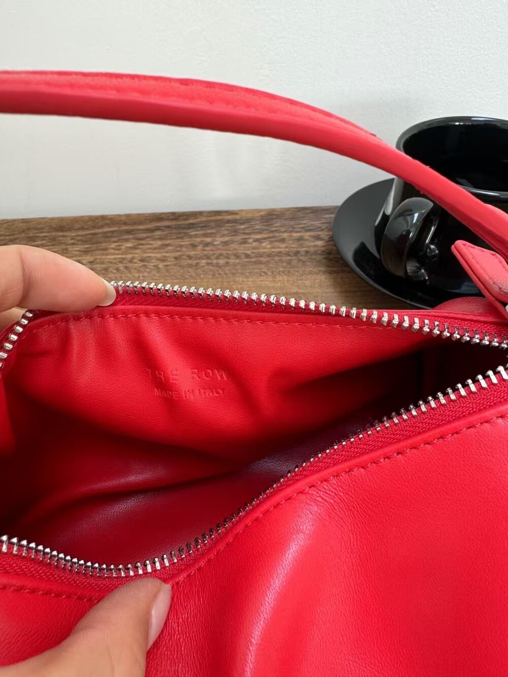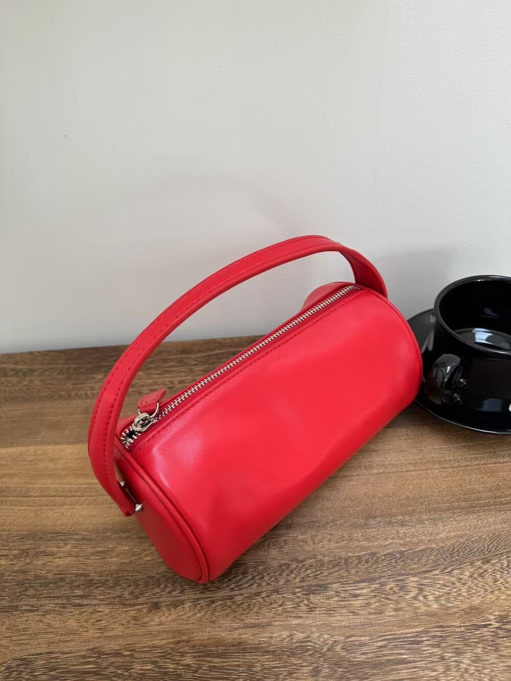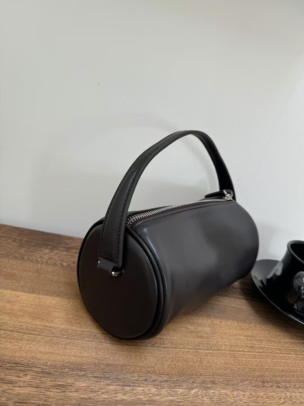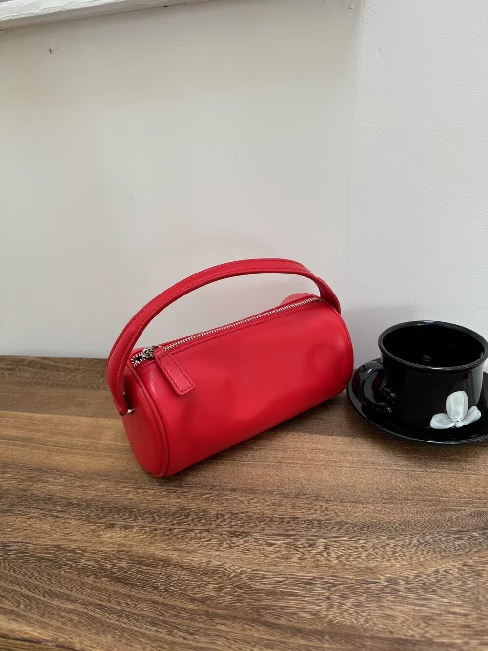 곡선형 거싯, 가죽 파이핑, 금속 하드웨어가 있는 슬림 가죽 스트랩을 갖춘 부드러운 나파 가죽 소재의 둥근 디자인의 탑 핸들 백.