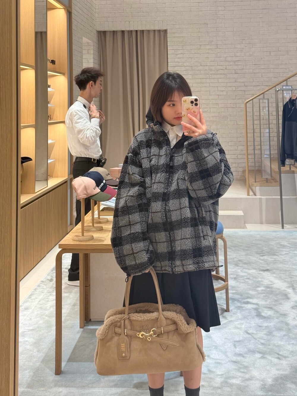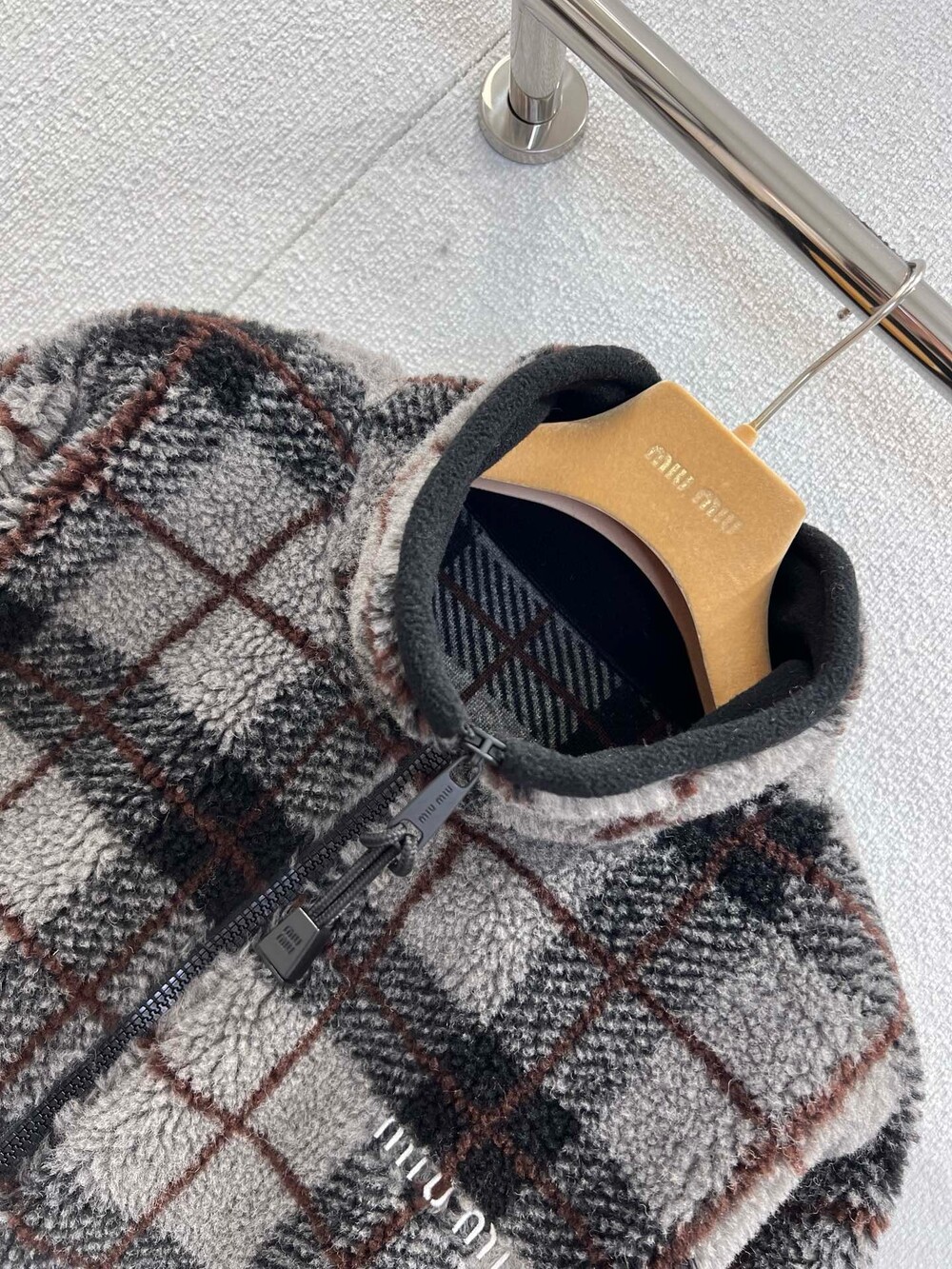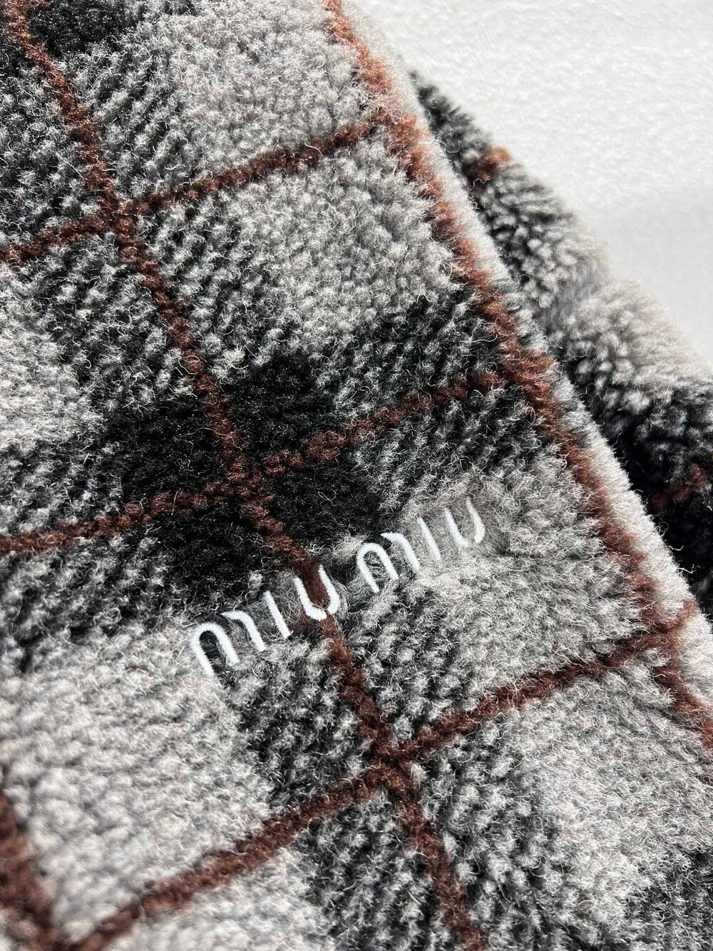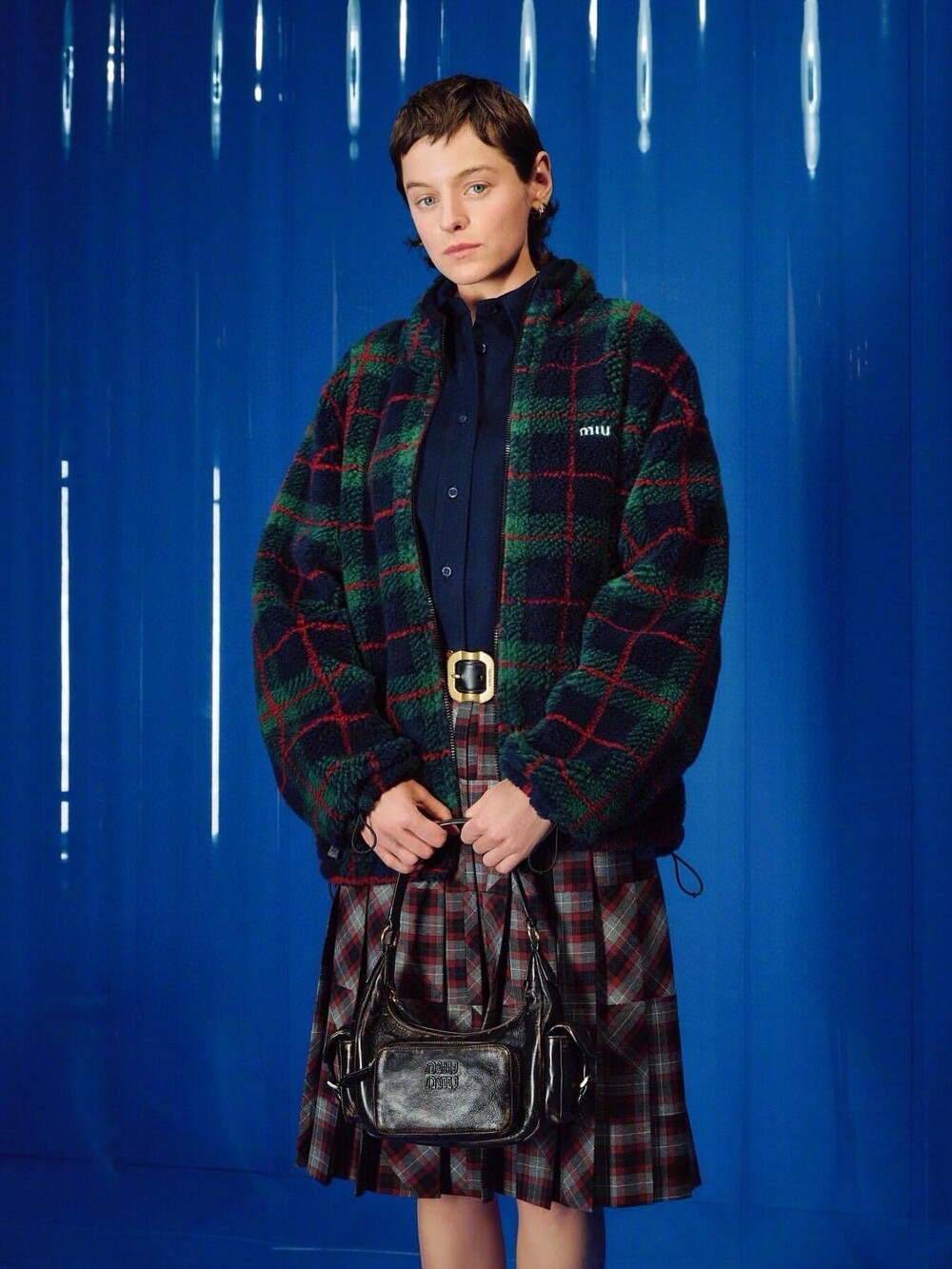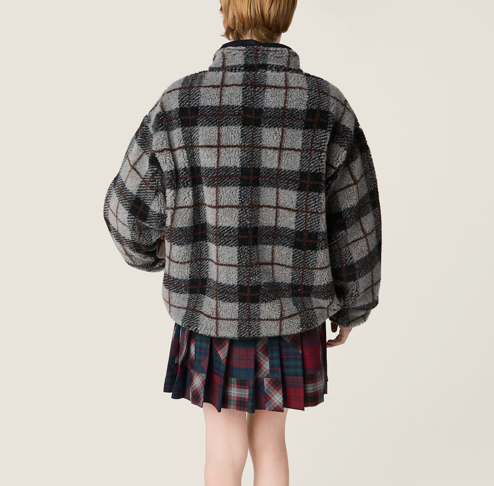 아이코닉한 플리스 재킷을 울 소재로 볼륨감과 부드러움을 더한 테디 버전으로 재해석했습니다. 클래식한 체크 패턴은 남성복에서 영감을 받아 스포티한 페미니티를 미우미우만의 감각으로 표현합니다.
