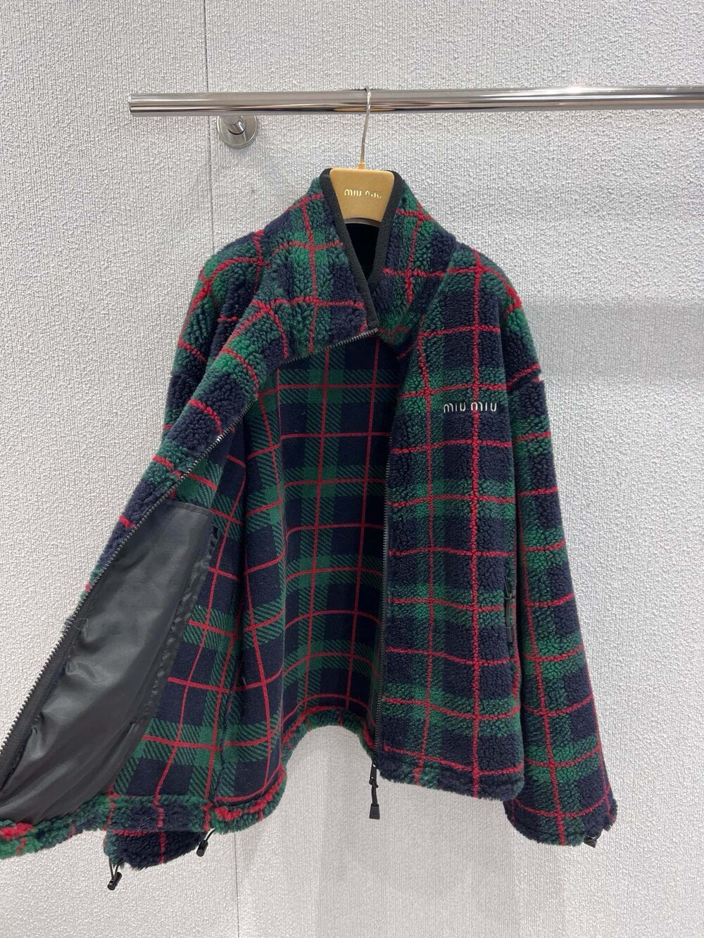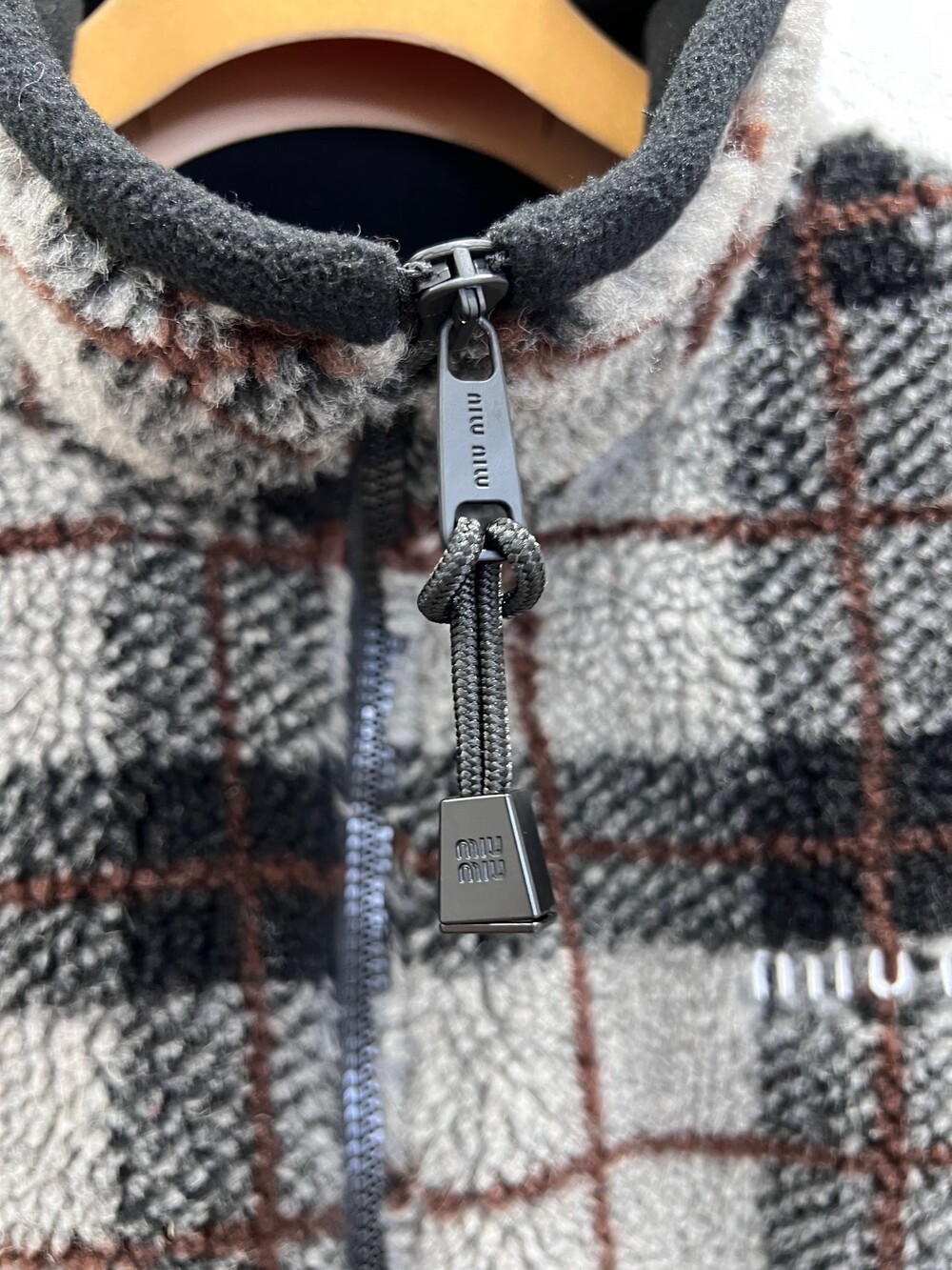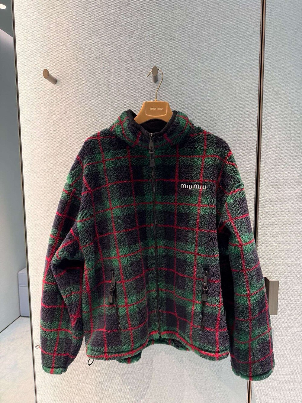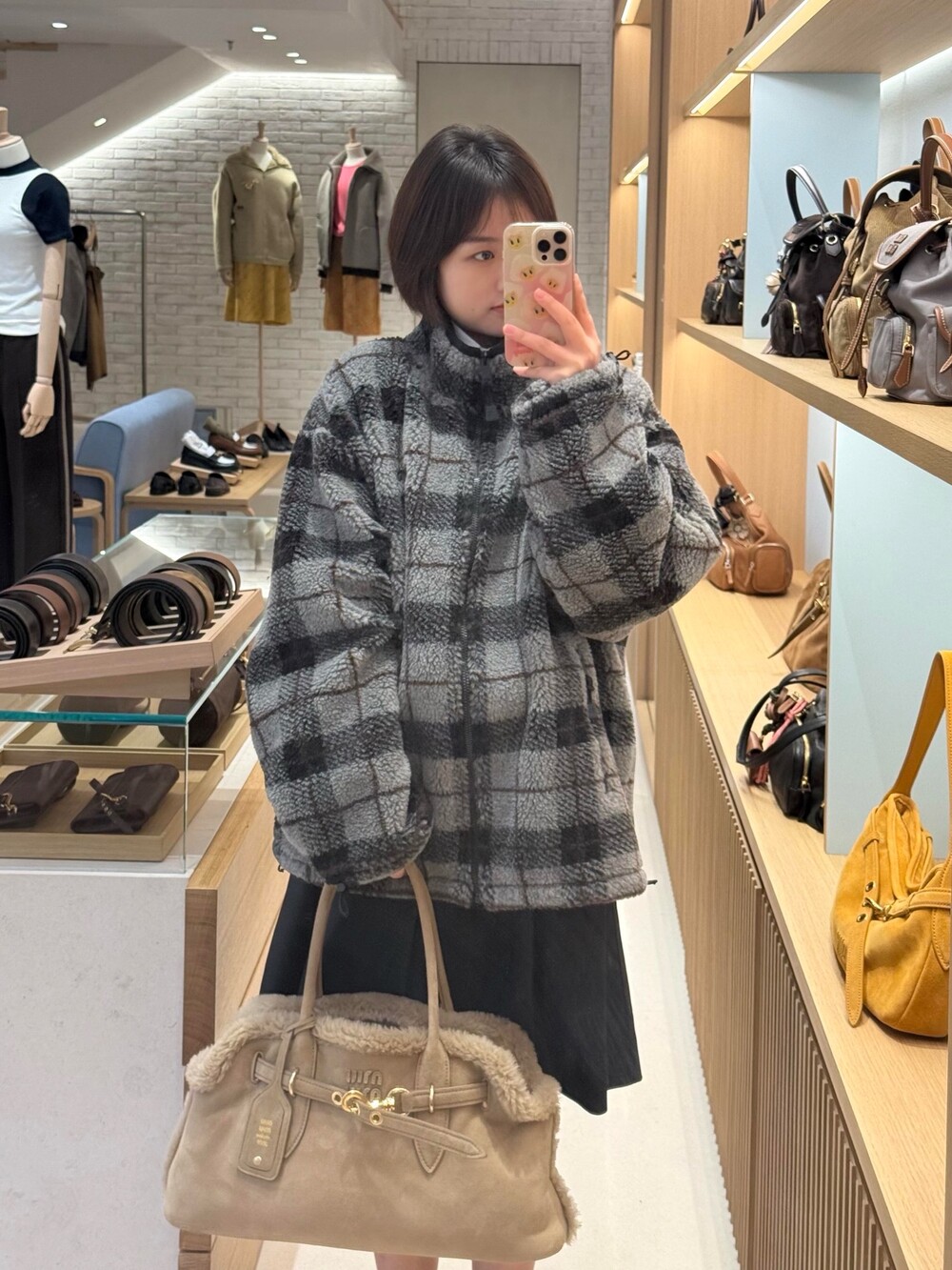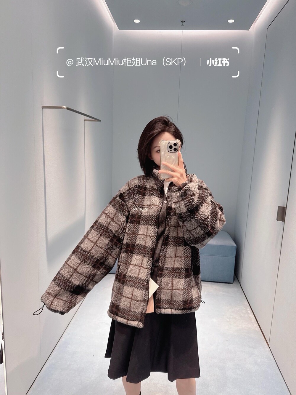 아이코닉한 플리스 재킷을 울 소재로 볼륨감과 부드러움을 더한 테디 버전으로 재해석했습니다. 클래식한 체크 패턴은 남성복에서 영감을 받아 스포티한 페미니티를 미우미우만의 감각으로 표현합니다.