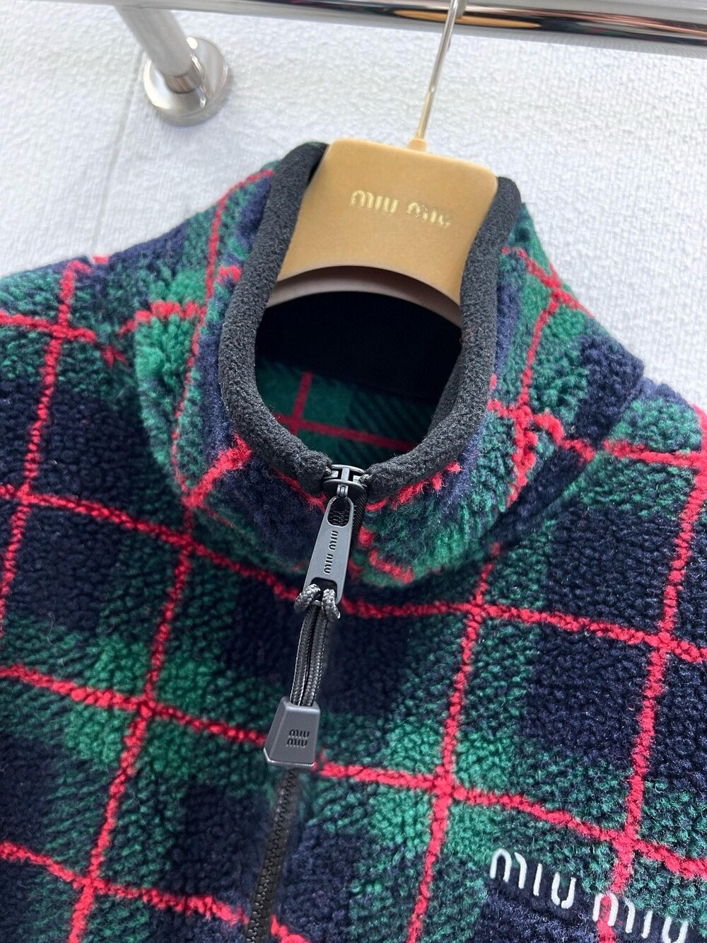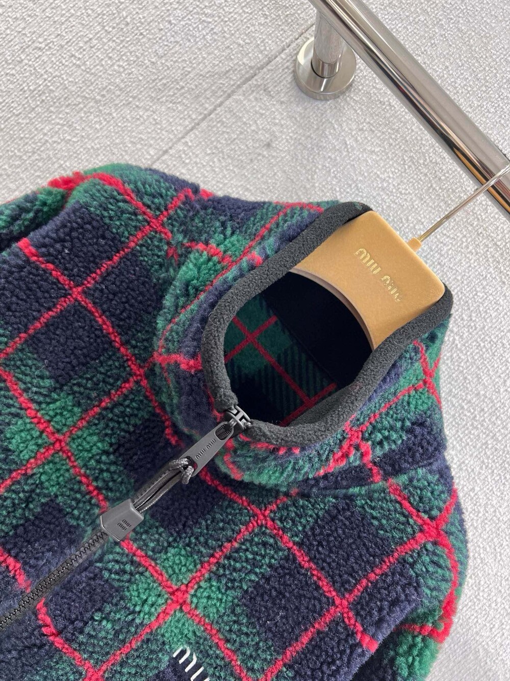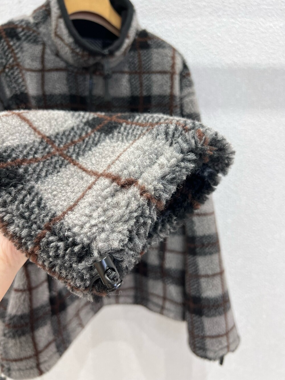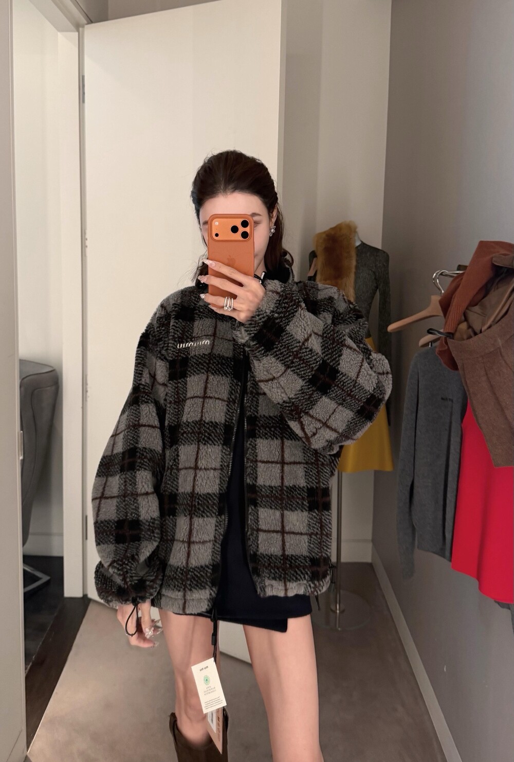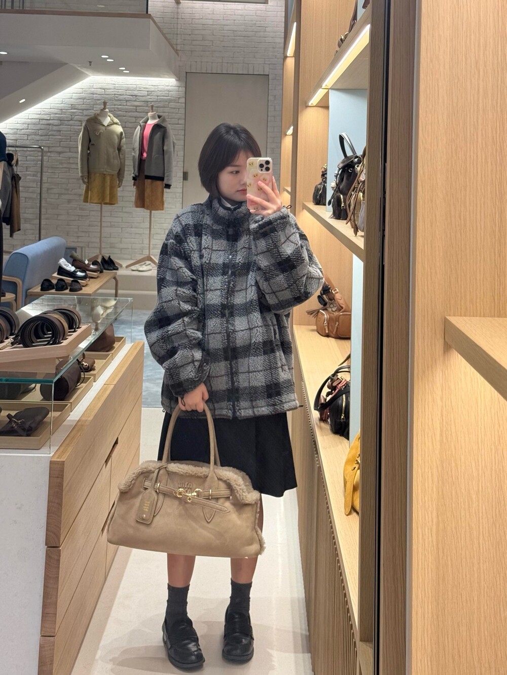 아이코닉한 플리스 재킷을 울 소재로 볼륨감과 부드러움을 더한 테디 버전으로 재해석했습니다. 클래식한 체크 패턴은 남성복에서 영감을 받아 스포티한 페미니티를 미우미우만의 감각으로 표현합니다.