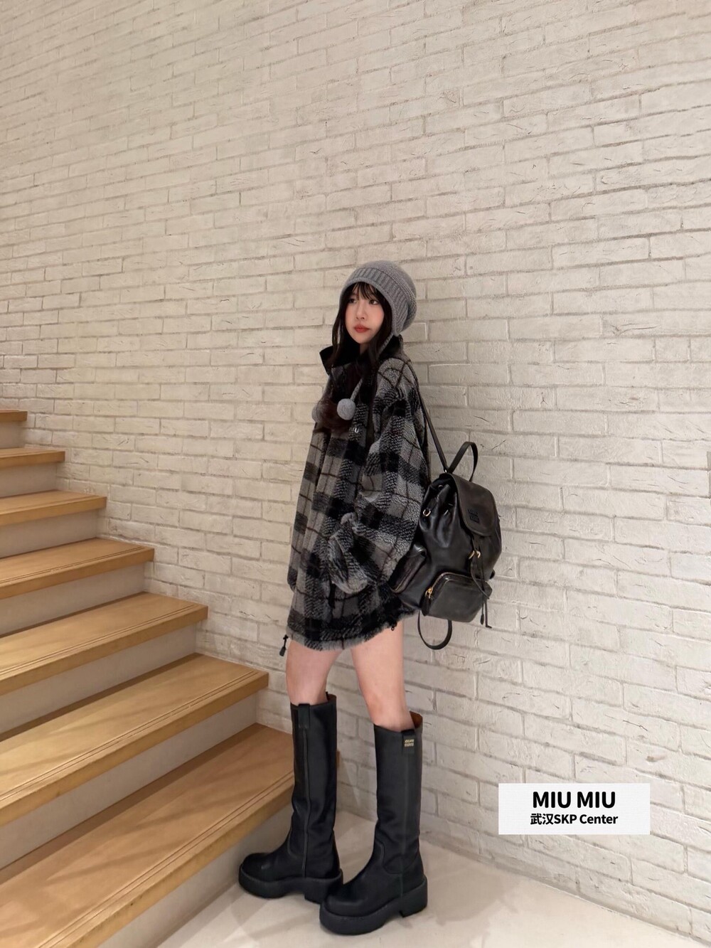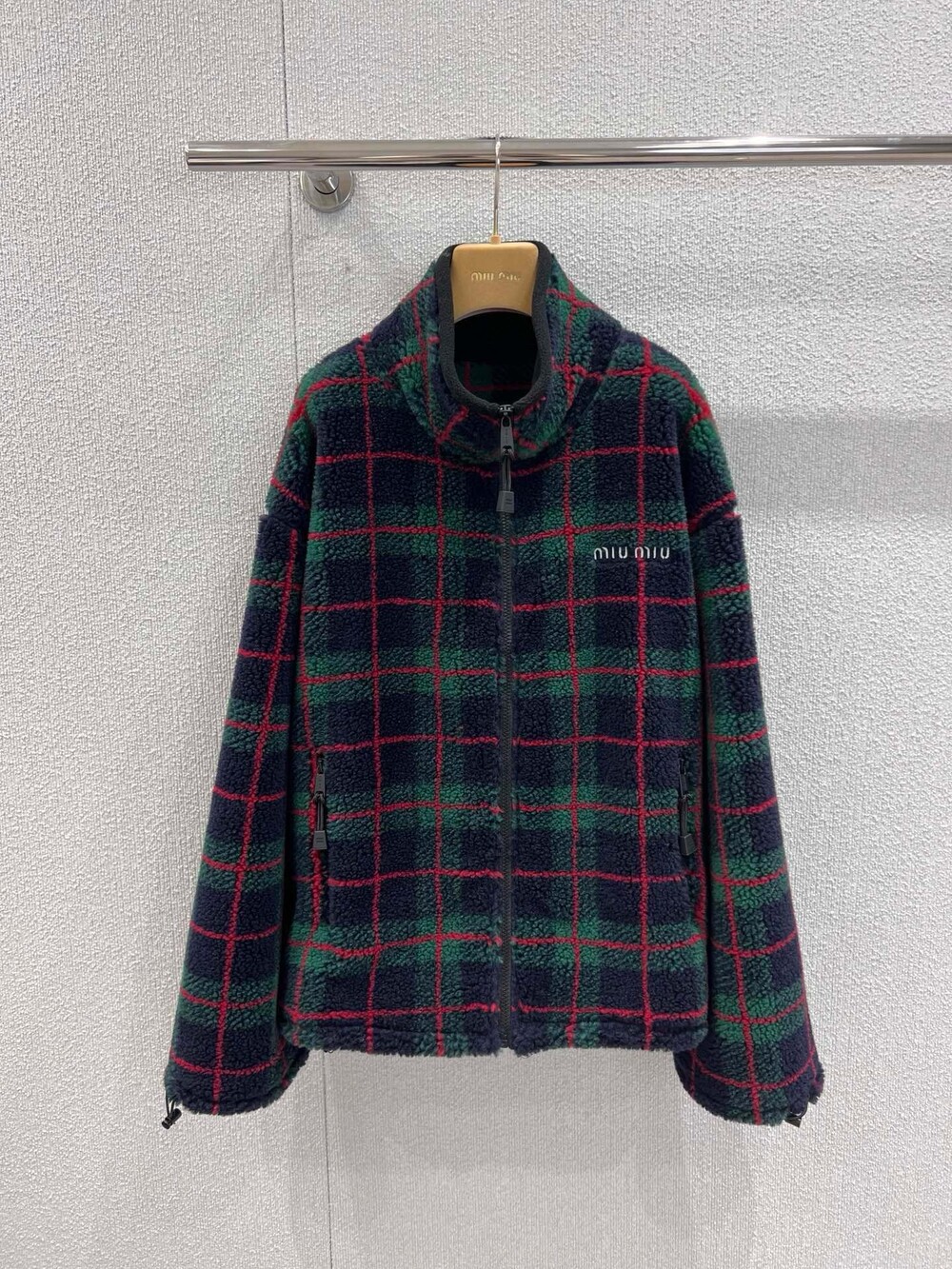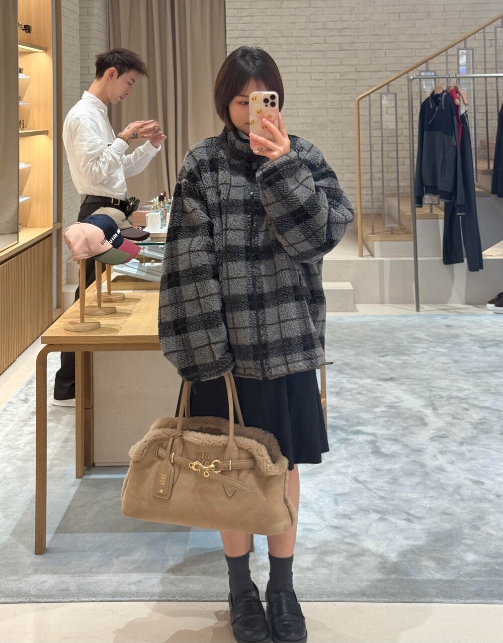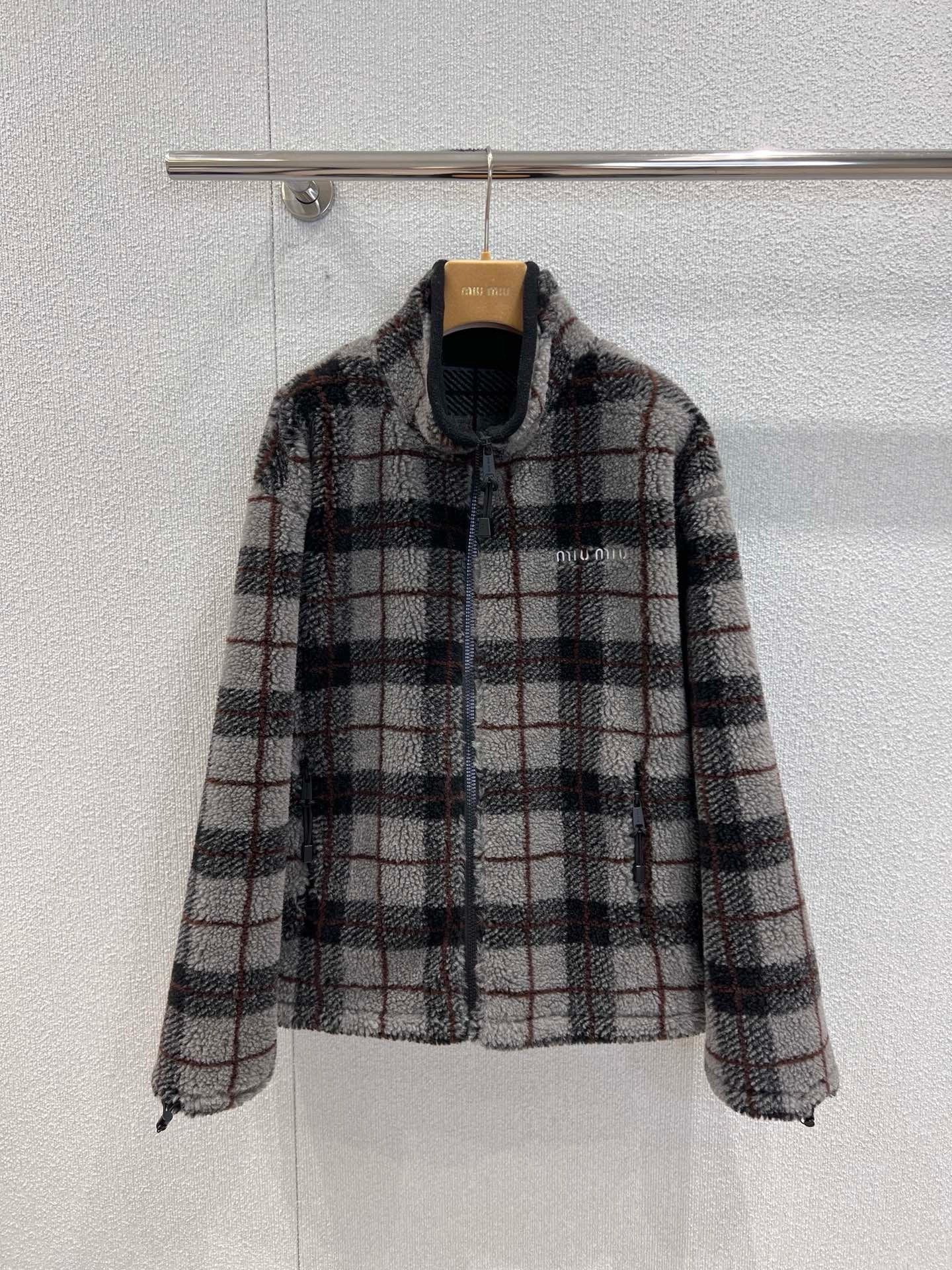 아이코닉한 플리스 재킷을 울 소재로 볼륨감과 부드러움을 더한 테디 버전으로 재해석했습니다. 클래식한 체크 패턴은 남성복에서 영감을 받아 스포티한 페미니티를 미우미우만의 감각으로 표현합니다.