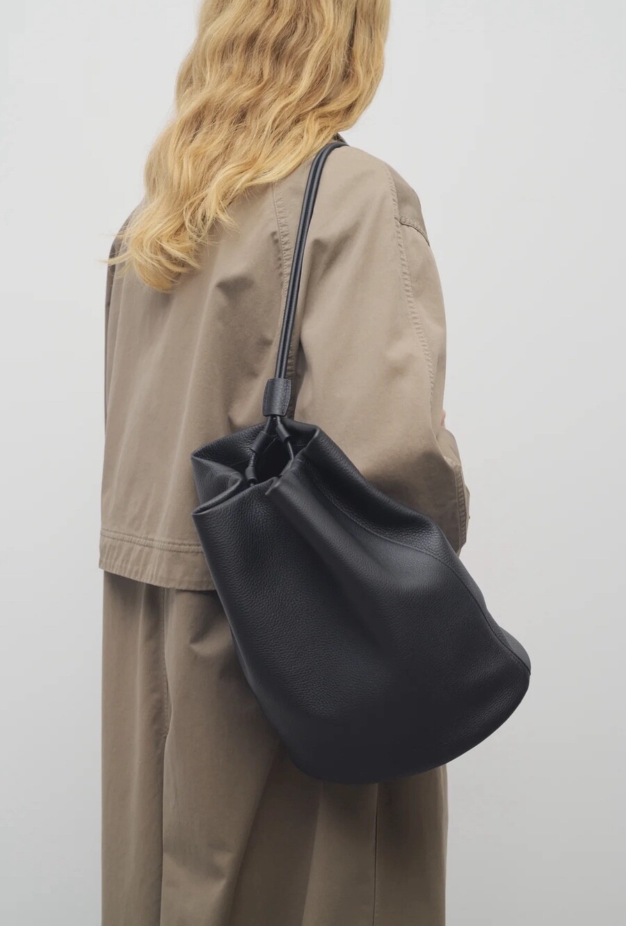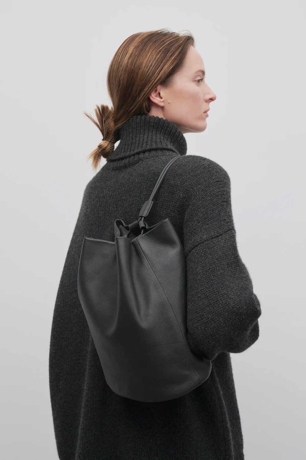 견고한 디어스킨 가죽 소재의 미니멀 백팩으로 드로스트링 클로저와 핸드메이드 숄더 스트랩이 특징입니다.