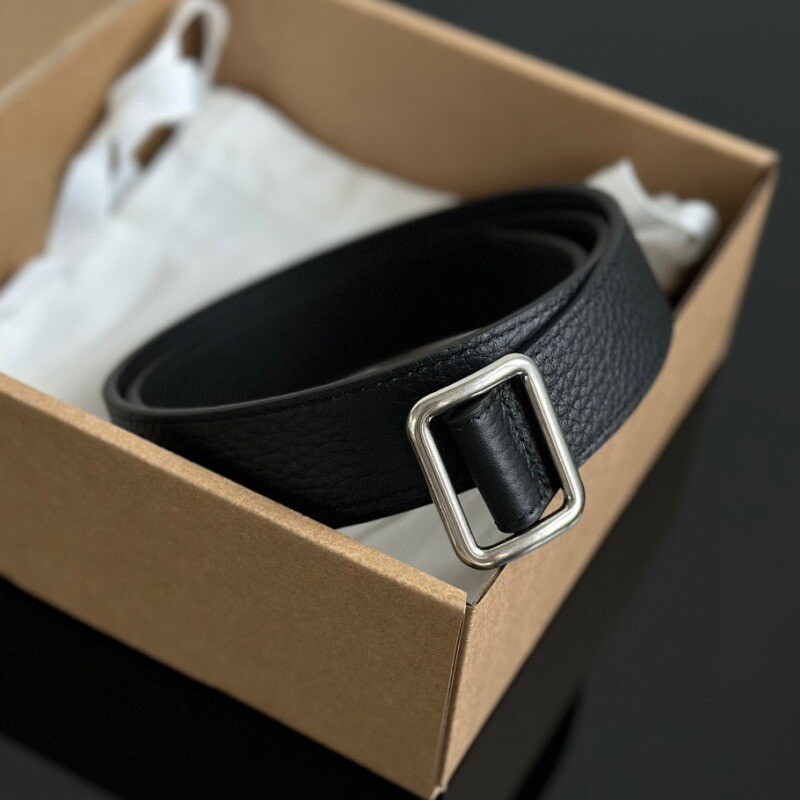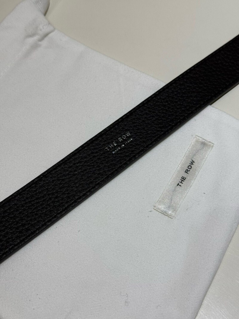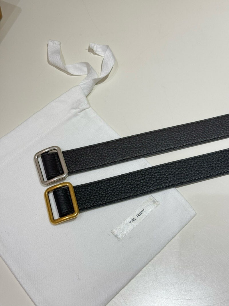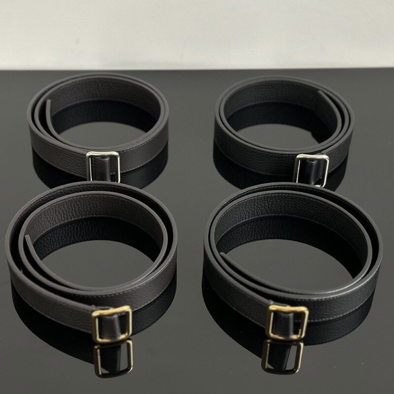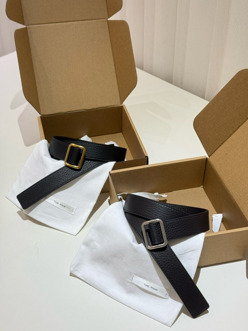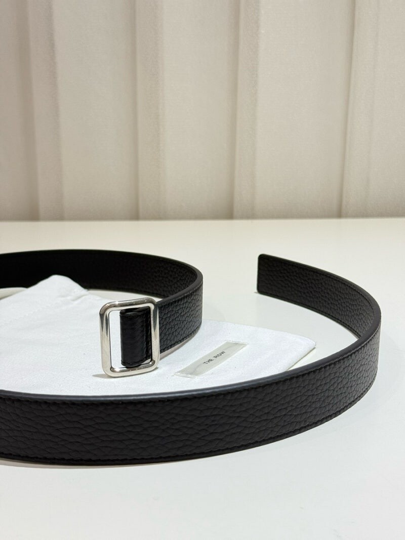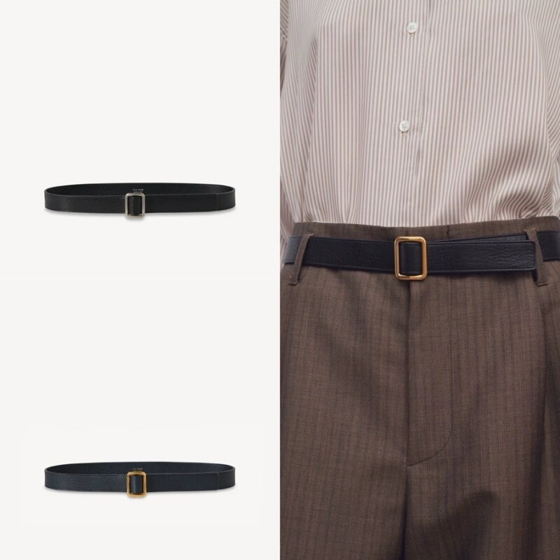 메탈 버클이 달린 베지터블 그레인 카프스킨 가죽 소재의 미니멀 벨트