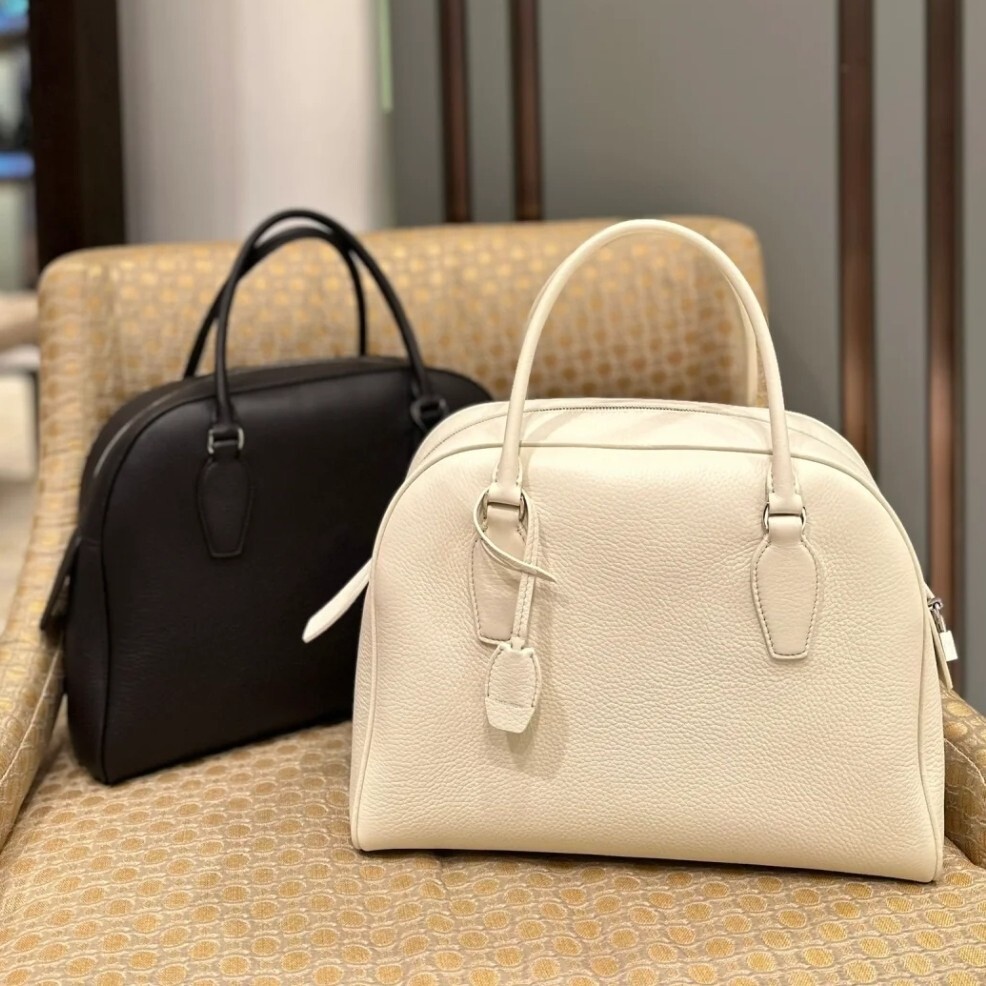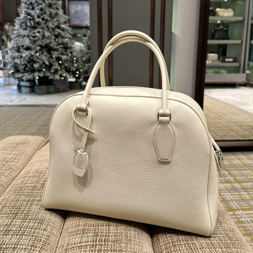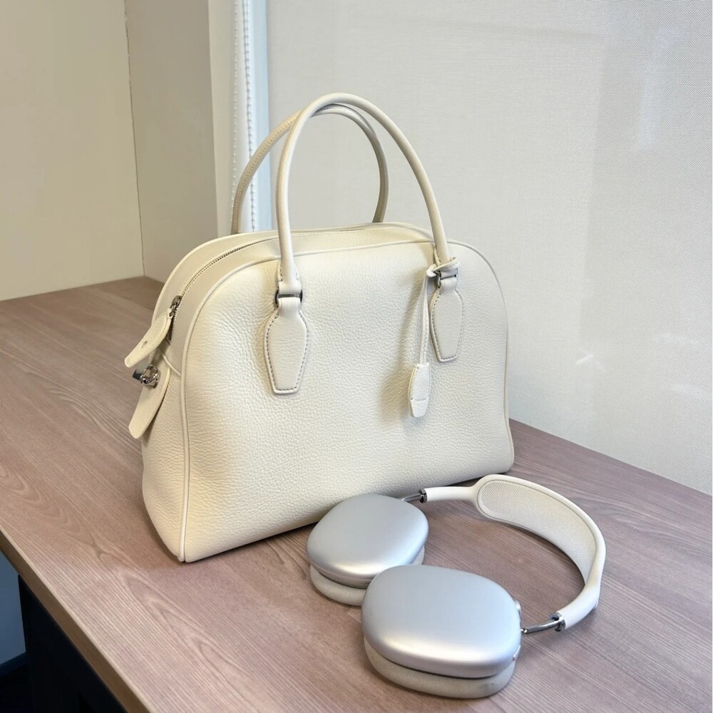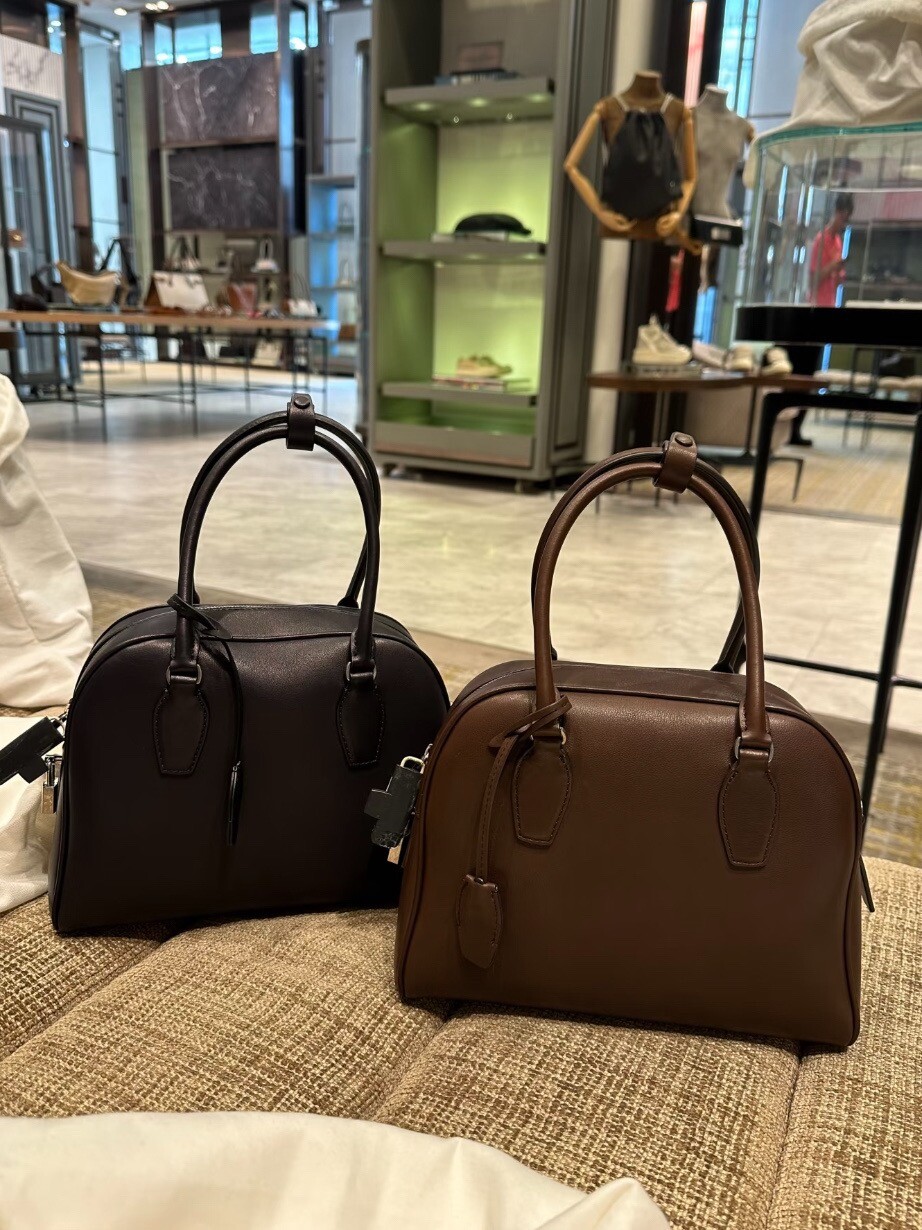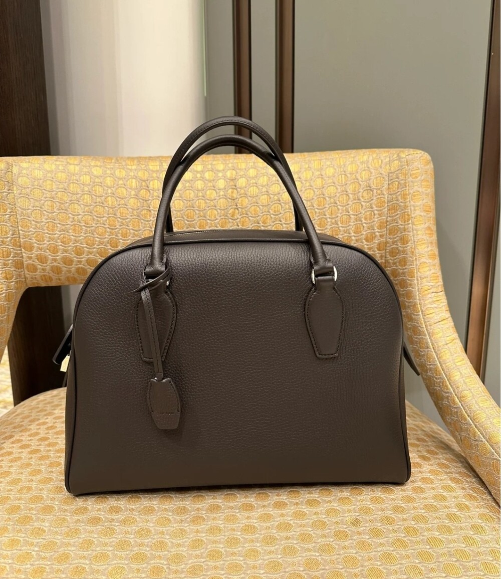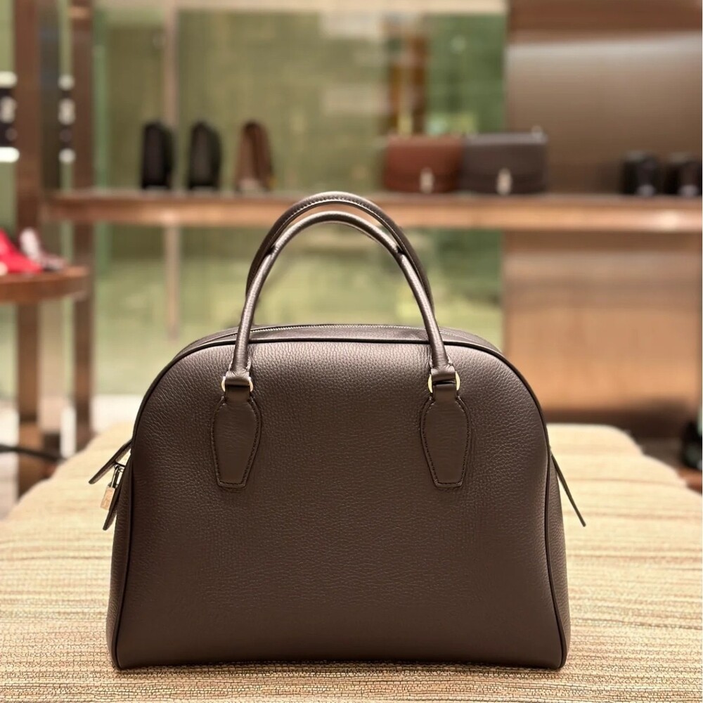 새들 가죽 소재의 업데이티드 볼링 백으로, 튜브형 핸들, 로고 디테일의 금속 자물쇠와 열쇠, 지퍼 클로저가 특징입니다.