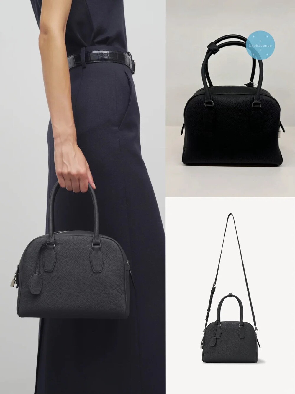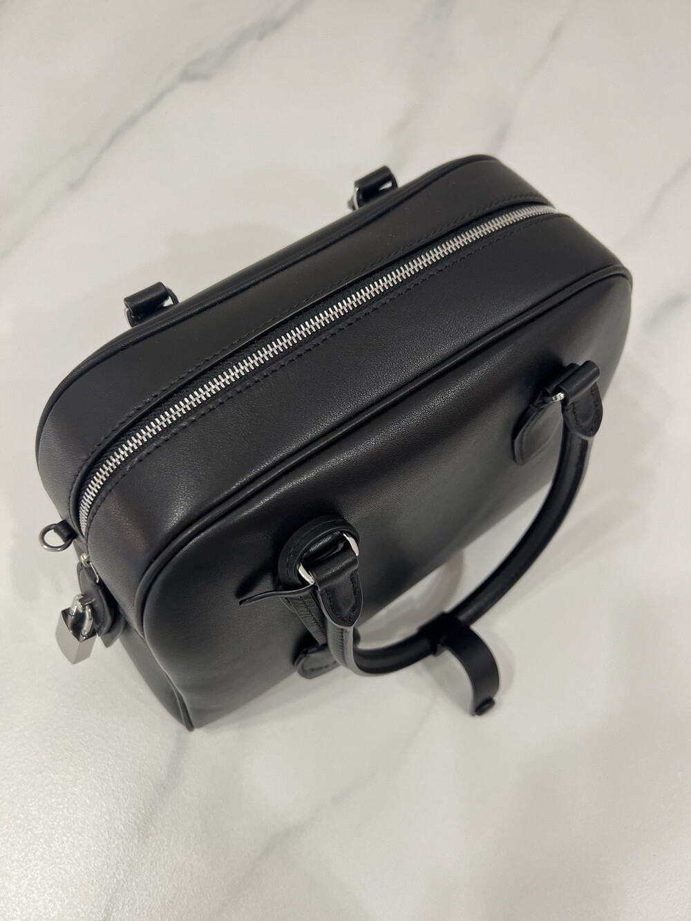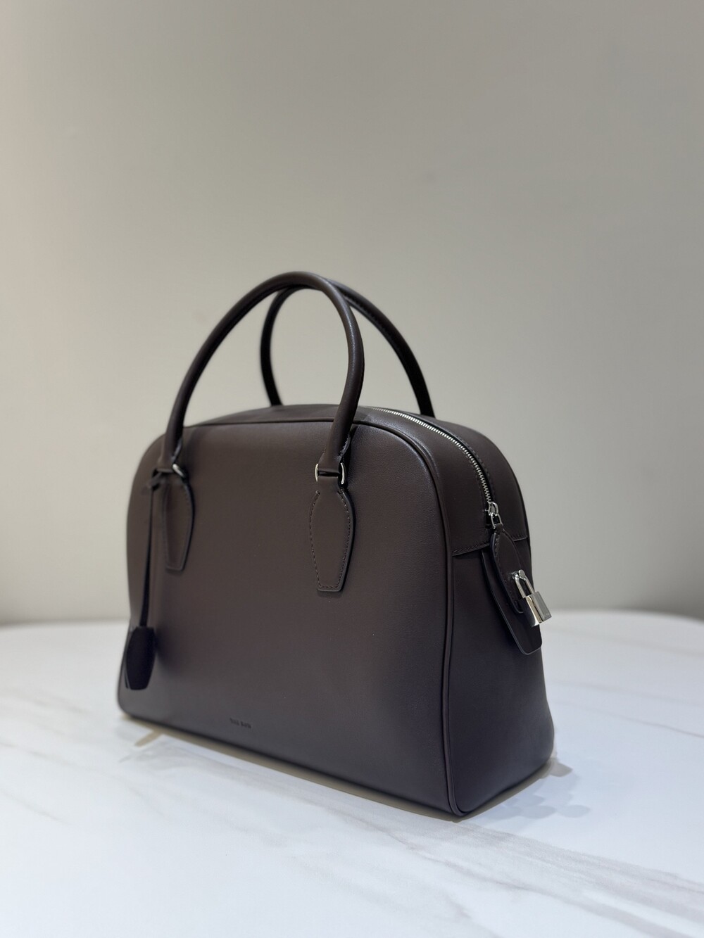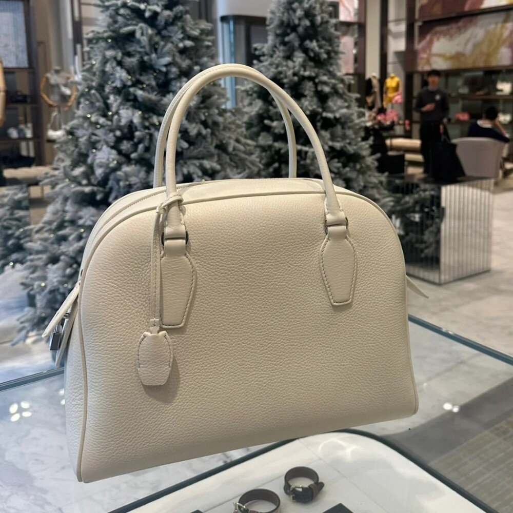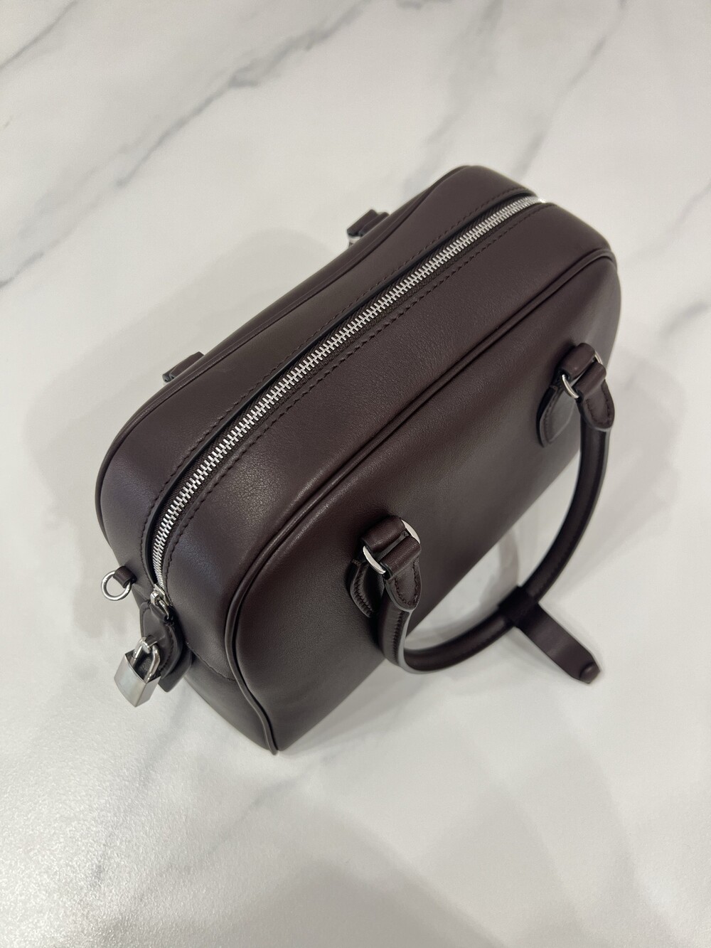 새들 가죽 소재의 업데이티드 볼링 백으로, 튜브형 핸들, 로고 디테일의 금속 자물쇠와 열쇠, 지퍼 클로저가 특징입니다.