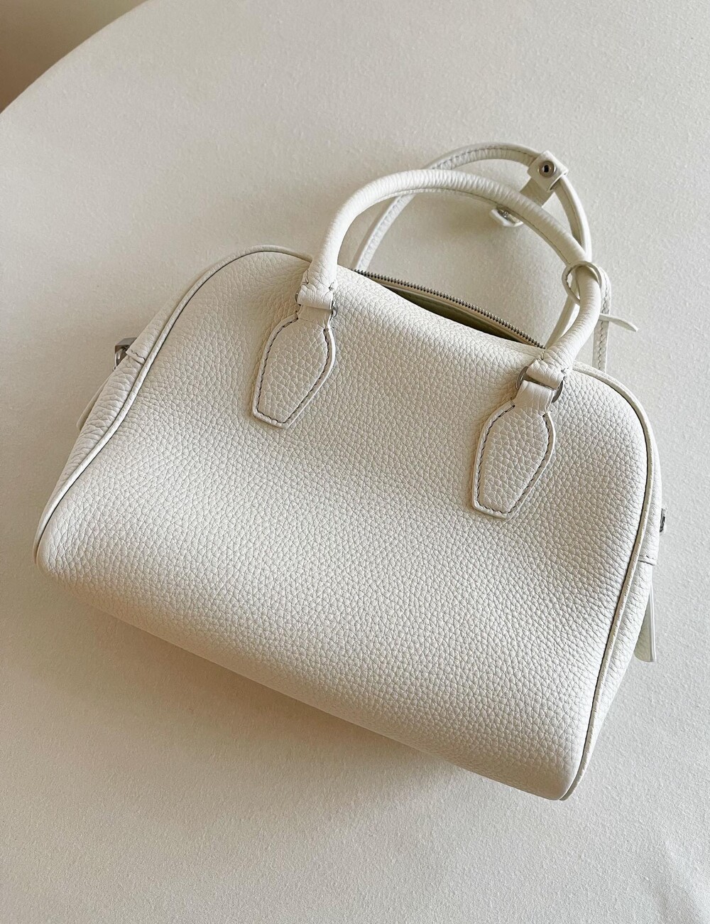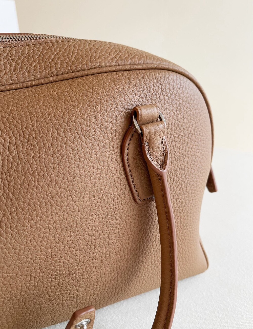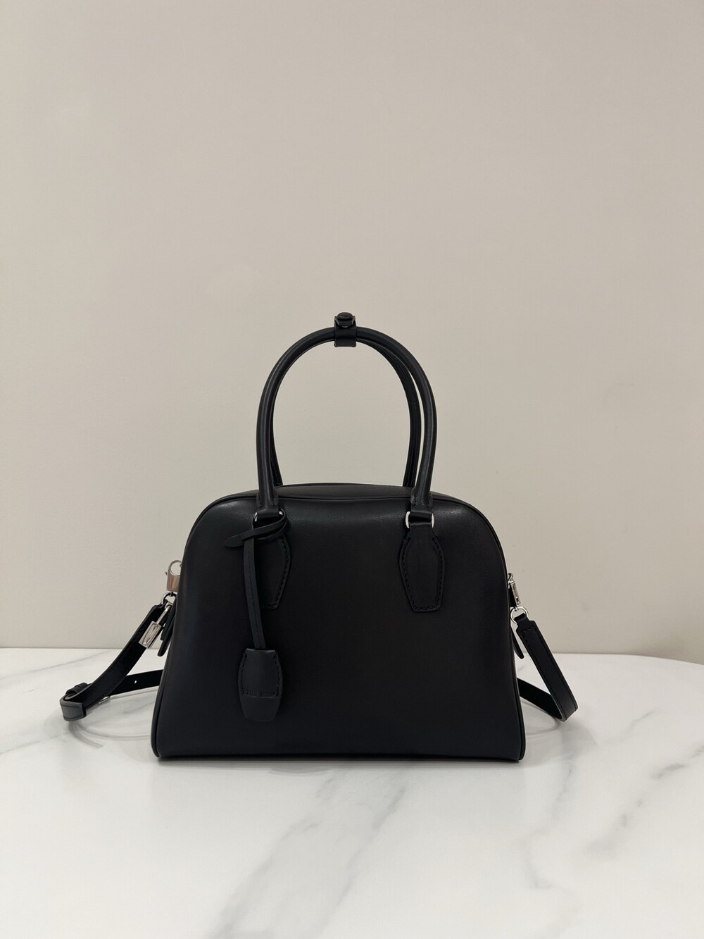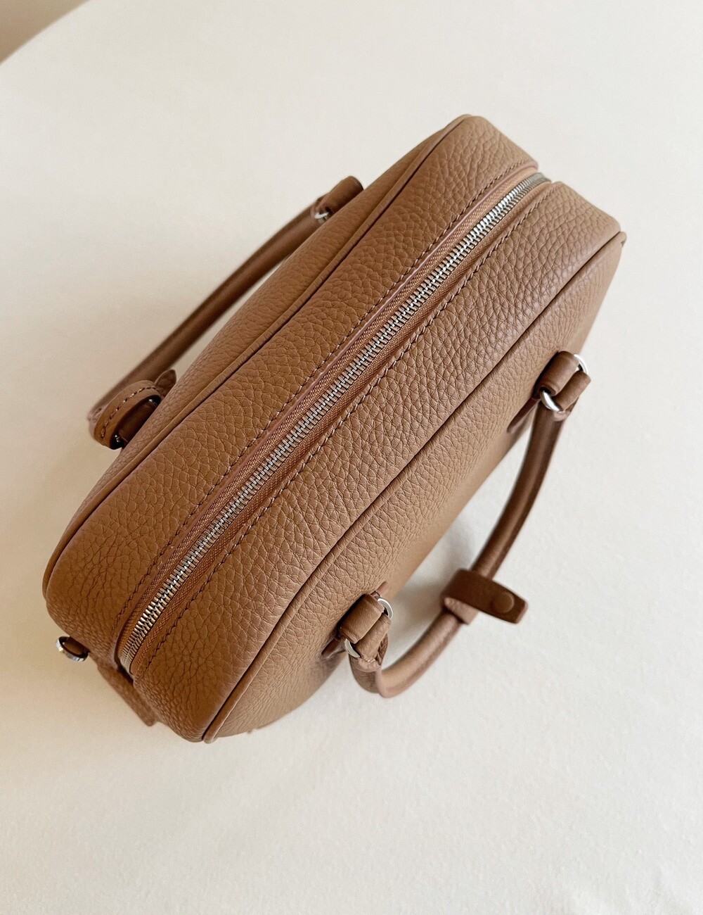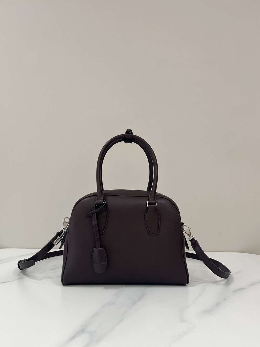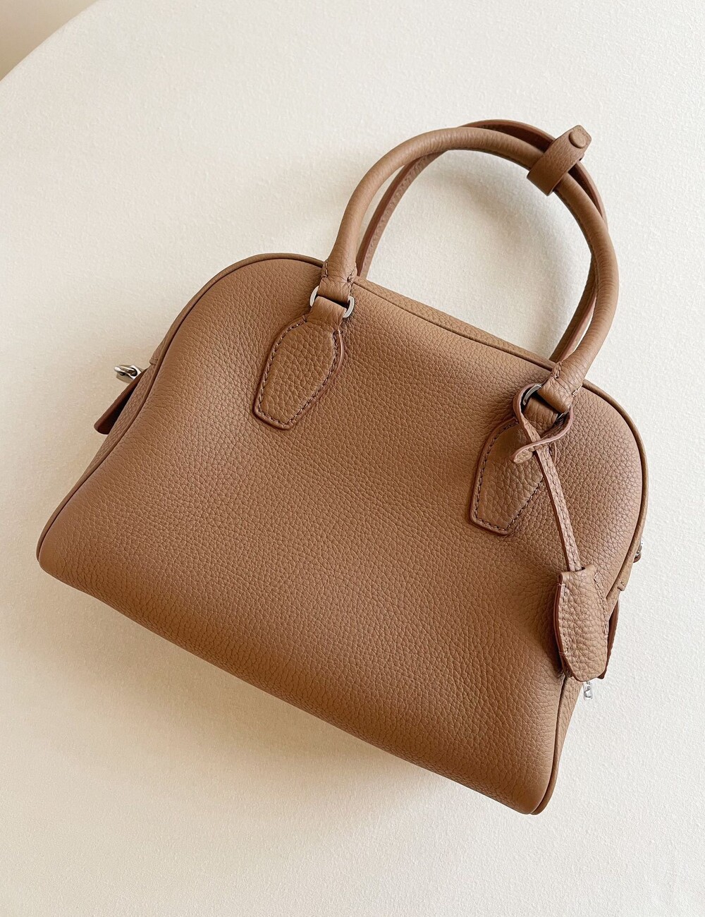 새들 가죽 소재의 업데이티드 볼링 백으로, 튜브형 핸들, 로고 디테일의 금속 자물쇠와 열쇠, 지퍼 클로저가 특징입니다.