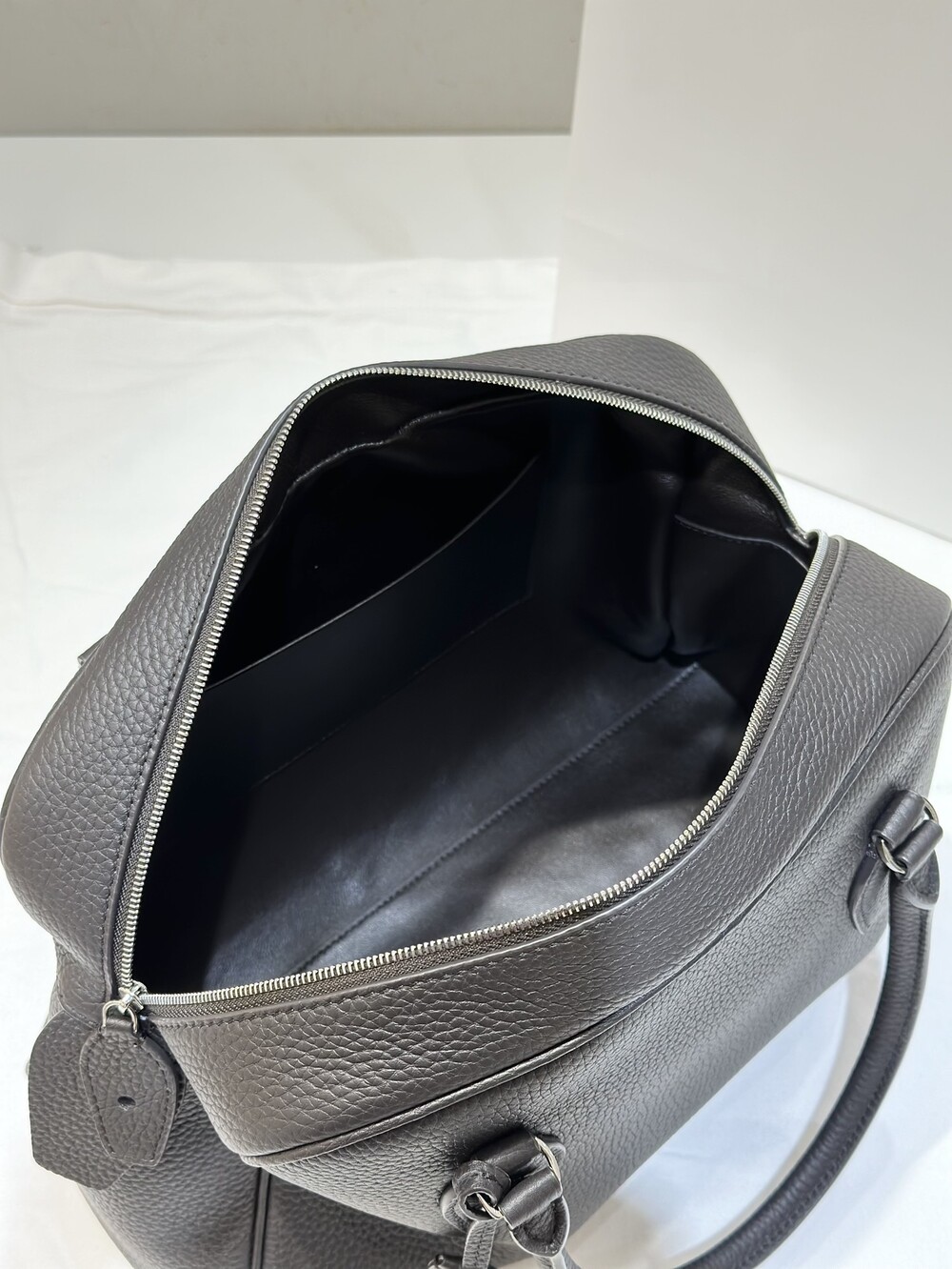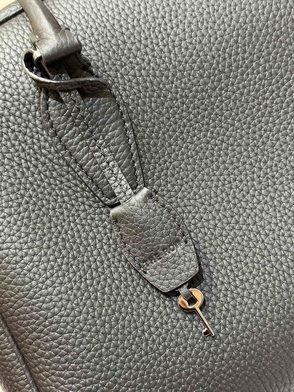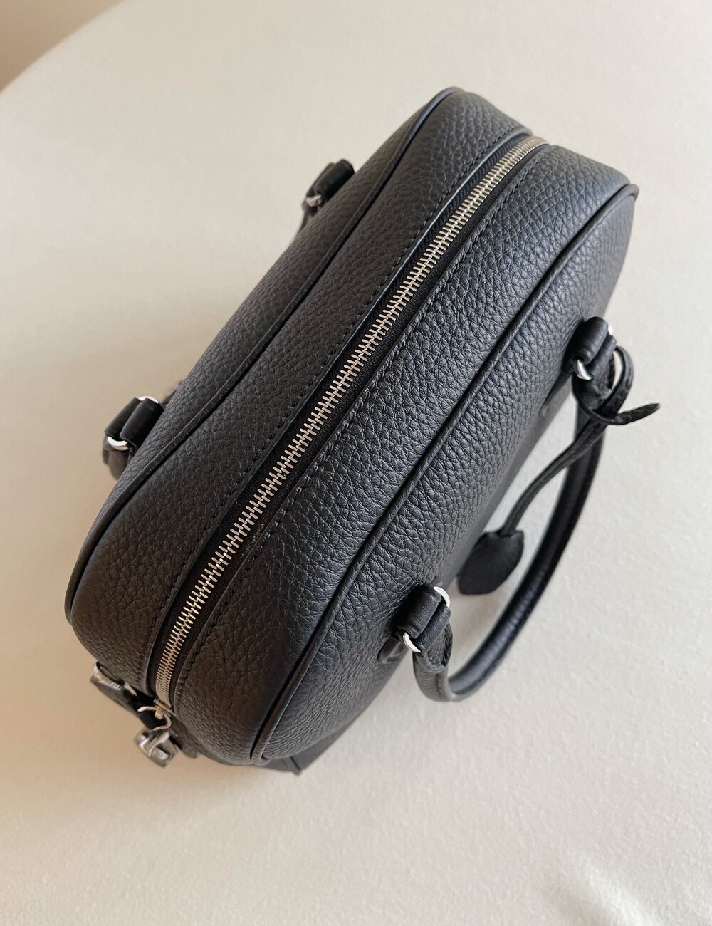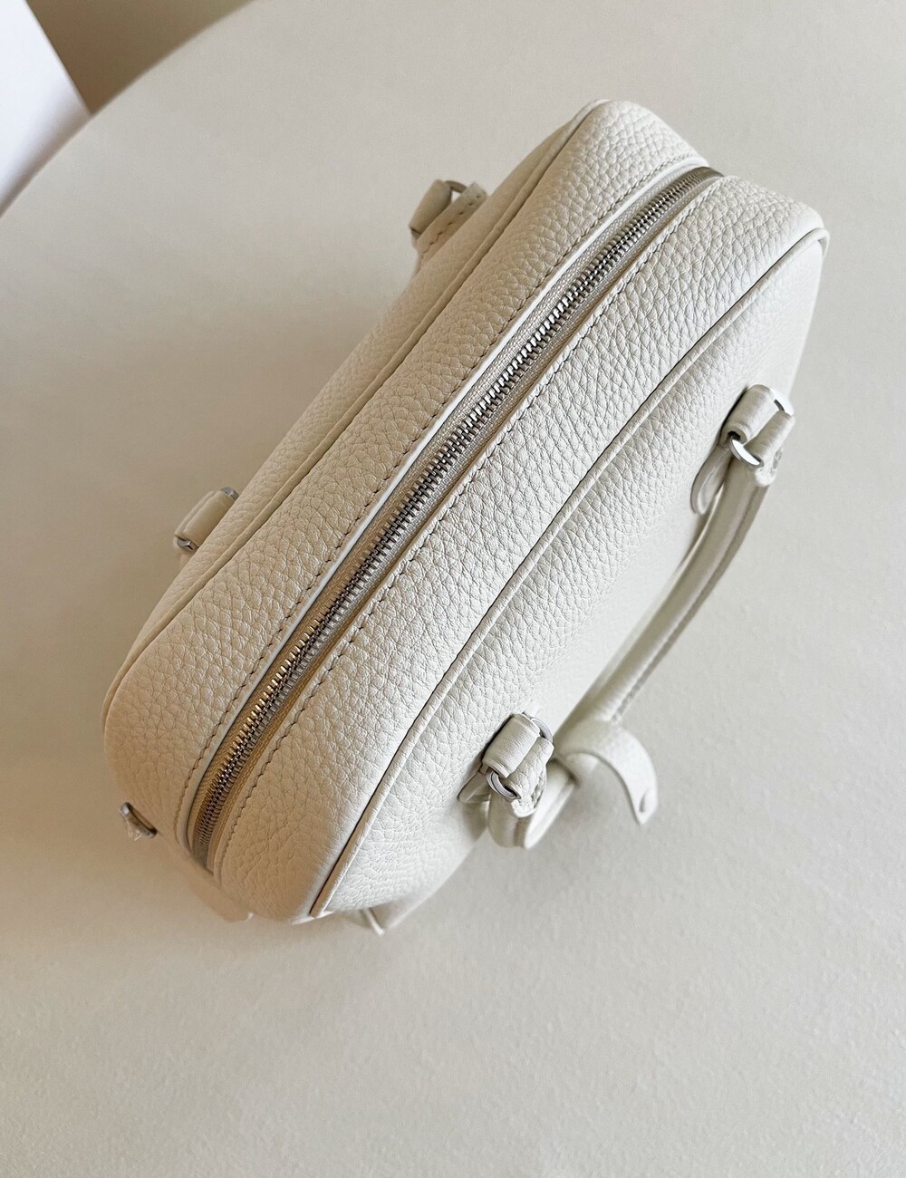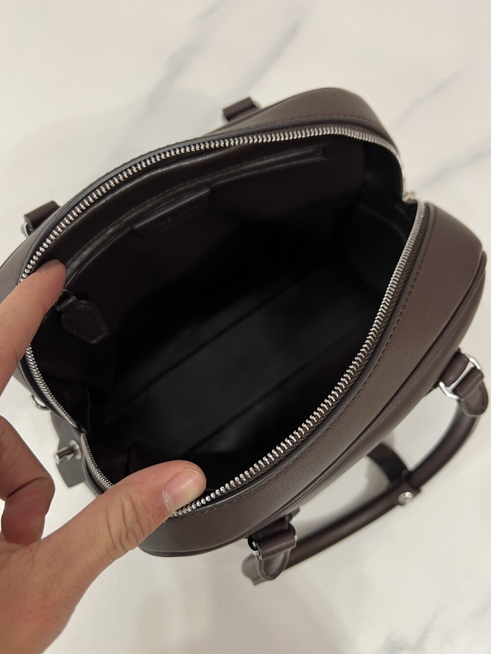 새들 가죽 소재의 업데이티드 볼링 백으로, 튜브형 핸들, 로고 디테일의 금속 자물쇠와 열쇠, 지퍼 클로저가 특징입니다.