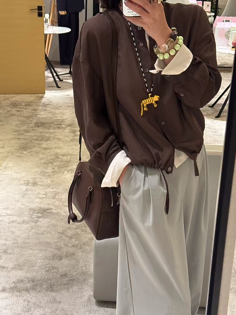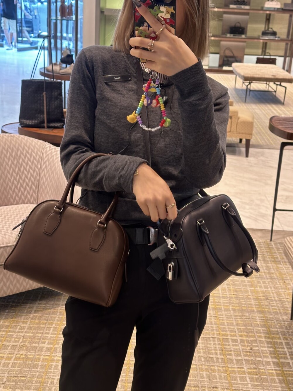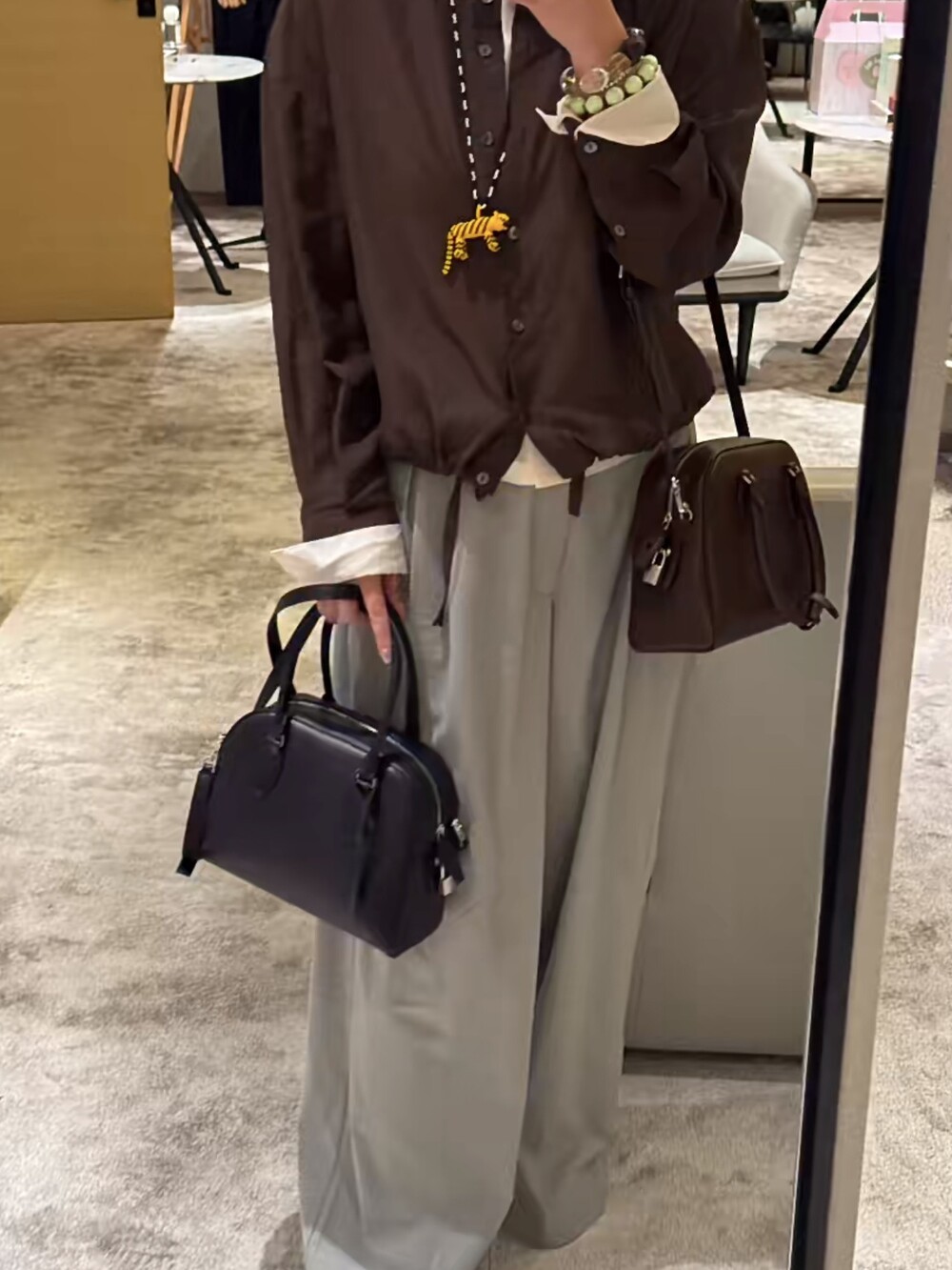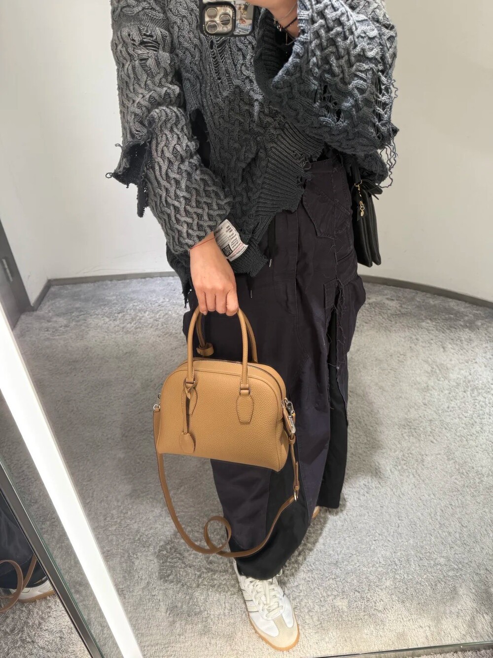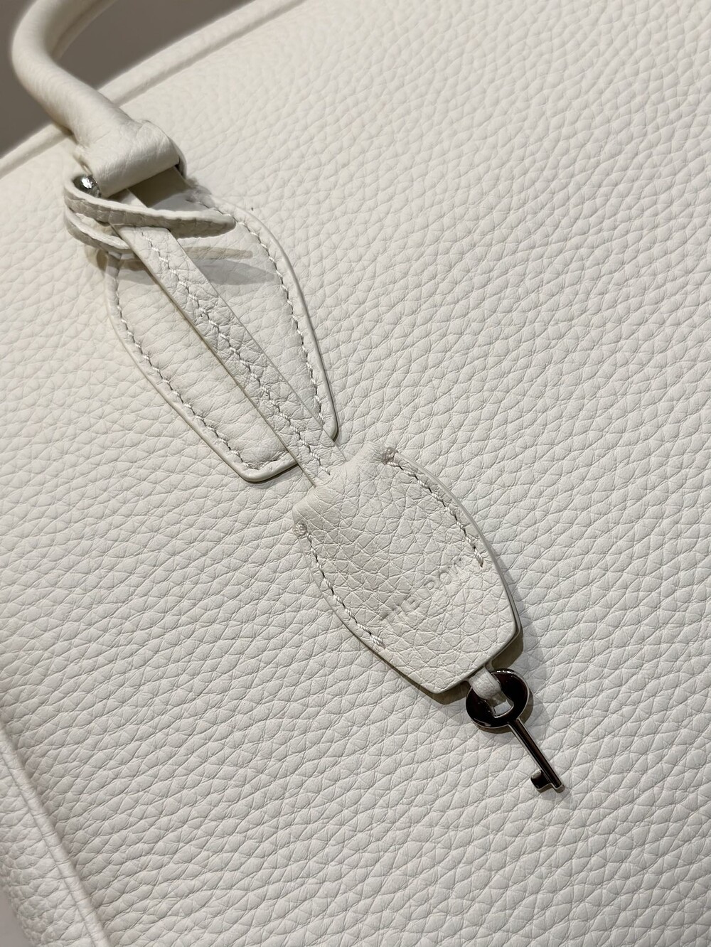 새들 가죽 소재의 업데이티드 볼링 백으로, 튜브형 핸들, 로고 디테일의 금속 자물쇠와 열쇠, 지퍼 클로저가 특징입니다.