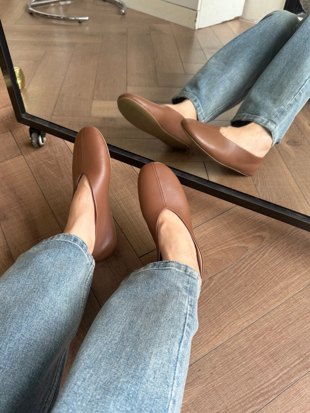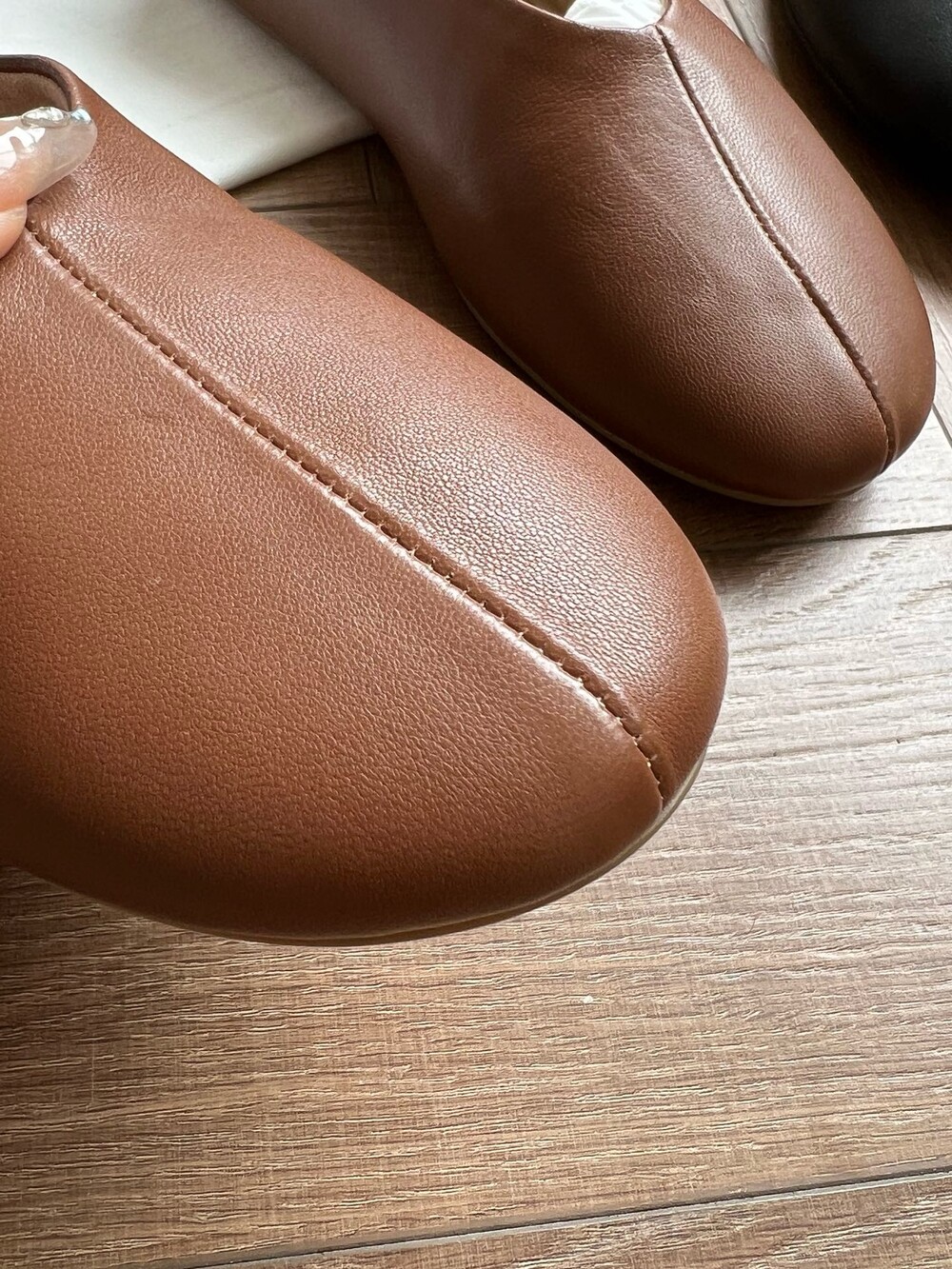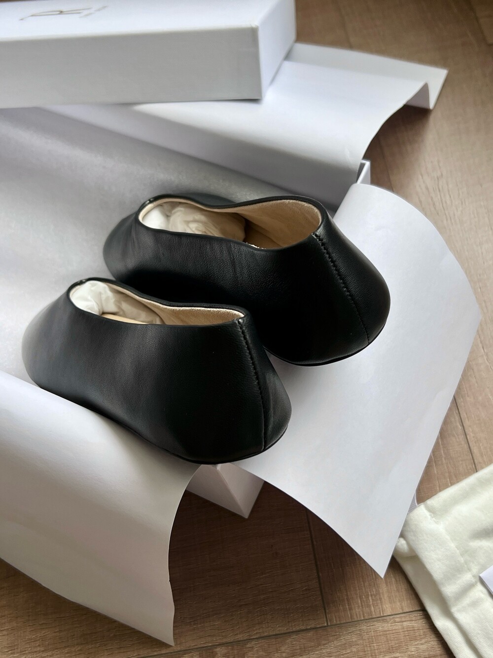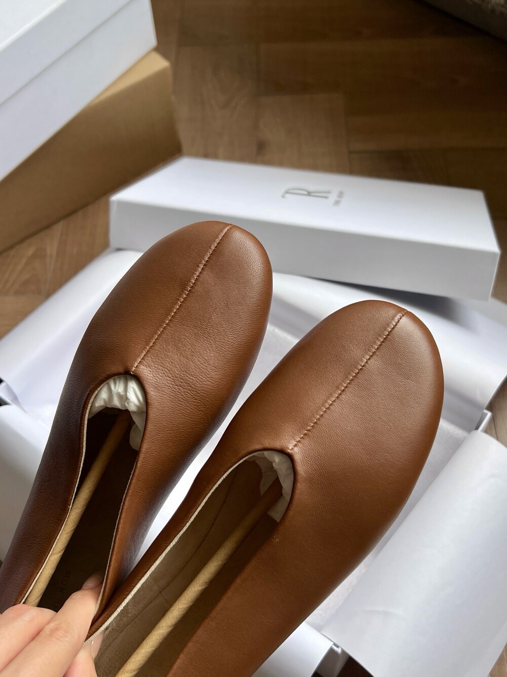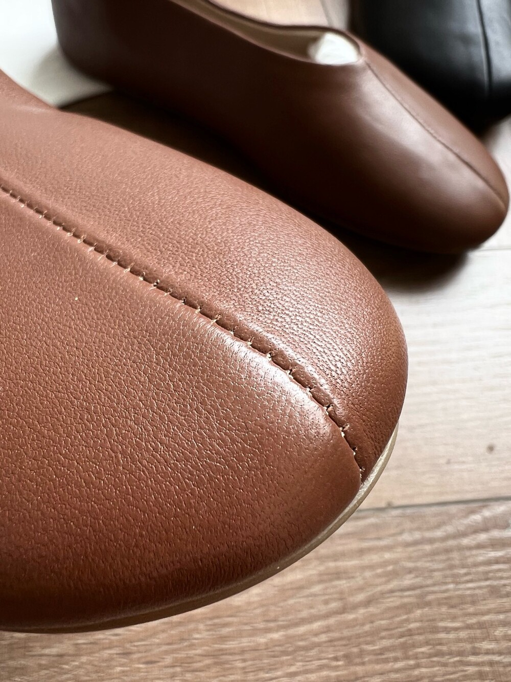 부드러운 나파 가죽 소재의 슬립온 슈즈로 타원형 토, 앞면 중앙 솔기와 유연한 고무 코팅 밑창이 특징입니다.