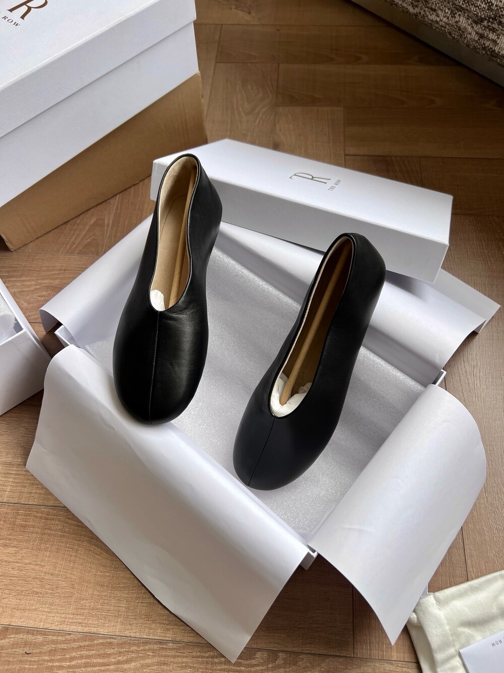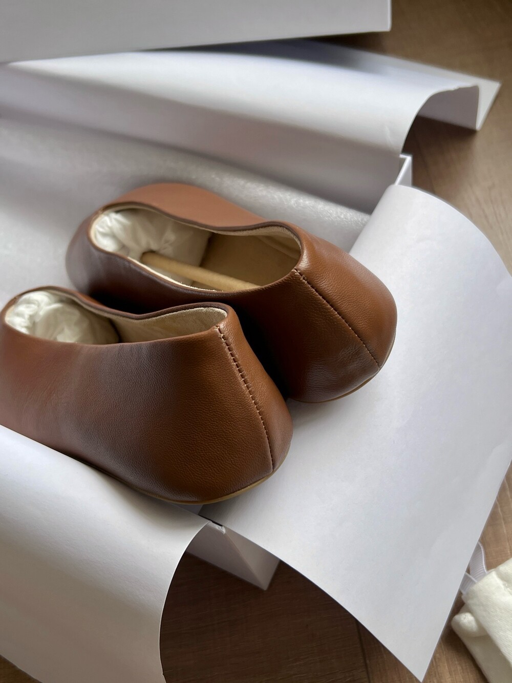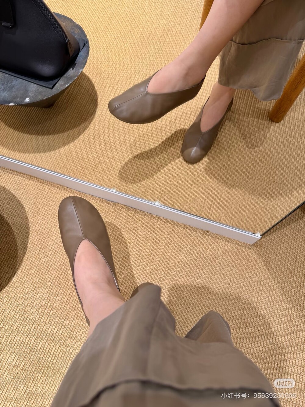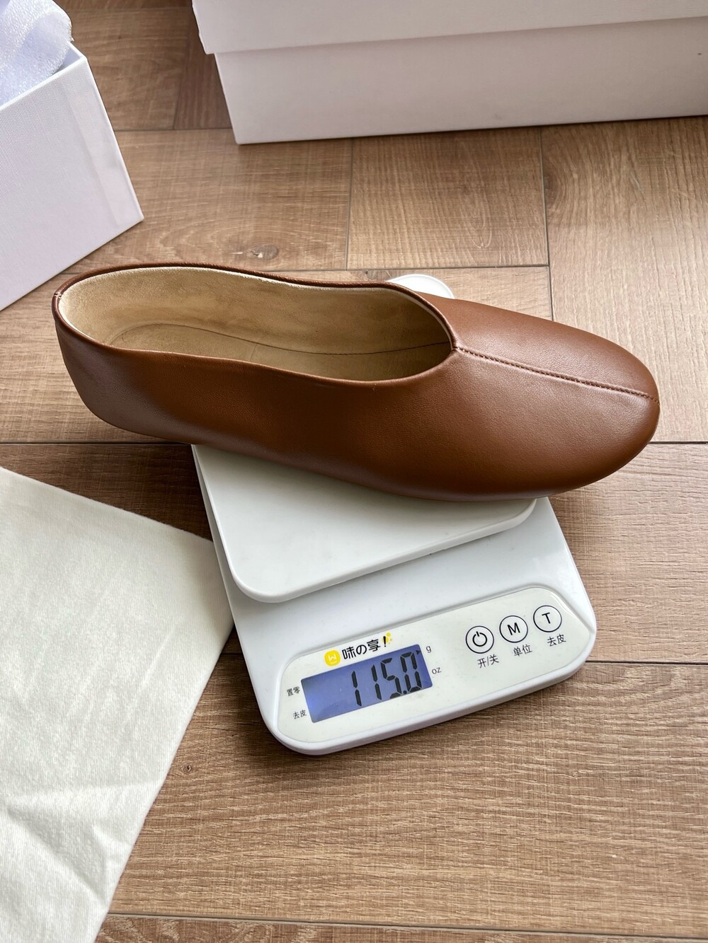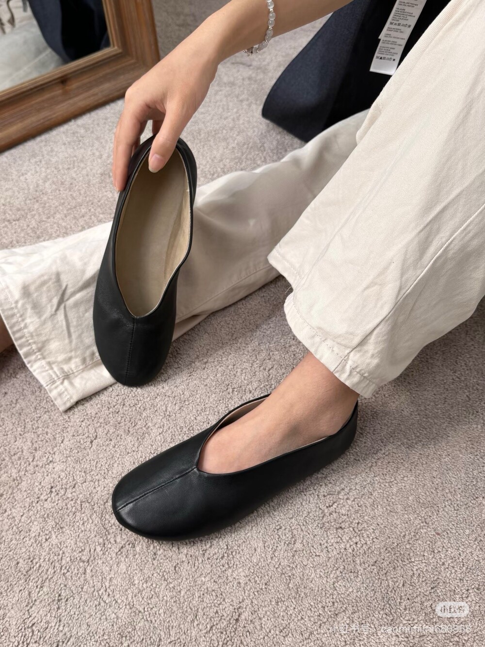 부드러운 나파 가죽 소재의 슬립온 슈즈로 타원형 토, 앞면 중앙 솔기와 유연한 고무 코팅 밑창이 특징입니다.