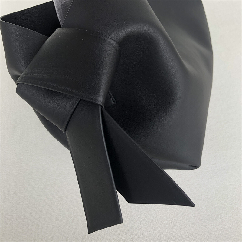 부드러운 가죽으로 제작한 미디 토트백입니다. 일본 전통 의복의 오비 띠에서 영감을 받은 무수비 매듭을 양쪽에 더했습니다.
