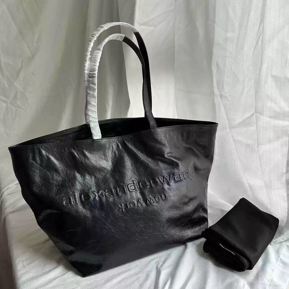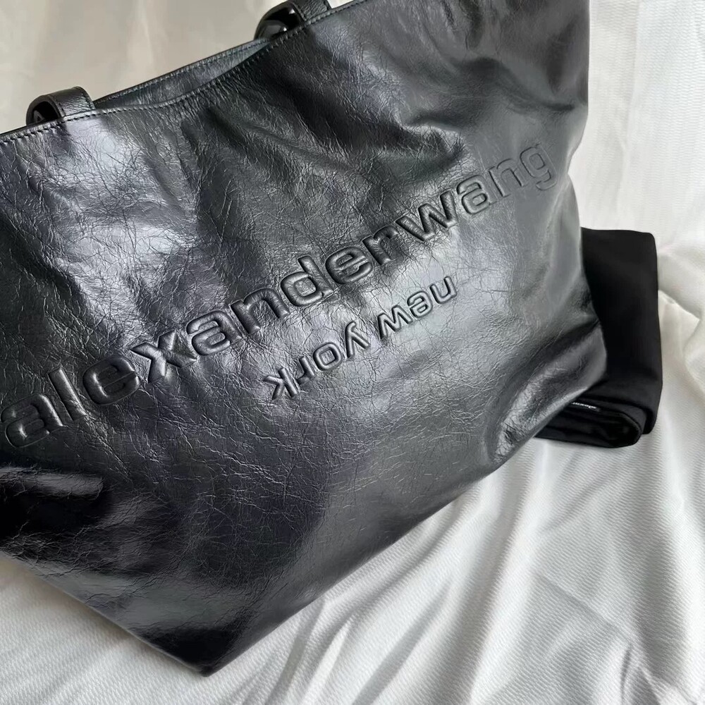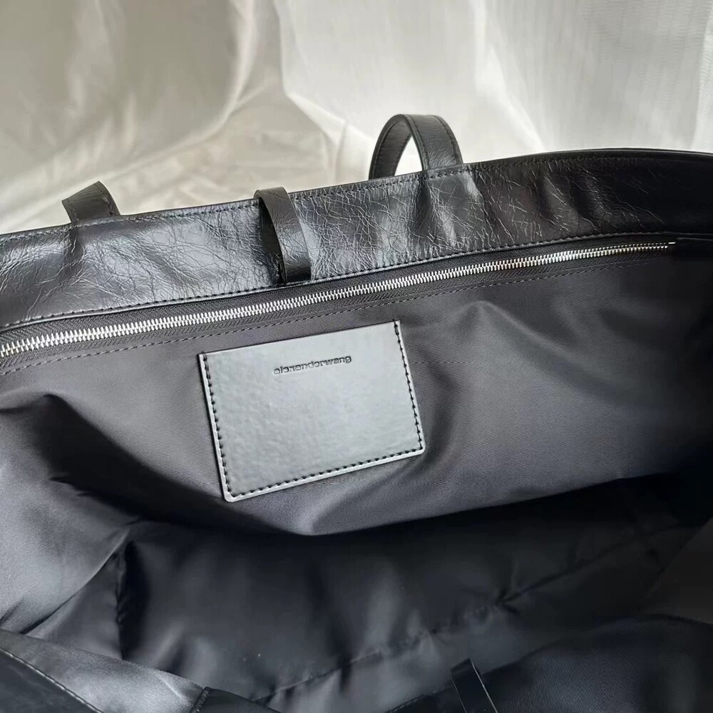 길이 잘 든 룩과 느낌의 크래클 페이턴트 가죽 소재 라지 사이즈 가죽 백, 앞면 중앙의 볼록한 토널 "alexander wang" 로고 디테일. 노트북을 넣을 수 있는 사이즈의 내부 백월 포켓, 2개의 라지 사이즈 핸들, 내부 상단의 타이 여밈.